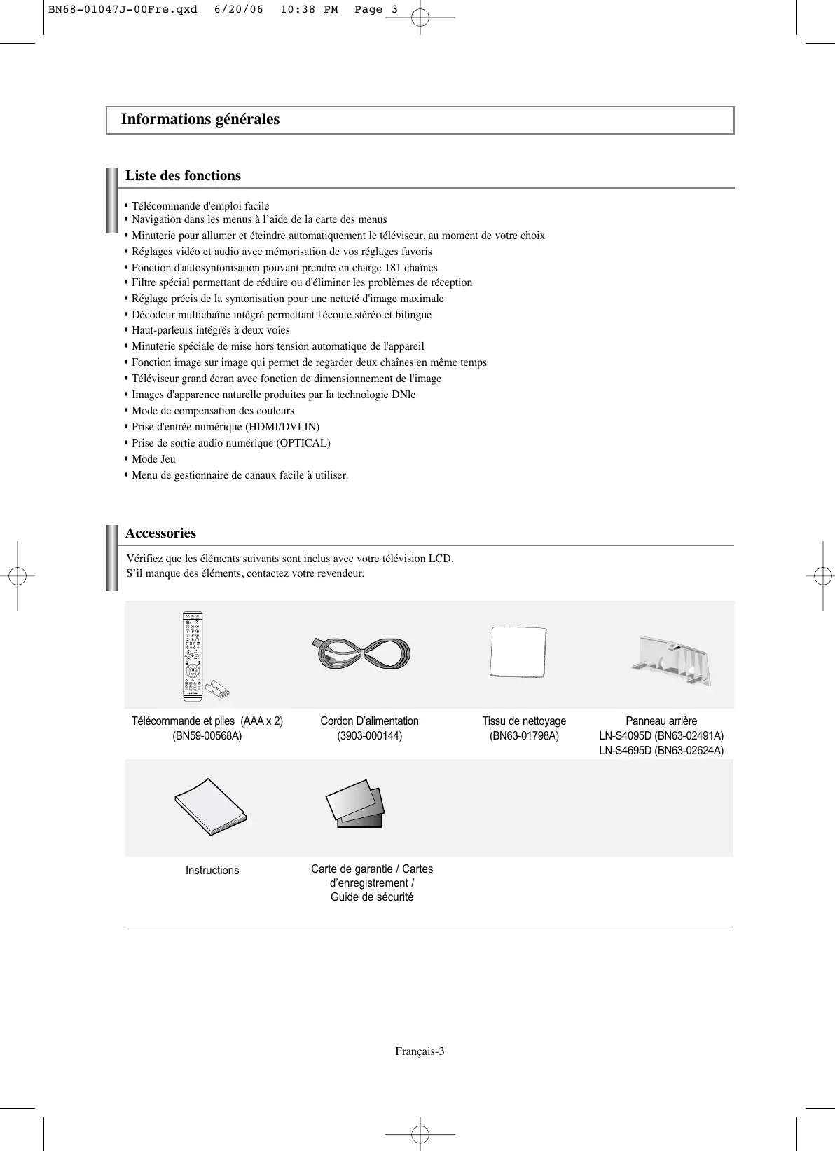 Français Liste des fonctions ............................................................................. Accessories........................................................................................ Présentation du panneau de commande........................................... Présentation du panneau de branchement........................................ Télécommande .................................................................................. Insertion des piles dans la télécommande ........................................ BN68-01047J-00Fre.qxd 6/20/06 10:38 PM Page 2 Utilisation de votre télévision comme un écran PC...................... Modes d’affichage ....................................................................... Réglage de la qualité de l’image .................................................. Déplacement de l’image ............................................................... Réglage automatique de la qualité et de la position de l’image... Redimensionnement de l’image (mode PC) ................................ Affichage de la résolution actuelle................................................ Initialisation des réglages de l’image............................................ Symboles Appuyer