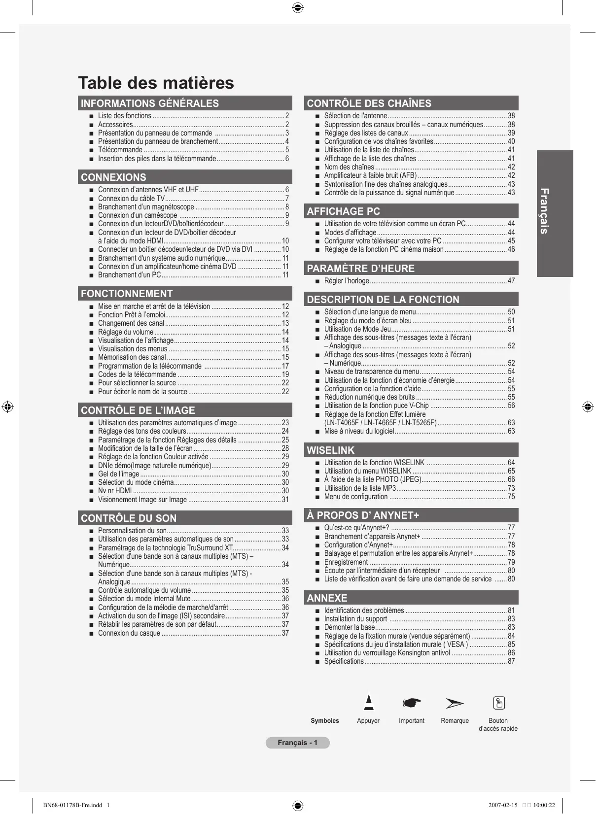 • L’affichage d’images fixes de jeux vidéo et d’ordinateurs pendant plus longtemps qu’une période spécifique peut provoquer des rémanences.Pour éviter cela, réduisez la “luminosité” et le “contraste” lors de l’affichage d’images fixes. © 2007 Samsung Electronics Co., Ltd. All rights reserved. Still.indd 1 2007-02-15 9:40:25 English Contents General Information