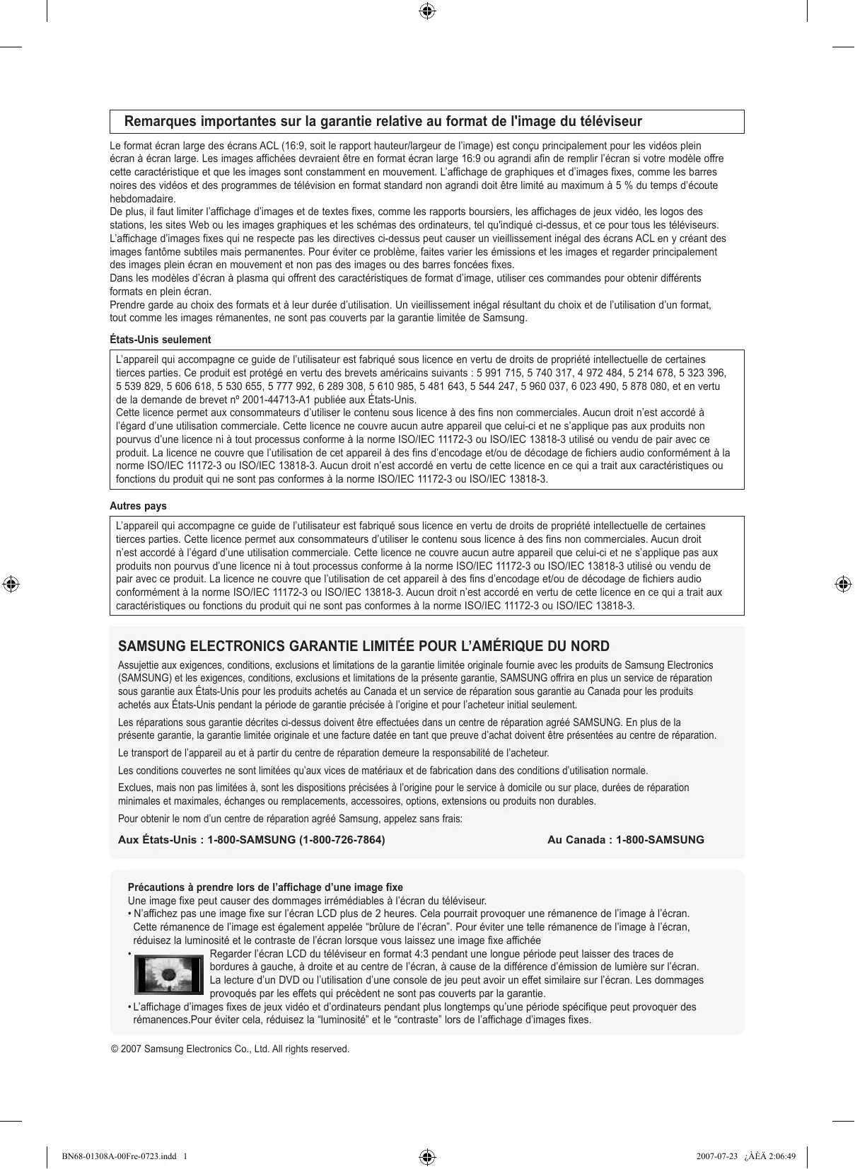 - L’affichage d’images fixes de jeux vidéo et d’ordinateurs pendant plus longtemps qu’une période spécifique peut provoquer des rémanences.Pour éviter cela, réduisez la “luminosité” et le “contraste” lors de l’affichage d’images fixes. © 2007 Samsung Electronics Co., Ltd. All rights reserved. BN68-01308A-00Fre-0723.indd 1 2007-07-23 ¿ÀÈÄ 2:06:49 Table des matières Informations générales