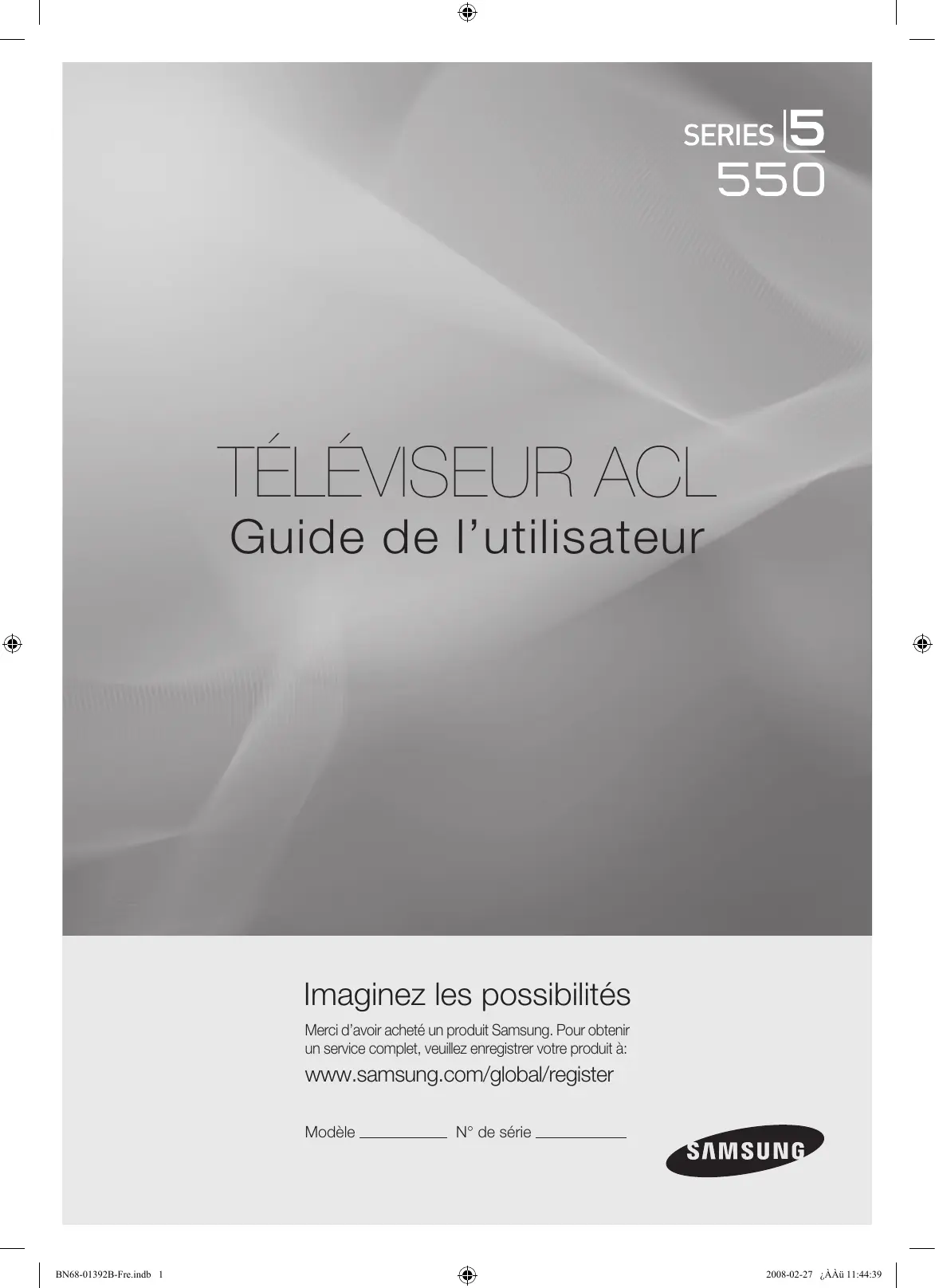Guide de l’utilisateur Imaginez les possibilités Merci d’avoir acheté un produit Samsung. Pour obtenir un service complet, veuillez enregistrer votre produit à: www.samsung.com/global/register Modèle BN68-01392B-Fre.indb 1 N° de série 2008-02-27 ¿ÀÀü 11:44:39 Remarques importantes sur la garantie relative au format de l’image du téléviseur Le format écran large des écrans ACL (16:9, soit le rapport hauteur/largeur de l’image) est conçu principalement pour les vidéos plein écran à écran large. Les images affichées devraient être en format écran large 16:9 ou agrandi afin de remplir l’écran si votre modèle offre cette caractéristique et que les images sont constamment en mouvement. L’affichage de graphiques et d’images fixes, comme les barres noires des vidéos et des programmes de télévision en format standard non agrandi doit être limité au maximum à 5 % du temps d’écoute hebdomadaire. De plus, il faut limiter l’affichage d’images et de textes fixes, comme les rapports boursiers, les affichages de jeux vidéo, les logos des stations, les sites Web ou les images graphiques et les schémas des ordinateurs, tel qu’indiqué ci-dessus, et ce pour tous les téléviseurs. L’affichage d’images fixes qui ne respecte pas les directives ci-dessus peut causer un vieillissement inégal des écrans ACL en y créant des images fantôme subtiles mais permanentes. Pour éviter ce problème, faites varier les émissions et les images et regarder principalement des images plein écran en mouvement et non pas des images ou des barres foncées fixes. Dans les modèles d’écran à plasma qui offrent des caractéristiques de format d’image, utiliser ces commandes pour obtenir différents formats en plein écran. Prendre garde au choix des formats et à leur durée d’utilisation. Un vieillissement inégal résultant du choix et de l’utilisation d’un format, tout comme les images rémanentes, ne sont pas couverts par la garantie limitée de Samsung. États-Unis seulement L’appareil qui accompagne ce guide de l’utilisateur est fabriqué sous licence en vertu de droits de propriété intellectuelle de certaines tierces parties. Ce produit est protégé en vertu des brevets américains suivants : 5 991 715, 5 740 317, 4 972 484, 5 214 678, 5 323 396, 5 539 829, 5 606 618, 5 530 655, 5 777 992, 6 289 308, 5 610 985, 5 481 643, 5 544 247, 5 960 037, 6 023 490, 5 878 080, et en vertu de la demande de brevet nº 2001-44713-A1 publiée aux États-Unis. Cette licence permet aux consommateurs d’utiliser le contenu sous licence à des fins non commerciales. Aucun droit n’est accordé à l’égard d’une utilisation commerciale. Cette licence ne couvre aucun autre appareil que celui-ci et ne s’applique pas aux produits non pourvus d’une licence ni à tout processus conforme à la norme ISO/IEC 11172-3 ou ISO/IEC 13818-3 utilisé ou vendu de pair avec ce produit. La licence ne couvre que l’utilisation de cet appareil à des fins d’encodage et/ou de décodage de fichiers audio conformément à la norme ISO/IEC 11172-3 ou ISO/IEC 13818-3. Aucun droit n’est accordé en vertu de cette licence en ce qui a trait aux caractéristiques ou fonctions du produit qui ne sont pas conformes à la norme ISO/IEC 11172-3 ou ISO/IEC 13818-3. Autres pays L’appareil qui accompagne ce guide de l’utilisateur est fabriqué sous licence en vertu de droits de propriété intellectuelle de certaines tierces parties. Cette licence permet aux consommateurs d’utiliser le contenu sous licence à des fins non commerciales. Aucun droit n’est accordé à l’égard d’une utilisation commerciale. Cette licence ne couvre aucun autre appareil que celui-ci et ne s’applique pas aux produits non pourvus d’une licence ni à tout processus conforme à la norme ISO/IEC 11172-3 ou ISO/IEC 13818-3 utilisé ou vendu de pair avec ce produit. La licence ne couvre que l’utilisation de cet appareil à des fins d’encodage et/ou de décodage de fichiers audio conformément à la norme ISO/IEC 11172-3 ou ISO/IEC 13818-3. Aucun droit n’est accordé en vertu de cette licence en ce qui a trait aux caractéristiques ou fonctions du produit qui ne sont pas conformes à la norme ISO/IEC 11172-3 ou ISO/IEC 13818-3. SAMSUNG ELECTRONICS NORTH AMERICAN LIMITED WARRANTY STATEMENT Assujettie aux exigences, conditions, exclusions et limitations de la garantie limitée originale fournie avec les produits de Samsung Electronics (SAMSUNG) et les exigences, conditions, exclusions et limitations de la présente garantie, SAMSUNG offrira en plus un service de réparation sous garantie aux États-Unis pour les produits achetés au Canada et un service de réparation sous garantie au Canada pour les produits achetés aux États-Unis pendant la période de garantie précisée à l’origine et pour l’acheteur initial seulement. Les réparations sous garantie décrites ci-dessus doivent être effectuées dans un centre de réparation agréé SAMSUNG. En plus de la présente garantie, la garantie limitée originale et une facture datée en tant que preuve d’achat doivent être présentées au centre de réparation. Le transport de l’appareil au et à partir du centre de réparation demeure la responsabilité de l’acheteur. Les conditions couvertes ne sont limitées qu’aux vices de matériaux et de fabrication dans des conditions d’utilisation normale. Exclues, mais non pas limitées à, sont les dispositions précisées à l’origine pour le service à domicile ou sur place, durées de réparation minimales et maximales, échanges ou remplacements, accessoires, options, extensions ou produits non durables. Pour obtenir le nom d’un centre de réparation agréé Samsung, appelez sans frais : Aux États-Unis : 1-800-SAMSUNG (1-800-726-7864) Au Canada : 1-800-SAMSUNG ➣ Voir le bon de garantie pour avoir plus d’information sur les conditions de garantie. Précautions à prendre lo