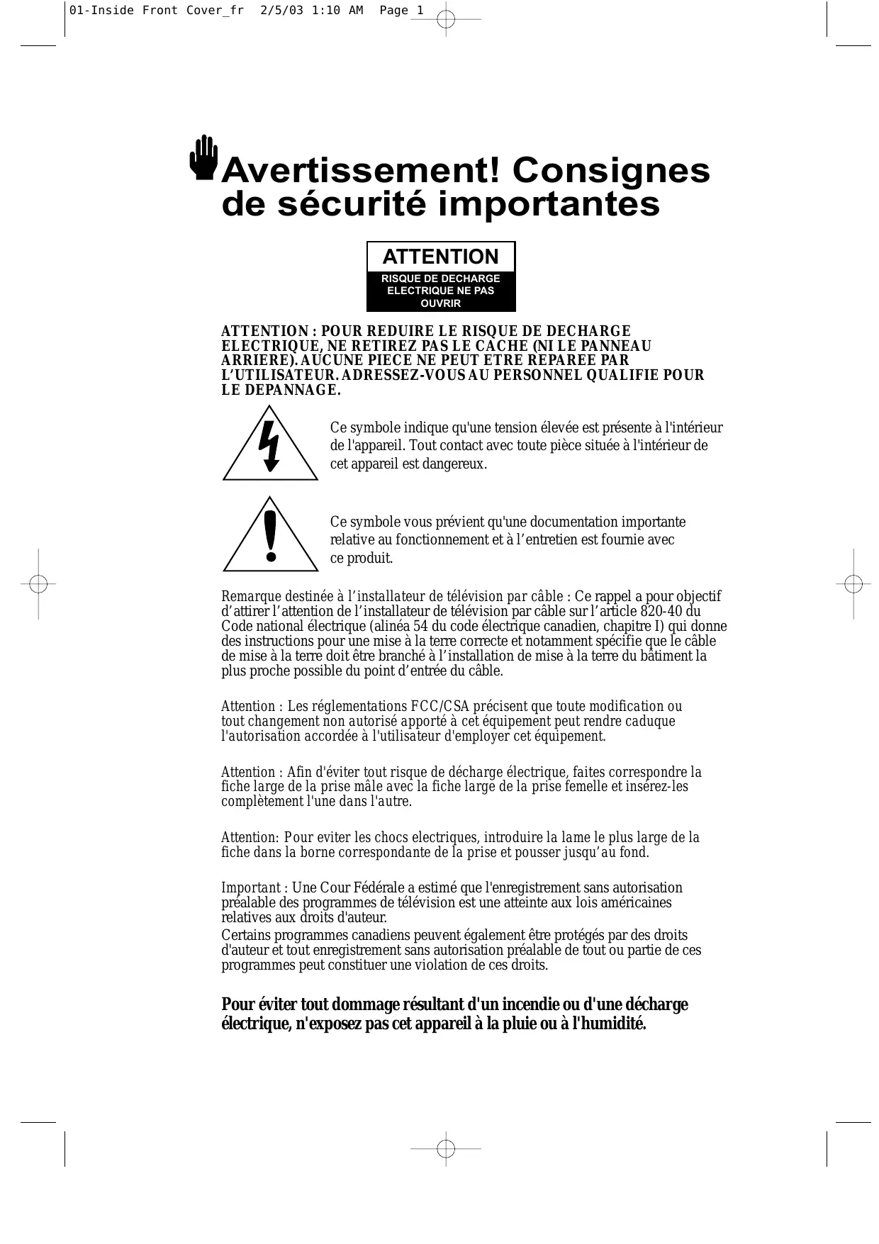 • Après chaque intervention sur cette télévision, demandez au technicien de dépannage d'effectuer des contrôles de sécurité pour s'assurer que la télévision est en bon état de fonctionnement. 02-PREFACE_fr 2/5/03 1:11 AM Page 3