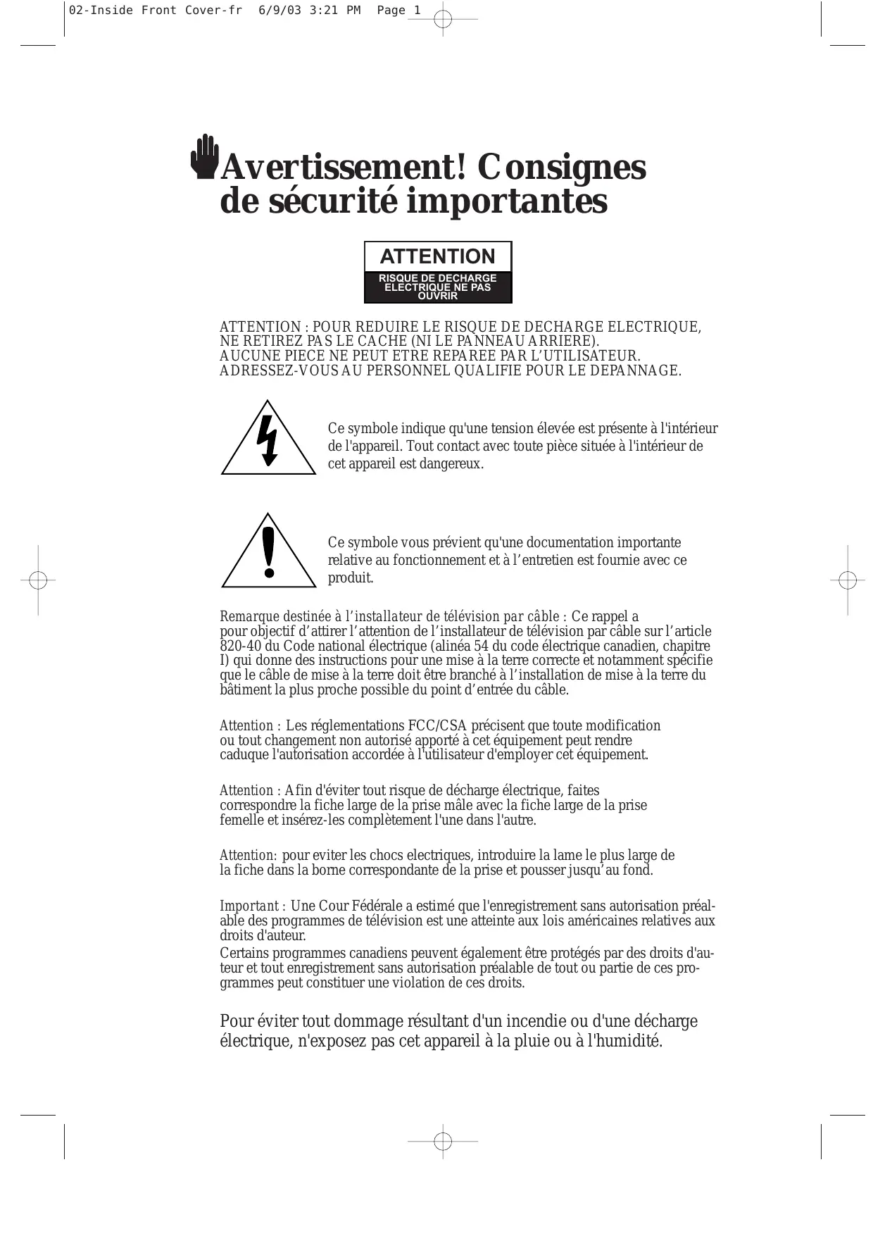 • Protégez le cordon d'alimentation. Le cordon d'alimentation secteur doit passer de telle sorte qu'il ne soit pas piétiné ou pincé par des objets placés sur ou contre lui. Accordez une attention particulière aux cordons au niveau des fiches des prises et à leur point de sortie de l'appareil. FRE 1 03-PREFACE-fr 6/9/03 3:22 PM Page 2