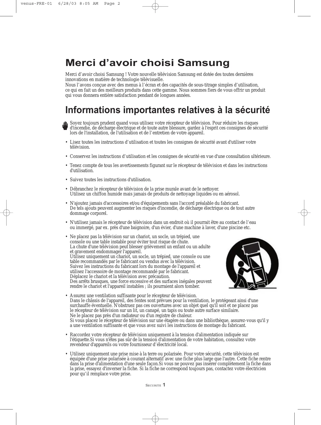 venus-FRE-01 6/28/03 8:05 AM Page 5 Informations importantes en matière de garantie relative aux formats d’affichage utilisés Les téléviseurs à écran standard (4:3, rapport de la largeur sur la hauteur d’écran) sont principalement destinés à regarder de la vidéo à images animées au format standard. Les images qui s’y affichent doivent avant tout être au rapport de format 4:3 et en mouvement constant. L’affichage d’images ou de graphismes fixes à l’écran, tels les barres sombres supérieure et inférieure (images sur écran large) ne doit pas dépasser 15 % de l’ensemble du temps d’utilisation du téléviseur par semaine. Les téléviseurs à écran large (16:9, rapport de la largeur sur la hauteur d’écran) sont principalement destinés à regarder des images animées au format large. Les images qui s’y affichent doivent avant tout être au format large 16:9 ou étendues de façon à remplir l’écran si votre modèle dispose de cette fonction, ainsi qu’en mouvement constant. L’affichage d’images ou de graphismes fixes à l’écran, telles les barres sombres supérieure et inférieure qui apparaissent sur les images TVau format standard non étendues et sur les écrans de programmation, ne doit pas dépasser 15 % de l’ensemble du temps d’utilisation du téléviseur par semaine. En outre, l’affichage d’autres images fixes et de texte, tels que les cours de la bourse, les jeux vidéo, les logos de chaînes TV, les sites web, les graphismes ou des motifs d’ordinateurs, ne doit pas dépasser la durée limite dont il est question ci-dessus pour l’ensemble des téléviseurs. L’affichage d’images fixes quelles qu’elles soient au-delà des indications ci-dessus peut entraîner un vieillissement irrégulier des tubes cathodiques (LCD TV) qui affichent de manière peu visible mais constante des images parasites sur l’écran du téléviseur. Pour éviter ce phénomène, variez les programmes et les images, et surtout affichez des images animées en plein écran, plutôt que des motifs fixes ou des barres sombres.Sur les modèles de téléviseur disposant de fonctions de redimensionnement de l’image, utilisez ces réglages pour afficher les différents formats sous la forme d’une image plein écran. Attention à la sélection et à la durée des formats TVutilisés pour l’affichage. Le vieillissement irrégulier du tube cathodique imputable au choix et à l’utilisation des formats ainsi que les images parasites ne sont pas couverts par la garantie limitée Samsung. [Remarque] Si vous visualisez un écran fixe pendant une longue période de temps, une image résiduelle ou floue peut apparaître. Passez en mode économie d'énergie ou réglez l'économiseur d'écran sur image mobile lorsque vous devez vous éloigner du moniteur pendant une période prolongée. SECURITE