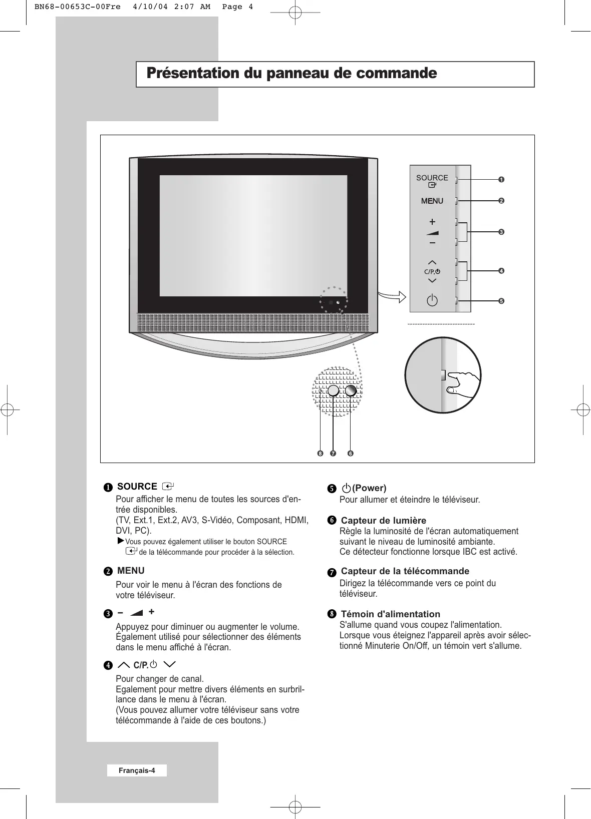 Symbols Press Important Note Français-3 BN68-00653C-00Fre 4/10/04 2:07 AM Page 4 Présentation du panneau de commande SOURCE Pour afficher le menu de toutes les sources d'entrée disponibles. (TV, Ext.1, Ext.2, AV3, S-Vidéo, Composant, HDMI, DVI, PC). Vous pouvez également utiliser le bouton SOURCE de la télécommande pour procéder à la sélection. (Power) Pour allumer et éteindre le téléviseur. Capteur de lumière Règle la luminosité de l'écran automatiquement suivant le niveau de luminosité ambiante. Ce détecteur fonctionne lorsque IBC est activé. MENU Pour voir le menu à l'écran des fonctions de votre téléviseur. Capteur de la télécommande Dirigez la télécommande vers ce point du téléviseur.