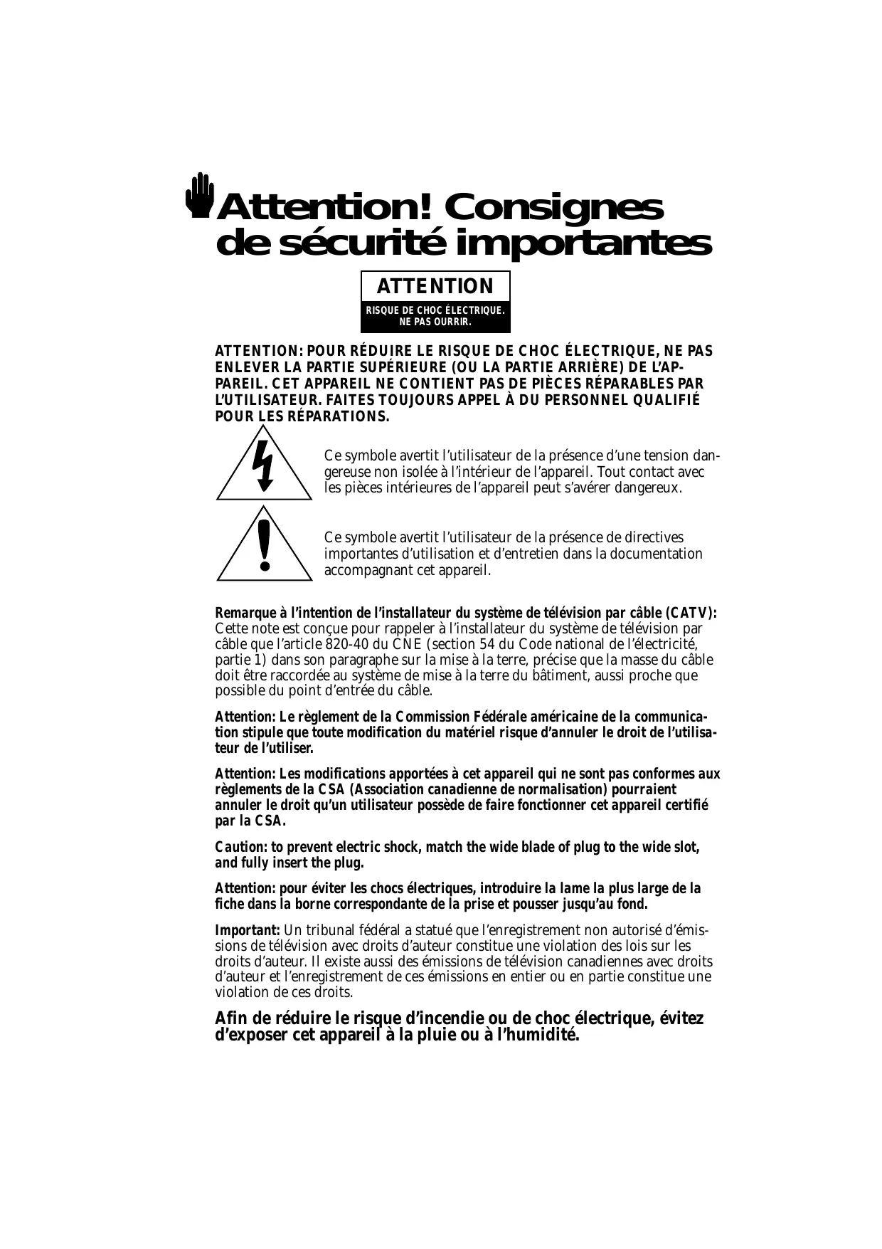 PCL545R PCL5415R PCL6215R Attention! Consignes de sécurité importantes ATTENTION RISQUE DE CHOC ÉLECTRIQUE. NE PAS OURRIR. ATTENTION: POUR RÉDUIRE LE RISQUE DE CHOC ÉLECTRIQUE, NE PAS ENLEVER LA PARTIE SUPÉRIEURE (OU LA PARTIE ARRIÈRE) DE L’APPAREIL. CET APPAREIL NE CONTIENT PAS DE PIÈCES RÉPARABLES PAR L’UTILISATEUR. FAITES TOUJOURS APPEL À DU PERSONNEL QUALIFIÉ POUR LES RÉPARATIONS. Ce symbole avertit l’utilisateur de la présence d’une tension dangereuse non isolée à l’intérieur de l’appareil. Tout contact avec les pièces intérieures de l’appareil peut s’avérer dangereux. Ce symbole avertit l’utilisateur de la présence de directives importantes d’utilisation et d’entretien dans la documentation accompagnant cet appareil. Remarque à l’intention de l’installateur du système de télévision par câble (CATV): Cette note est conçue pour rappeler à l’installateur du système de télévision par câble que l’article 820-40 du CNE (section 54 du Code national de l’électricité,
