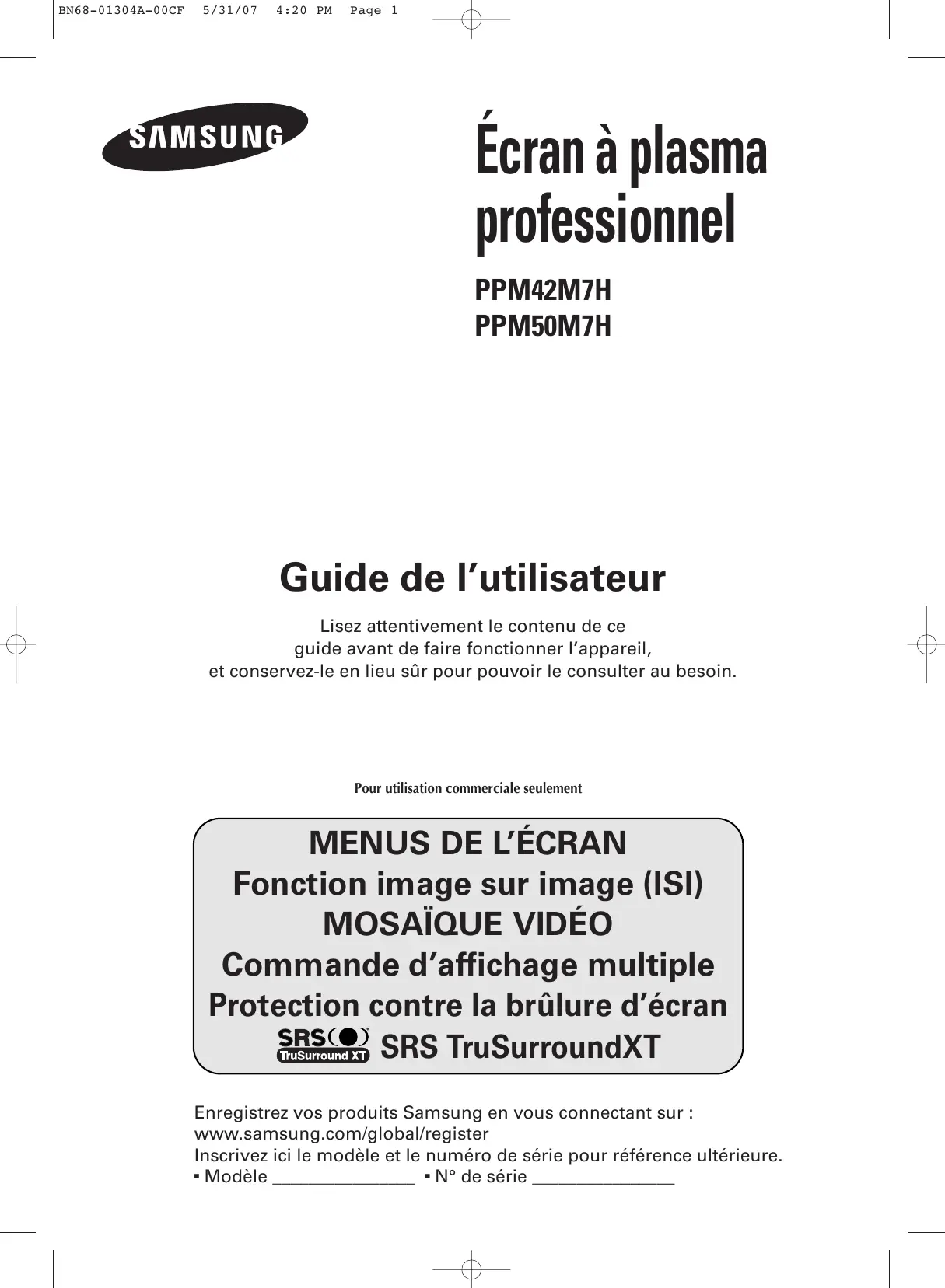 Commande d’affichage multiple Protection contre la brûlure d’écran SRS TruSurroundXT Enregistrez vos produits Samsung en vous connectant sur : www.samsung.com/global/register Inscrivez ici le modèle et le numéro de série pour référence ultérieure. Modèle ________________ N° de série ________________