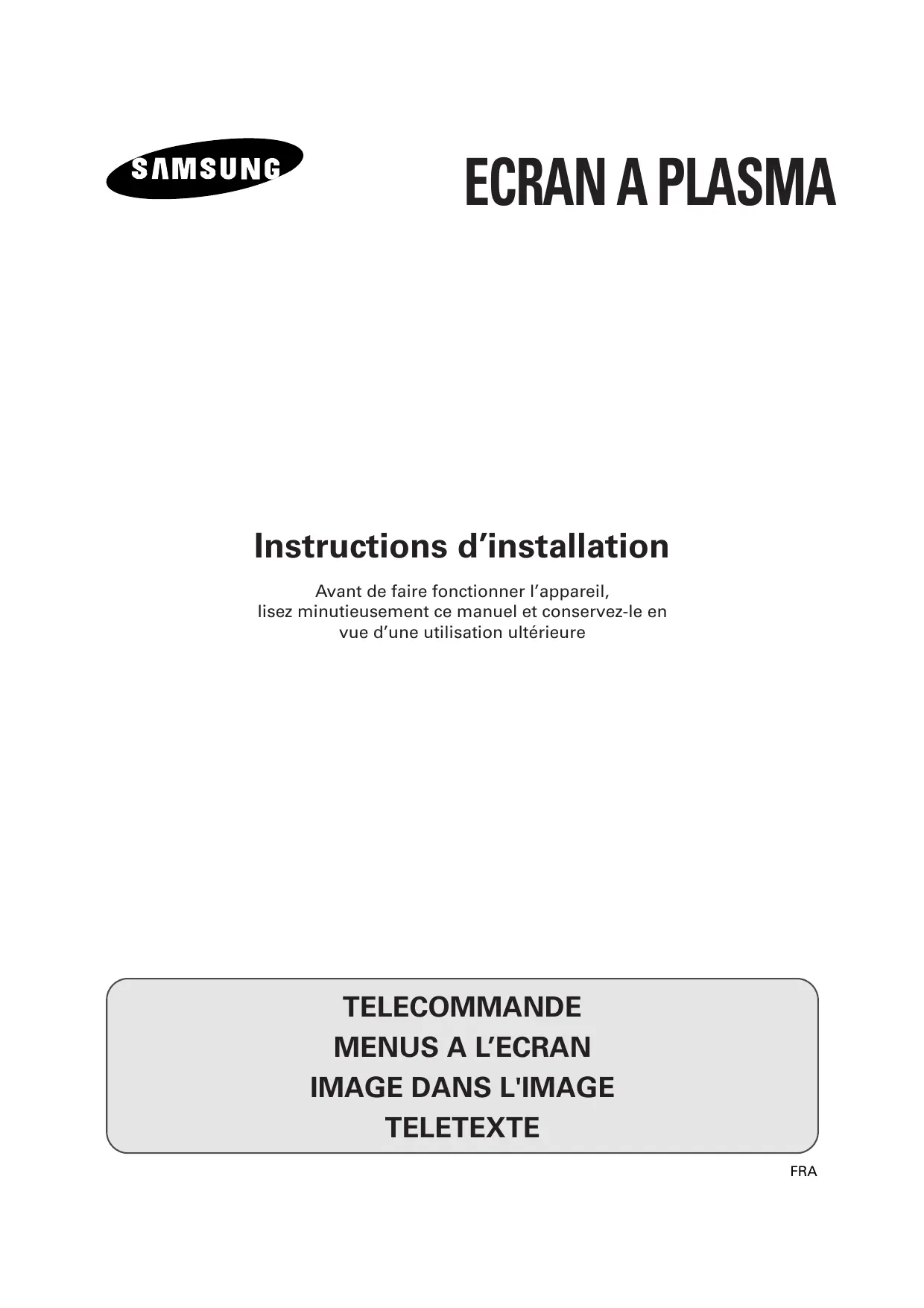 Instructions d’installation Avant de faire fonctionner l’appareil, lisez minutieusement ce manuel et conservez-le en vue d’une utilisation ultérieure Consignes de sécurité FRA ◆ Ne placez pas l’écran à plasma sur un chariot, un socle, un trépied, une console, une table ou une surface instable de laquelle il pourrait tomber. ◆ N’exposez pas l’écran à plasma à des conditions de température ou d’humidité extrêmes. ◆ N’exposez pas l’écran à plasma à la lumière directe du soleil ou à d’autres sources de chaleur. ◆ Ne placez pas l’écran à plasma en contact avec un liquide quel qu’il soit. ◆ Ne mettez jamais d’objets d’aucune sorte sur la télévision et ne placez pas de récipient contenant de l’eau sur l’écran à plasma. ◆ En cas d’orage (particulièrement en cas d'éclairs, débranchez l’écran à plasma de la prise du secteur et de l’antenne. ◆ Ne marchez pas sur le cordon d’alimentation et ne le vrillez pas. ◆ Ne surchargez pas les prises murales ou les câbles de rallonge car cela crée un risque d’incendie ou de décharge électrique. ◆ Utilisez un chiffon doux et sec (ne contenant pas de matières volatiles) pour nettoyer l’écran à plasma. ◆ Si l’écran à plasma est brisé, n’essayez pas de le réparer vous-même. Contactez le personnel qualifié du service d’assistance. ◆ Lorsque la télécommande reste inutilisée pendant longtemps, retirez les piles et stockez-les dans un endroit frais et sec. ◆ Ne laissez jamais tomber la télécommande. Instructions d’utilisation ◆ Rémanence à l’écran Ne figez pas d'images (telle qu’une image de jeu vidéo ou de PC branché sur l’écran à plasma) sur l’écran du moniteur à plasma pendant plus de deux heures car cela peut entraîner une rémanence à l’écran. Cette rémanence est également appelée “brûlure d’écran”. Pour éviter la rémanence, réduisez le niveau de contraste ou de luminosité de l’écran lorsque vous affichez une image figée. ◆ Défaut de cellule L’écran à plasma est constitué de cellules minces. Bien que les écrans soient produits avec plus de 99,9 pour cent de cellules actives, il peut y avoir des cellules qui ne produisent pas de lumière ou qui restent allumées. ◆ Hauteur L’écran à plasma est normalement conçu pour être utilisé à une altitude inférieure à 2000 m. Il peut fonctionner de façon anormale au-dessus de 2000 mètres d’altitude, ne l’installez pas et ne le faites pas fonctionner dans ces conditions. ◆ Garantie - Période de garantie : Un an à compter de la date d’achat de votre écran à plasma. - La garantie ne couvre pas les dommages causés par la rémanence. - Les brûlures ne sont pas couvertes par la garantie.