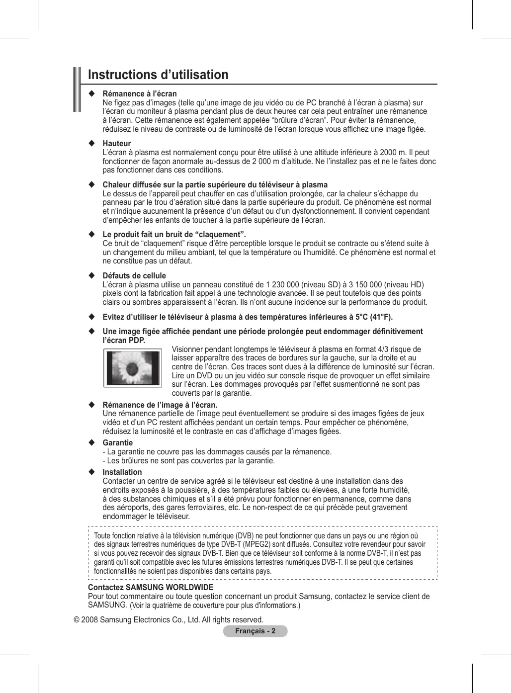 • 15:30 ~ 18:00 Once Animal Park Instructions d’utilisation Rémanence à l’écran Ne figez pas d’images (telle qu’une image de jeu vidéo ou de PC branché à l’écran à plasma) sur l’écran du moniteur à plasma pendant plus de deux heures car cela peut entraîner une rémanence à l’écran. Cette rémanence est également appelée “brûlure d’écran”. Pour éviter la rémanence, réduisez le niveau de contraste ou de luminosité de l’écran lorsque vous affichez une image figée. Hauteur L’écran à plasma est normalement conçu pour être utilisé à une altitude inférieure à 2000 m. Il peut fonctionner de façon anormale au-dessus de 2 000 m d’altitude. Ne l’installez pas et ne le faites donc pas fonctionner dans ces conditions. Chaleur diffusée sur la partie supérieure du téléviseur à plasma Le dessus de l’appareil peut chauffer en cas d’utilisation prolongée, car la chaleur s’échappe du panneau par le trou d’aération situé dans la partie supérieure du produit. Ce phénomène est normal et n’indique aucunement la présence d’un défaut ou d’un dysfonctionnement. Il convient cependant d’empêcher les enfants de toucher à la partie supérieure de l’écran. Le produit fait un bruit de “claquement”. Ce bruit de “claquement” risque d’être perceptible lorsque le produit se contracte ou s’étend suite à un changement du milieu ambiant, tel que la température ou l’humidité. Ce phénomène est normal et ne constitue pas un défaut. Défauts de cellule L’écran à plasma utilise un panneau constitué de 1 230 000 (niveau SD) à 3 150 000 (niveau HD) pixels dont la fabrication fait appel à une technologie avancée. Il se peut toutefois que des points clairs ou sombres apparaissent à l’écran. Ils n’ont aucune incidence sur la performance du produit. Evitez d’utiliser le téléviseur à plasma à des températures inférieures à 5°C (41°F). Une image figée affichée pendant une période prolongée peut endommager définitivement l’écran PDP. Visionner pendant longtemps le téléviseur à plasma en format 4/3 risque de laisser apparaître des traces de bordures sur la gauche, sur la droite et au centre de l’écran. Ces traces sont dues à la différence de luminosité sur l’écran. Lire un DVD ou un jeu vidéo sur console risque de provoquer un effet similaire sur l’écran. Les dommages provoqués par l’effet susmentionné ne sont pas couverts par la garantie. Rémanence de l’image à l’écran. Une rémanence partielle de l’image peut éventuellement se produire si des images figées de jeux vidéo et d’un PC restent affichées pendant un certain temps. Pour empêcher ce phénomène, réduisez la luminosité et le contraste en cas d’affichage d’images figées. Garantie - La garantie ne couvre pas les dommages causés par la rémanence. - Les brûlures ne sont pas couvertes par la garantie. Installation Contacter un centre de service agréé si le téléviseur est destiné à une installation dans des endroits exposés à la poussière, à des températures faibles ou élevées, à une forte humidité, à des substances chimiques et s’il a été prévu pour fonctionner en permanence, comme dans des aéroports, des gares ferroviaires, etc. Le non-respect de ce qui précède peut gravement endommager le téléviseur. Toute fonction relative à la télévision numérique (DVB) ne peut fonctionner que dans un pays ou une région où des signaux terrestres numériques de type DVB-T (MPEG2) sont diffusés. Consultez votre revendeur pour savoir si vous pouvez recevoir des signaux DVB-T. Bien que ce téléviseur soit conforme à la norme DVB-T, il n’est pas garanti qu’il soit compatible avec les futures émissions terrestres numériques DVB-T. Il se peut que certaines fonctionnalités ne soient pas disponibles dans certains pays. Contactez SAMSUNG WORLDWIDE Pour tout commentaire ou toute question concernant un produit Samsung, contactez le service client de SAMSUNG. (Voir la quatrième de couverture pour plus d'informations.) © 2008 Samsung Electronics Co., Ltd. All rights reserved. Français - Sommaire Informations générales Description des fonctions Instructions d’utilisation p. 2
