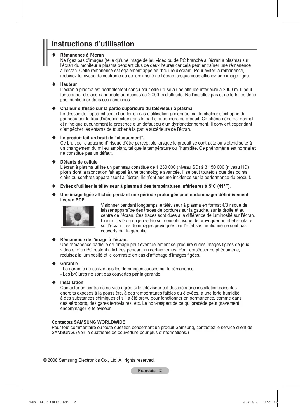 - Instructions d’utilisation Rémanence à l’écran Ne figez pas d’images (telle qu’une image de jeu vidéo ou de PC branché à l’écran à plasma) sur l’écran du moniteur à plasma pendant plus de deux heures car cela peut entraîner une rémanence à l’écran. Cette rémanence est également appelée “brûlure d’écran”. Pour éviter la rémanence, réduisez le niveau de contraste ou de luminosité de l’écran lorsque vous affichez une image figée. Hauteur L’écran à plasma est normalement conçu pour être utilisé à une altitude inférieure à 2000 m. Il peut fonctionner de façon anormale au-dessus de 2 000 m d’altitude. Ne l’installez pas et ne le faites donc pas fonctionner dans ces conditions. Chaleur diffusée sur la partie supérieure du téléviseur à plasma Le dessus de l’appareil peut chauffer en cas d’utilisation prolongée, car la chaleur s’échappe du panneau par le trou d’aération situé dans la partie supérieure du produit. Ce phénomène est normal et n’indique aucunement la présence d’un défaut ou d’un dysfonctionnement. Il convient cependant d’empêcher les enfants de toucher à la partie supérieure de l’écran. Le produit fait un bruit de “claquement”. Ce bruit de “claquement” risque d’être perceptible lorsque le produit se contracte ou s’étend suite à un changement du milieu ambiant, tel que la température ou l’humidité. Ce phénomène est normal et ne constitue pas un défaut. Défauts de cellule L’écran à plasma utilise un panneau constitué de 1 230 000 (niveau SD) à 3 150 000 (niveau HD) pixels dont la fabrication fait appel à une technologie avancée. Il se peut toutefois que des points clairs ou sombres apparaissent à l’écran. Ils n’ont aucune incidence sur la performance du produit. Evitez d’utiliser le téléviseur à plasma à des températures inférieures à 5°C (41°F). Une image figée affichée pendant une période prolongée peut endommager définitivement l’écran PDP. Visionner pendant longtemps le téléviseur à plasma en format 4/3 risque de laisser apparaître des traces de bordures sur la gauche, sur la droite et au centre de l’écran. Ces traces sont dues à la différence de luminosité sur l’écran. Lire un DVD ou un jeu vidéo sur console risque de provoquer un effet similaire sur l’écran. Les dommages provoqués par l’effet susmentionné ne sont pas couverts par la garantie. Rémanence de l’image à l’écran. Une rémanence partielle de l’image peut éventuellement se produire si des images figées de jeux vidéo et d’un PC restent affichées pendant un certain temps. Pour empêcher ce phénomène, réduisez la luminosité et le contraste en cas d’affichage d’images figées. Garantie - La garantie ne couvre pas les dommages causés par la rémanence. - Les brûlures ne sont pas couvertes par la garantie. Installation Contacter un centre de service agréé si le téléviseur est destiné à une installation dans des endroits exposés à la poussière, à des températures faibles ou élevées, à une forte humidité, à des substances chimiques et s’il a été prévu pour fonctionner en permanence, comme dans des aéroports, des gares ferroviaires, etc. Le non-respect de ce qui précède peut gravement endommager le téléviseur. Contactez SAMSUNG WORLDWIDE Pour tout commentaire ou toute question concernant un produit Samsung, contactez le service client de SAMSUNG. (Voir la quatrième de couverture pour plus d'informations.) Sommaire Informations générales Description des fonctions Instructions d’utilisation p. 2