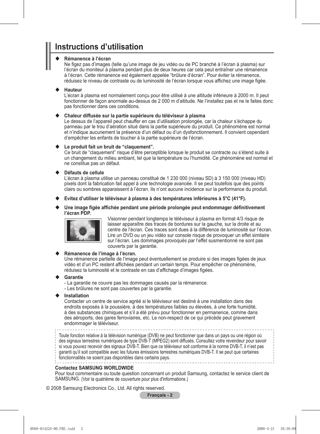 15:30 ~ 18:00 Once Animal Park Instructions d’utilisation Rémanence à l’écran Ne figez pas d’images (telle qu’une image de jeu vidéo ou de PC branché à l’écran à plasma) sur l’écran du moniteur à plasma pendant plus de deux heures car cela peut entraîner une rémanence à l’écran. Cette rémanence est également appelée “brûlure d’écran”. Pour éviter la rémanence, réduisez le niveau de contraste ou de luminosité de l’écran lorsque vous affichez une image figée. Hauteur L’écran à plasma est normalement conçu pour être utilisé à une altitude inférieure à 2000 m. Il peut fonctionner de façon anormale au-dessus de 2 000 m d’altitude. Ne l’installez pas et ne le faites donc pas fonctionner dans ces conditions. Chaleur diffusée sur la partie supérieure du téléviseur à plasma Le dessus de l’appareil peut chauffer en cas d’utilisation prolongée, car la chaleur s’échappe du panneau par le trou d’aération situé dans la partie supérieure du produit. Ce phénomène est normal et n’indique aucunement la présence d’un défaut ou d’un dysfonctionnement. Il convient cependant d’empêcher les enfants de toucher à la partie supérieure de l’écran. Le produit fait un bruit de “claquement”. Ce bruit de “claquement” risque d’être perceptible lorsque le produit se contracte ou s’étend suite à un changement du milieu ambiant, tel que la température ou l’humidité. Ce phénomène est normal et ne constitue pas un défaut. Défauts de cellule L’écran à plasma utilise un panneau constitué de 1 230 000 (niveau SD) à 3 150 000 (niveau HD) pixels dont la fabrication fait appel à une technologie avancée. Il se peut toutefois que des points clairs ou sombres apparaissent à l’écran. Ils n’ont aucune incidence sur la performance du produit. Evitez d’utiliser le téléviseur à plasma à des températures inférieures à 5°C (41°F). Une image figée affichée pendant une période prolongée peut endommager définitivement l’écran PDP. Visionner pendant longtemps le téléviseur à plasma en format 4/3 risque de laisser apparaître des traces de bordures sur la gauche, sur la droite et au centre de l’écran. Ces traces sont dues à la différence de luminosité sur l’écran. Lire un DVD ou un jeu vidéo sur console risque de provoquer un effet similaire sur l’écran. Les dommages provoqués par l’effet susmentionné ne sont pas couverts par la garantie. Rémanence de l’image à l’écran. Une rémanence partielle de l’image peut éventuellement se produire si des images figées de jeux vidéo et d’un PC restent affichées pendant un certain temps. Pour empêcher ce phénomène, réduisez la luminosité et le contraste en cas d’affichage d’images figées. Garantie - La garantie ne couvre pas les dommages causés par la rémanence. - Les brûlures ne sont pas couvertes par la garantie. Installation Contacter un centre de service agréé si le téléviseur est destiné à une installation dans des endroits exposés à la poussière, à des températures faibles ou élevées, à une forte humidité, à des substances chimiques et s’il a été prévu pour fonctionner en permanence, comme dans des aéroports, des gares ferroviaires, etc. Le non-respect de ce qui précède peut gravement endommager le téléviseur. Toute fonction relative à la télévision numérique (DVB) ne peut fonctionner que dans un pays ou une région où des signaux terrestres numériques de type DVB-T (MPEG2) sont diffusés. Consultez votre revendeur pour savoir si vous pouvez recevoir des signaux DVB-T. Bien que ce téléviseur soit conforme à la norme DVB-T, il n’est pas garanti qu’il soit compatible avec les futures émissions terrestres numériques DVB-T. Il se peut que certaines fonctionnalités ne soient pas disponibles dans certains pays. Contactez SAMSUNG WORLDWIDE Pour tout commentaire ou toute question concernant un produit Samsung, contactez le service client de SAMSUNG. (Voir la quatrième de couverture pour plus d'informations.) © 2008 Samsung Electronics Co., Ltd. All rights reserved. Français - BN68-01422A-00_FRE.indd