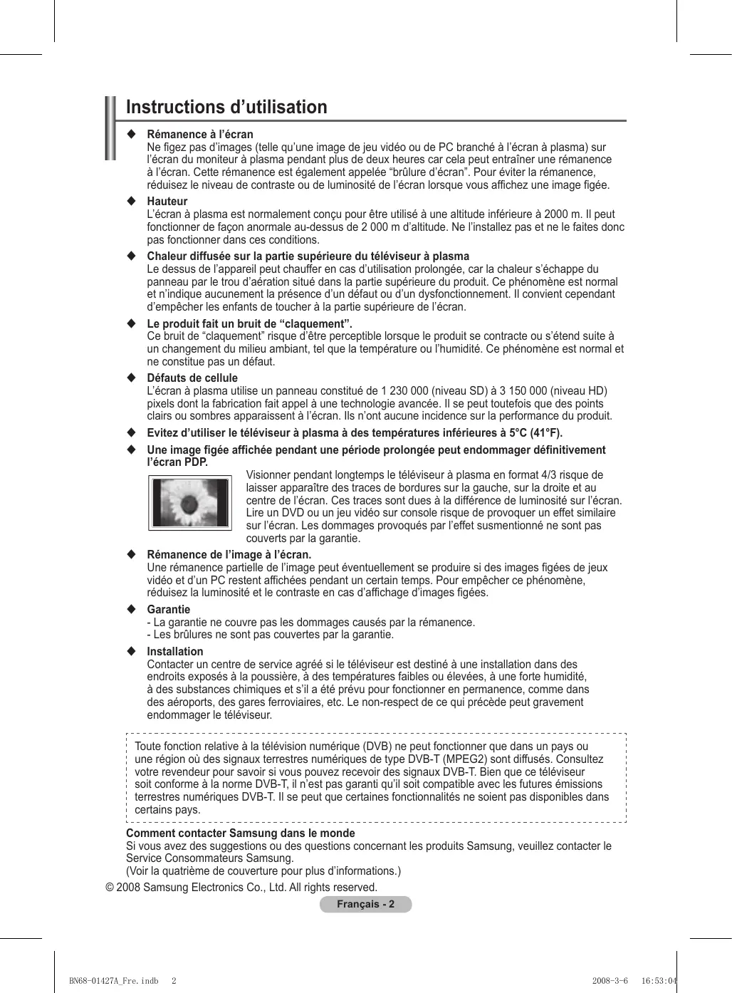 Enter Melody : Off Entertainment : Off Energy Saving : Off PIP Instructions d’utilisation Rémanence à l’écran Ne figez pas d’images (telle qu’une image de jeu vidéo ou de PC branché à l’écran à plasma) sur l’écran du moniteur à plasma pendant plus de deux heures car cela peut entraîner une rémanence à l’écran. Cette rémanence est également appelée “brûlure d’écran”. Pour éviter la rémanence, réduisez le niveau de contraste ou de luminosité de l’écran lorsque vous affichez une image figée. Hauteur L’écran à plasma est normalement conçu pour être utilisé à une altitude inférieure à 2000 m. Il peut fonctionner de façon anormale au-dessus de 2 000 m d’altitude. Ne l’installez pas et ne le faites donc pas fonctionner dans ces conditions. Chaleur diffusée sur la partie supérieure du téléviseur à plasma Le dessus de l’appareil peut chauffer en cas d’utilisation prolongée, car la chaleur s’échappe du panneau par le trou d’aération situé dans la partie supérieure du produit. Ce phénomène est normal et n’indique aucunement la présence d’un défaut ou d’un dysfonctionnement. Il convient cependant d’empêcher les enfants de toucher à la partie supérieure de l’écran. Le produit fait un bruit de “claquement”. Ce bruit de “claquement” risque d’être perceptible lorsque le produit se contracte ou s’étend suite à un changement du milieu ambiant, tel que la température ou l’humidité. Ce phénomène est normal et ne constitue pas un défaut. Défauts de cellule L’écran à plasma utilise un panneau constitué de 1 230 000 (niveau SD) à 3 150 000 (niveau HD) pixels dont la fabrication fait appel à une technologie avancée. Il se peut toutefois que des points clairs ou sombres apparaissent à l’écran. Ils n’ont aucune incidence sur la performance du produit. Evitez d’utiliser le téléviseur à plasma à des températures inférieures à 5°C (41°F). Une image figée affichée pendant une période prolongée peut endommager définitivement l’écran PDP. Visionner pendant longtemps le téléviseur à plasma en format 4/3 risque de laisser apparaître des traces de bordures sur la gauche, sur la droite et au centre de l’écran. Ces traces sont dues à la différence de luminosité sur l’écran. Lire un DVD ou un jeu vidéo sur console risque de provoquer un effet similaire sur l’écran. Les dommages provoqués par l’effet susmentionné ne sont pas couverts par la garantie. Rémanence de l’image à l’écran. Une rémanence partielle de l’image peut éventuellement se produire si des images figées de jeux vidéo et d’un PC restent affichées pendant un certain temps. Pour empêcher ce phénomène, réduisez la luminosité et le contraste en cas d’affichage d’images figées. Garantie - La garantie ne couvre pas les dommages causés par la rémanence. - Les brûlures ne sont pas couvertes par la garantie. Installation Contacter un centre de service agréé si le téléviseur est destiné à une installation dans des endroits exposés à la poussière, à des températures faibles ou élevées, à une forte humidité, à des substances chimiques et s’il a été prévu pour fonctionner en permanence, comme dans des aéroports, des gares ferroviaires, etc. Le non-respect de ce qui précède peut gravement endommager le téléviseur. Toute fonction relative à la télévision numérique (DVB) ne peut fonctionner que dans un pays ou une région où des signaux terrestres numériques de type DVB-T (MPEG2) sont diffusés. Consultez votre revendeur pour savoir si vous pouvez recevoir des signaux DVB-T. Bien que ce téléviseur soit conforme à la norme DVB-T, il n’est pas garanti qu’il soit compatible avec les futures émissions terrestres numériques DVB-T. Il se peut que certaines fonctionnalités ne soient pas disponibles dans certains pays. Comment contacter Samsung dans le monde Si vous avez des suggestions ou des questions concernant les produits Samsung, veuillez contacter le Service Consommateurs Samsung. (Voir la quatrième de couverture pour plus d’informations.) © 2008 Samsung Electronics Co., Ltd. All rights reserved. Français - BN68-01427A_Fre.indb