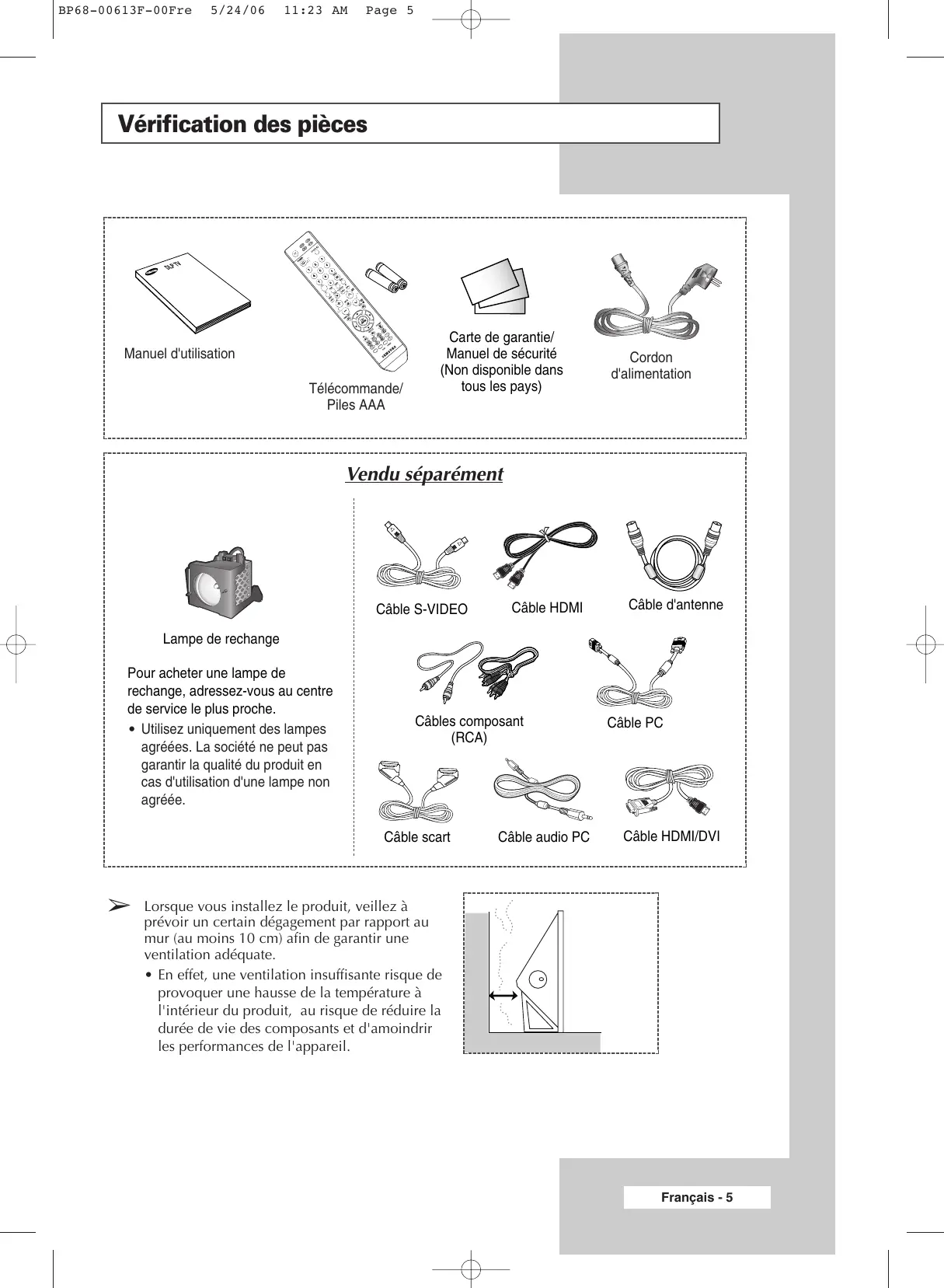 BP68-00613F-00Fre 5/24/06 11:23 AM Page 5 Vérification des pièces Manuel d'utilisation Télécommande/ Piles AAA Carte de garantie/ Manuel de sécurité (Non disponible dans tous les pays) Cordon d'alimentation Vendu séparément Câble S-VIDEO Câble HDMI Câble d'antenne Lampe de rechange Pour acheter une lampe de rechange, adressez-vous au centre de service le plus proche.