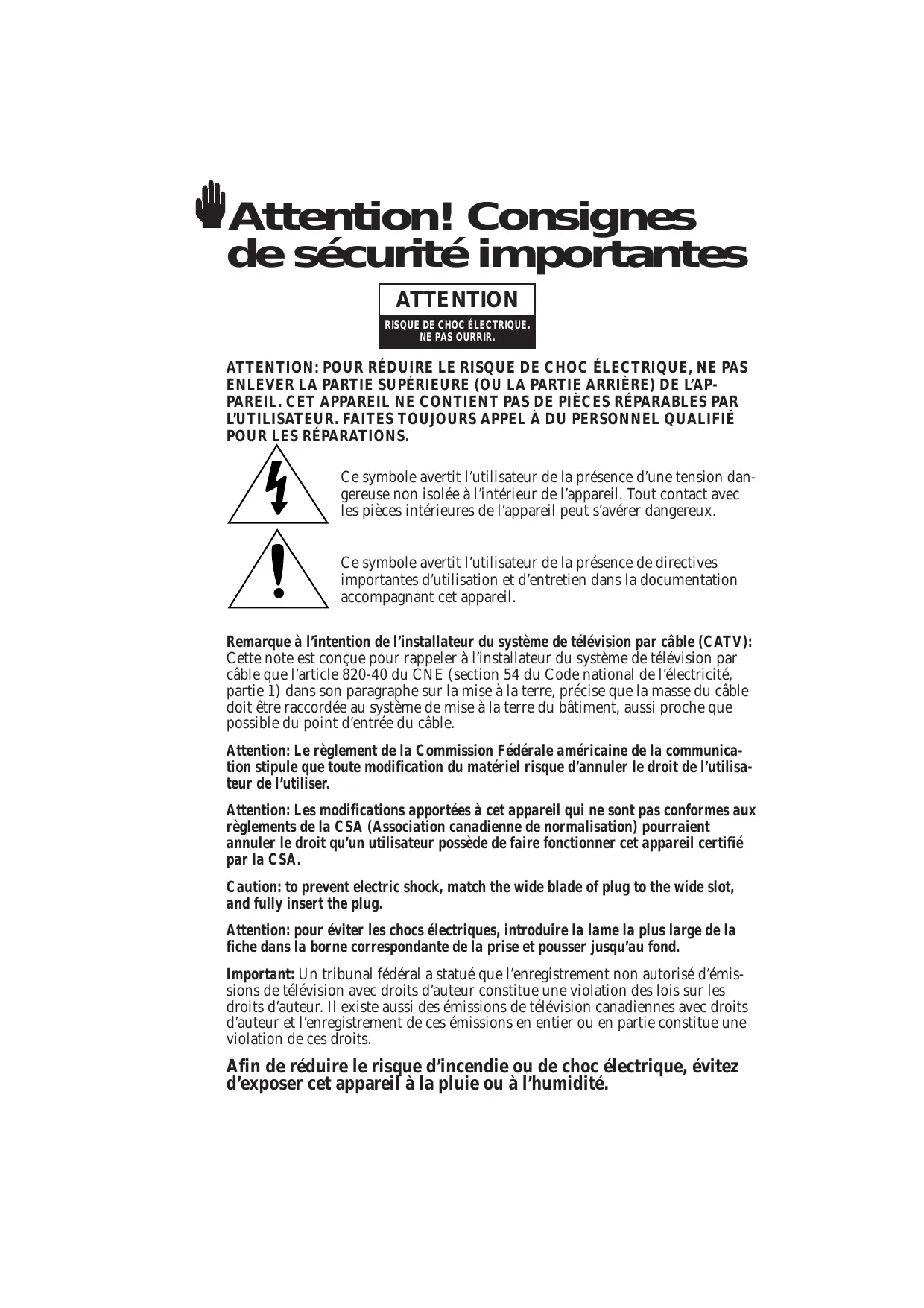 TXL2791F TXM2790F TXM3292F Attention! Consignes de sécurité importantes ATTENTION RISQUE DE CHOC ÉLECTRIQUE. NE PAS OURRIR. ATTENTION: POUR RÉDUIRE LE RISQUE DE CHOC ÉLECTRIQUE, NE PAS ENLEVER LA PARTIE SUPÉRIEURE (OU LA PARTIE ARRIÈRE) DE L’APPAREIL. CET APPAREIL NE CONTIENT PAS DE PIÈCES RÉPARABLES PAR L’UTILISATEUR. FAITES TOUJOURS APPEL À DU PERSONNEL QUALIFIÉ POUR LES RÉPARATIONS. Ce symbole avertit l’utilisateur de la présence d’une tension dangereuse non isolée à l’intérieur de l’appareil. Tout contact avec les pièces intérieures de l’appareil peut s’avérer dangereux. Ce symbole avertit l’utilisateur de la présence de directives importantes d’utilisation et d’entretien dans la documentation accompagnant cet appareil. Remarque à l’intention de l’installateur du système de télévision par câble (CATV): Cette note est conçue pour rappeler à l’installateur du système de télévision par câble que l’article 820-40 du CNE (section 54 du Code national de l’électricité,