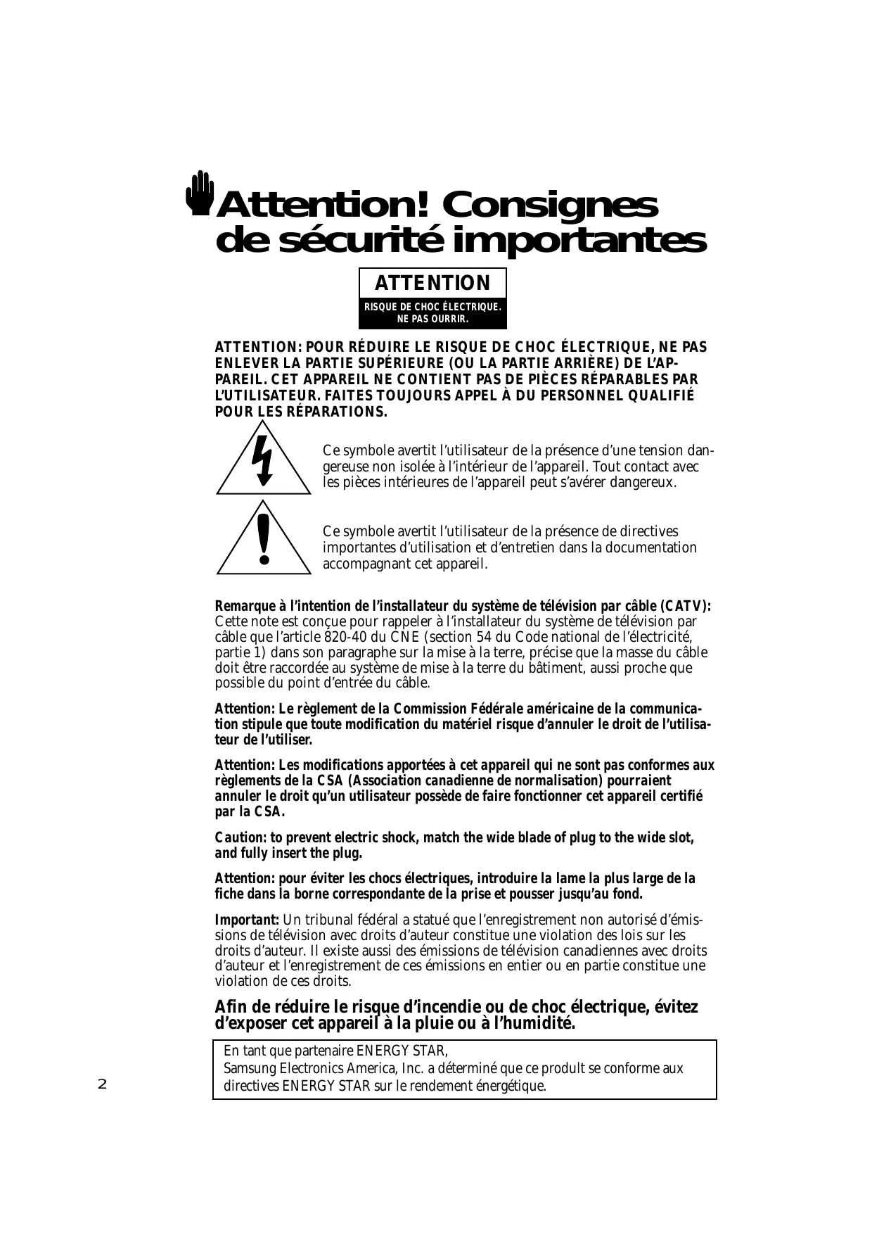 En tant que partenaire ENERGY STAR, Samsung Electronics America, Inc. a déterminé que ce prodult se conforme aux directives ENERGY STAR sur le rendement énergétique. Merci d’avoir choisi un produit Samsung Merci d’avoir choisi un produit Samsung! Votre nouveau téléviseur Samsung est un appareil à la fine pointe de la technologie. Ses menus à l’écran et ses sous-titres codés font de ce téléviseur l’un des produits les plus attrayants de sa catégorie. Nous sommes fiers de vous offrir un produit pratique et fiable dont vous pourrez profiter de l’utilisation pour nombreuses années à venir. Consignes de sécurité importantes