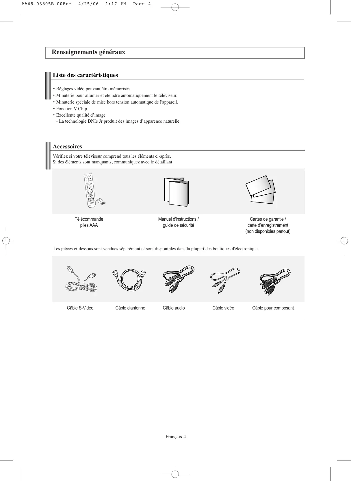 Bouton à une touche Français-3 Problèmes et solutions ................................................................ 39 Fiche technique ............................................................................ 39 AA68-03805B-00Fre 4/25/06 1:17 PM Page 4 Renseignements généraux Liste des caractéristiques Réglages vidéo pouvant être mémorisés. Minuterie pour allumer et éteindre automatiquement le téléviseur. Minuterie spéciale de mise hors tension automatique de l'appareil. Fonction V-Chip. Excellente qualité d’image - La technologie DNIe Jr produit des images d’apparence naturelle. Accessoires Vérifiez si votre téléviseur comprend tous les éléments ci-après. Si des éléments sont manquants, communiquez avec le détaillant. Télécommande piles AAA Manuel d'instructions / guide de sécurité Cartes de garantie / carte d’enregistrement (non disponibles partout) Les pièces ci-dessous sont vendues séparément et sont disponibles dans la plupart des boutiques d'électronique. Câble S-Vidéo Câble d'antenne Câble audio Français-4 Câble vidéo Câble pour composant AA68-03805B-00Fre 4/25/06 1:17 PM Page 5 Affichage du panneau de configuration Touches dans la partie inférieure droite du panneau Les touches du panneau inférieur droit permettent de commander les principales fonctions du téléviseur, y compris le menu à l'écran. Pour accéder aux fonctions plus avancées, vous devez utiliser la télécommande. 1 SOURCE