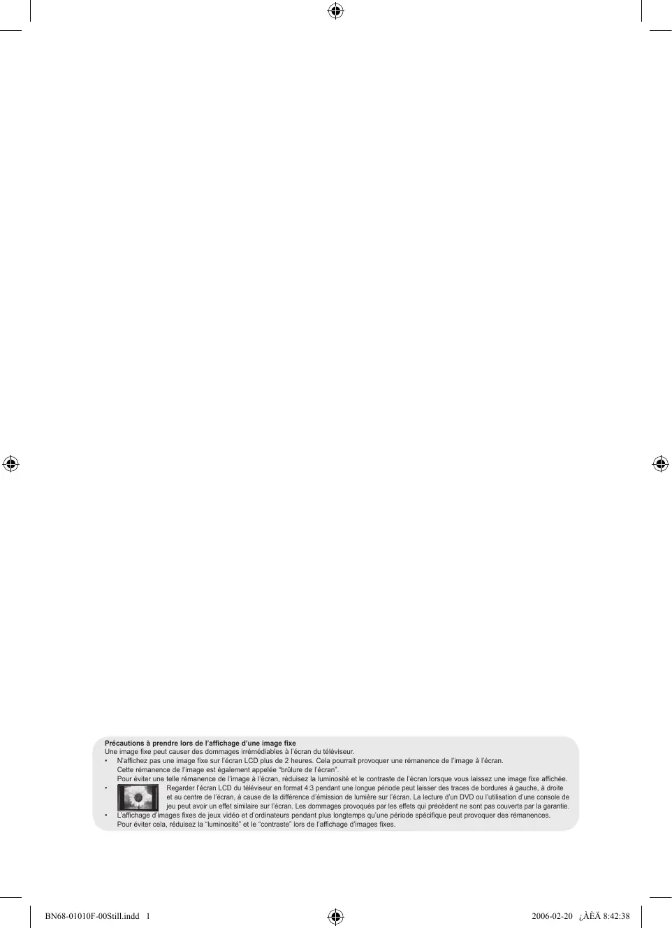 AFFICHAGE PC IMAGE DANS L’IMAGE (PIP) TELETEXTE Ce périphérique est un appareil numérique de classe B. BN68-01010F-00 BN68-01010F-00Cover.indd 1 Enregistrez vos produits Samsung en vous connectant sur : www.samsung.com/global/register 2006-02-24 ¿ÀÀü 8:56:57 Précautions à prendre lors de l’affichage d’une image fixe Une image fixe peut causer des dommages irrémédiables à l’écran du téléviseur.