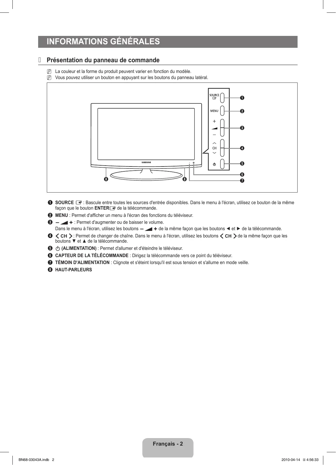 ❑❑ Précautions à prendre lors de l'affichage d'une image fixe Une image fixe peut occasionner des dommages irrémédiables à l'écran du téléviseur. ●● N'affichez pas d'image fixe ou partiellement fixe sur l'écran LCD pendant plus de 2 heures car cela pourrait provoquer une rémanence de l'image à l'écran. Cette rémanence de l'image est également appelée "brûlure de l'écran". Pour l'éviter, réduisez la luminosité et le contraste de l'écran lorsque vous affichez une image fixe. L'affichage sur l'écran LCD du téléviseur d'images au format 4:3 pendant une période prolongée peut laisser des traces de bordures à gauche, à droite et au centre de l'écran, dues à la différence d'émission de lumière sur celui-ci. La lecture d'un DVD ou l'utilisation d'une console de jeu peut avoir un effet similaire sur l'écran. Les dommages occasionnés par l'effet précité ne sont pas couverts par la garantie. ●● L'affichage d'images fixes de jeux vidéo et d'ordinateurs pendant une période excessive peut produire des rémanences. Pour éviter cela, réduisez la "luminosité" et le "contraste" lors de l'affichage d'images fixes. © 2010 Samsung Electronics Co., Ltd. Tous droits réservés. BN68-03043A.indb 1 2010-04-14 4:56:33 Contenu