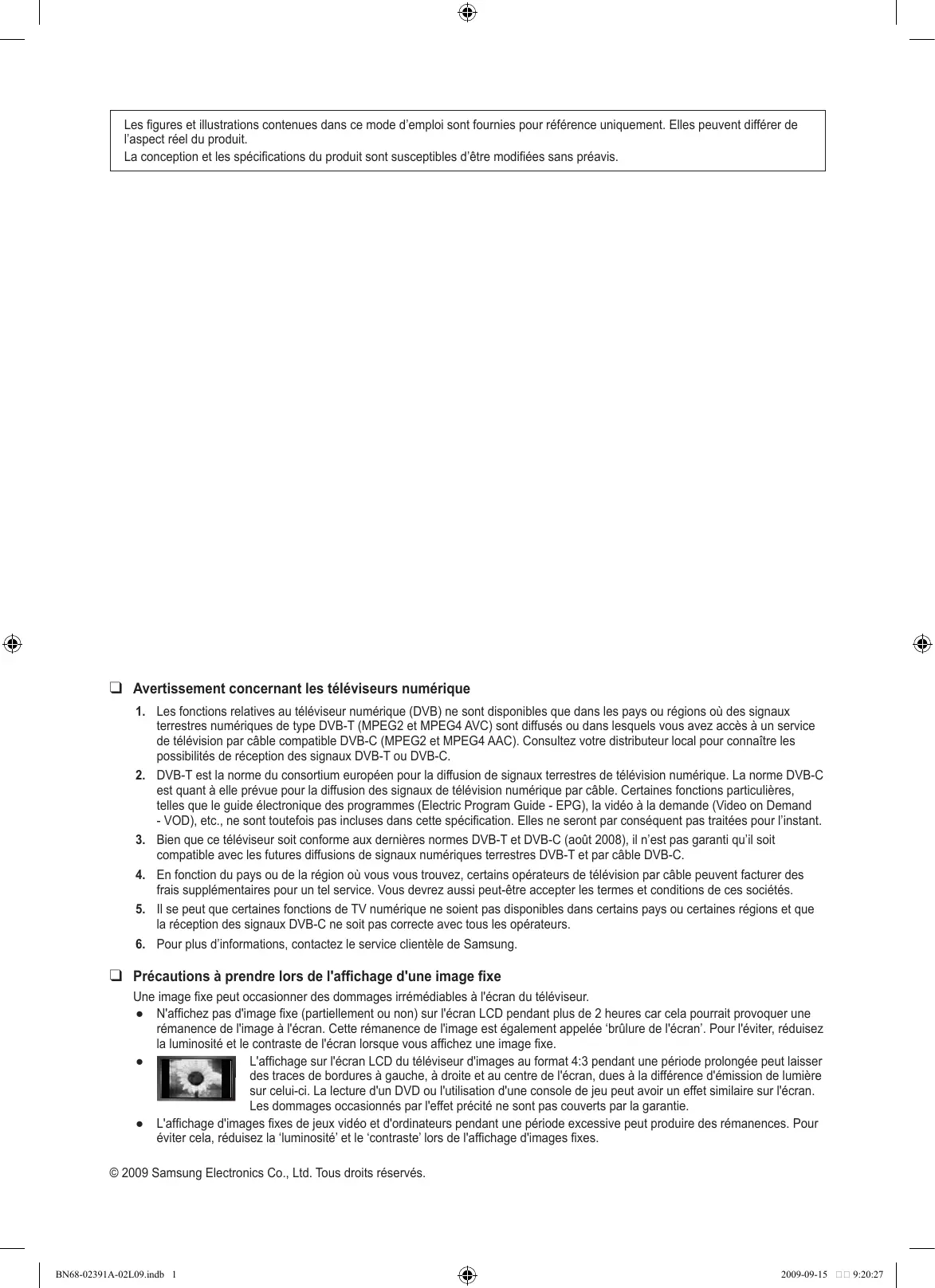 - ❑ Précautions à prendre lors de l'affichage d'une image fixe Une image fixe peut occasionner des dommages irrémédiables à l'écran du téléviseur. ● N'affichez pas d'image fixe (partiellement ou non) sur l'écran LCD pendant plus de 2 heures car cela pourrait provoquer une rémanence de l'image à l'écran. Cette rémanence de l'image est également appelée ‘brûlure de l'écran’. Pour l'éviter, réduisez la luminosité et le contraste de l'écran lorsque vous affichez une image fixe. L'affichage sur l'écran LCD du téléviseur d'images au format 4:3 pendant une période prolongée peut laisser des traces de bordures à gauche, à droite et au centre de l'écran, dues à la différence d'émission de lumière sur celui-ci. La lecture d'un DVD ou l'utilisation d'une console de jeu peut avoir un effet similaire sur l'écran. Les dommages occasionnés par l'effet précité ne sont pas couverts par la garantie. ● L'affichage d'images fixes de jeux vidéo et d'ordinateurs pendant une période excessive peut produire des rémanences. Pour éviter cela, réduisez la ‘luminosité’ et le ‘contraste’ lors de l'affichage d'images fixes. © 2009 Samsung Electronics Co., Ltd. Tous droits réservés. BN68-02391A-02L09.indb 1 2009-09-15 9:20:27 Contenu FONCTIONNEMENT ■ Affichage des menus p. 7