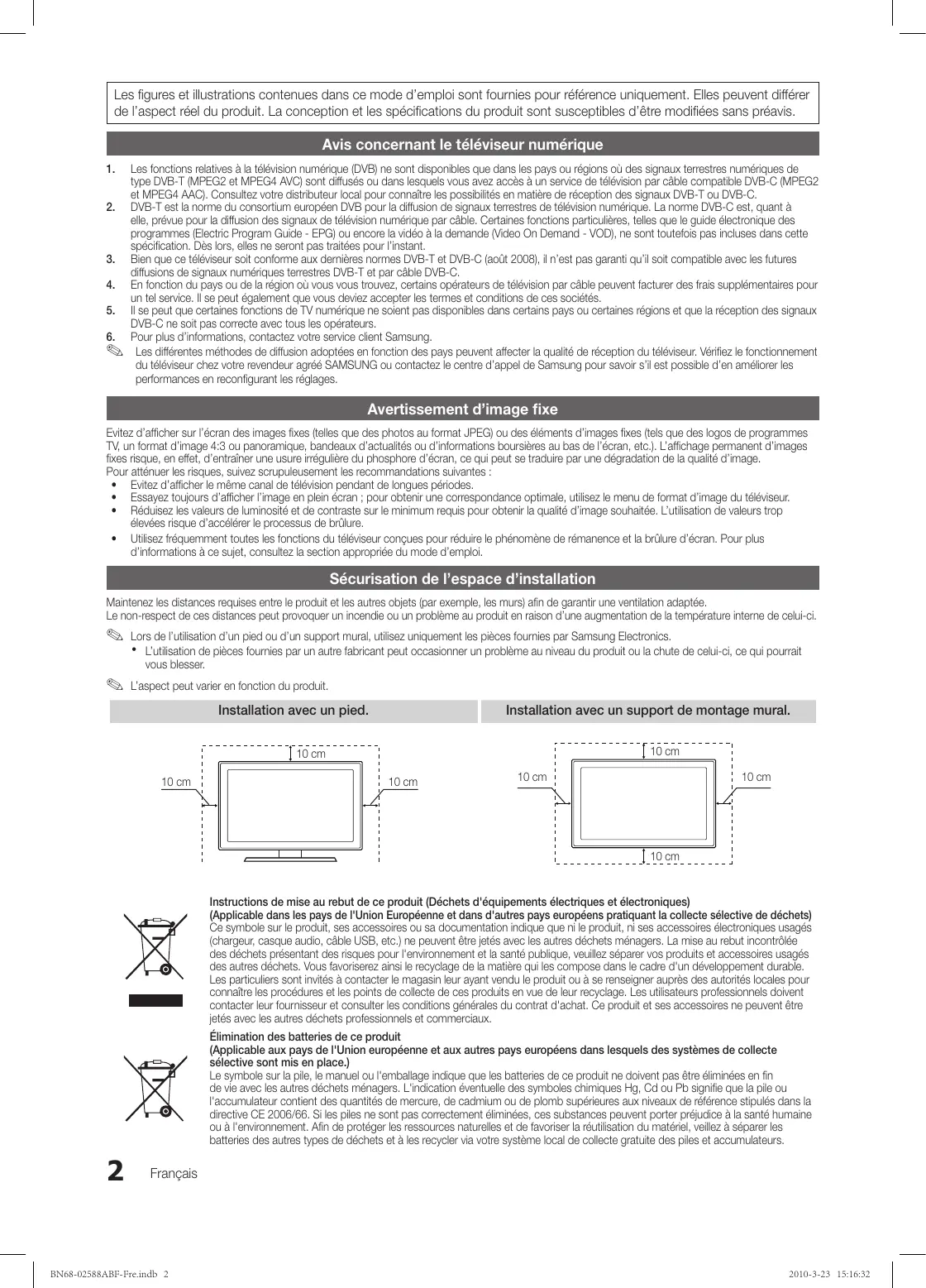 2010-3-19 15:42:21 This page is intentionally left blank. BN68-02588F_Eng.indb 34 2010-3-19 15:42:21 Les figures et illustrations contenues dans ce mode d’emploi sont fournies pour référence uniquement. Elles peuvent différer de l’aspect réel du produit. La conception et les spécifications du produit sont susceptibles d’être modifiées sans préavis. Avis concernant le téléviseur numérique Les fonctions relatives à la télévision numérique (DVB) ne sont disponibles que dans les pays ou régions où des signaux terrestres numériques de type DVB-T (MPEG2 et MPEG4 AVC) sont diffusés ou dans lesquels vous avez accès à un service de télévision par câble compatible DVB-C (MPEG2 et MPEG4 AAC). Consultez votre distributeur local pour connaître les possibilités en matière de réception des signaux DVB-T ou DVB-C. 2. DVB-T est la norme du consortium européen DVB pour la diffusion de signaux terrestres de télévision numérique. La norme DVB-C est, quant à elle, prévue pour la diffusion des signaux de télévision numérique par câble. Certaines fonctions particulières, telles que le guide électronique des programmes (Electric Program Guide - EPG) ou encore la vidéo à la demande (Video On Demand - VOD), ne sont toutefois pas incluses dans cette spécification. Dès lors, elles ne seront pas traitées pour l’instant. 3. Bien que ce téléviseur soit conforme aux dernières normes DVB-T et DVB-C (août 2008), il n’est pas garanti qu’il soit compatible avec les futures diffusions de signaux numériques terrestres DVB-T et par câble DVB-C. 4. En fonction du pays ou de la région où vous vous trouvez, certains opérateurs de télévision par câble peuvent facturer des frais supplémentaires pour un tel service. Il se peut également que vous deviez accepter les termes et conditions de ces sociétés. 5. Il se peut que certaines fonctions de TV numérique ne soient pas disponibles dans certains pays ou certaines régions et que la réception des signaux DVB-C ne soit pas correcte avec tous les opérateurs.