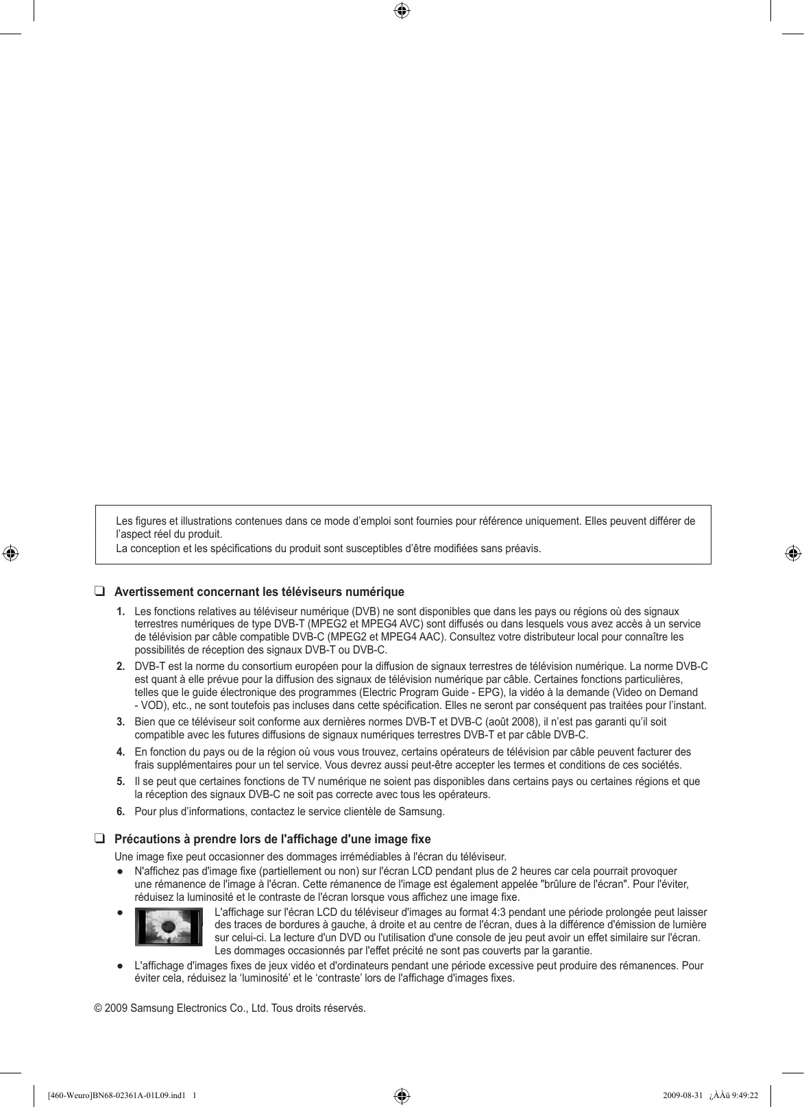 Les figures et illustrations contenues dans ce mode d’emploi sont fournies pour référence uniquement. Elles peuvent différer de l’aspect réel du produit. La conception et les spécifications du produit sont susceptibles d’être modifiées sans préavis. ❑ Avertissement concernant les téléviseurs numérique