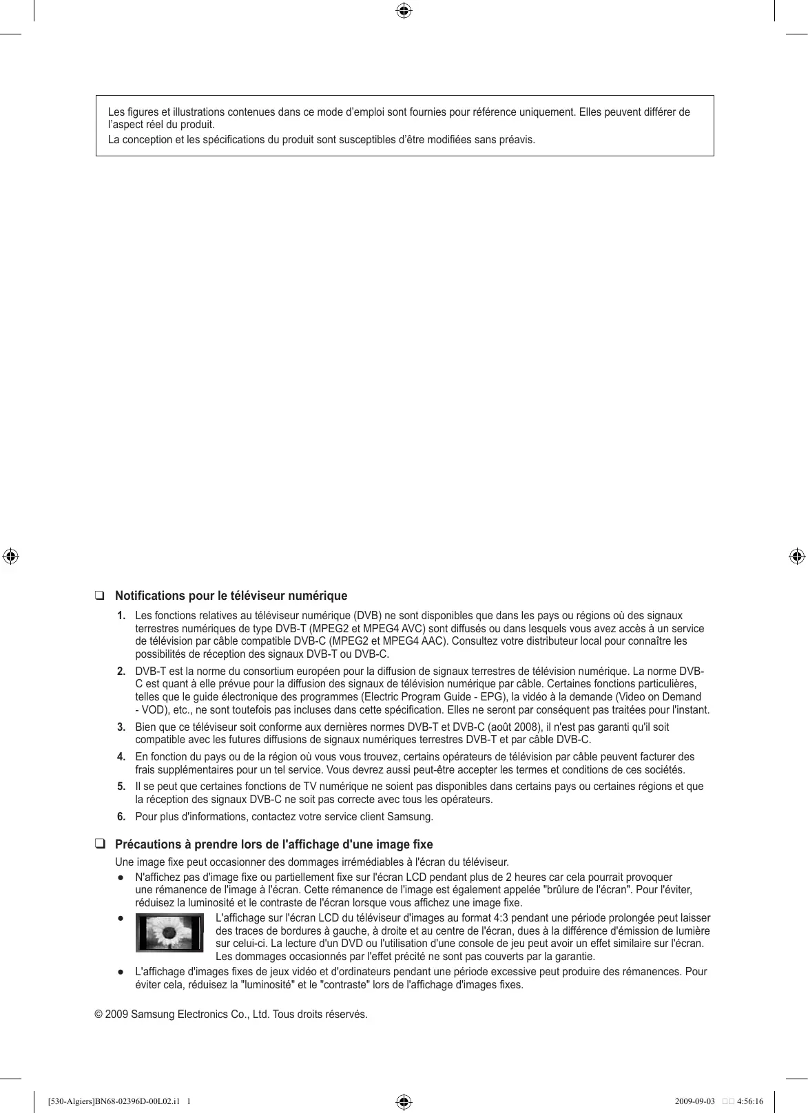 ❑ Précautions à prendre lors de l'affichage d'une image fixe Une image fixe peut occasionner des dommages irrémédiables à l'écran du téléviseur. ● N'affichez pas d'image fixe ou partiellement fixe sur l'écran LCD pendant plus de 2 heures car cela pourrait provoquer une rémanence de l'image à l'écran. Cette rémanence de l'image est également appelée "brûlure de l'écran". Pour l'éviter, réduisez la luminosité et le contraste de l'écran lorsque vous affichez une image fixe. L'affichage sur l'écran LCD du téléviseur d'images au format 4:3 pendant une période prolongée peut laisser des traces de bordures à gauche, à droite et au centre de l'écran, dues à la différence d'émission de lumière sur celui-ci. La lecture d'un DVD ou l'utilisation d'une console de jeu peut avoir un effet similaire sur l'écran. Les dommages occasionnés par l'effet précité ne sont pas couverts par la garantie. ● L'affichage d'images fixes de jeux vidéo et d'ordinateurs pendant une période excessive peut produire des rémanences. Pour éviter cela, réduisez la "luminosité" et le "contraste" lors de l'affichage d'images fixes. © 2009 Samsung Electronics Co., Ltd. Tous droits réservés. [530-Algiers]BN68-02396D-00L02.i1 1 2009-09-03 4:56:16 Contenu