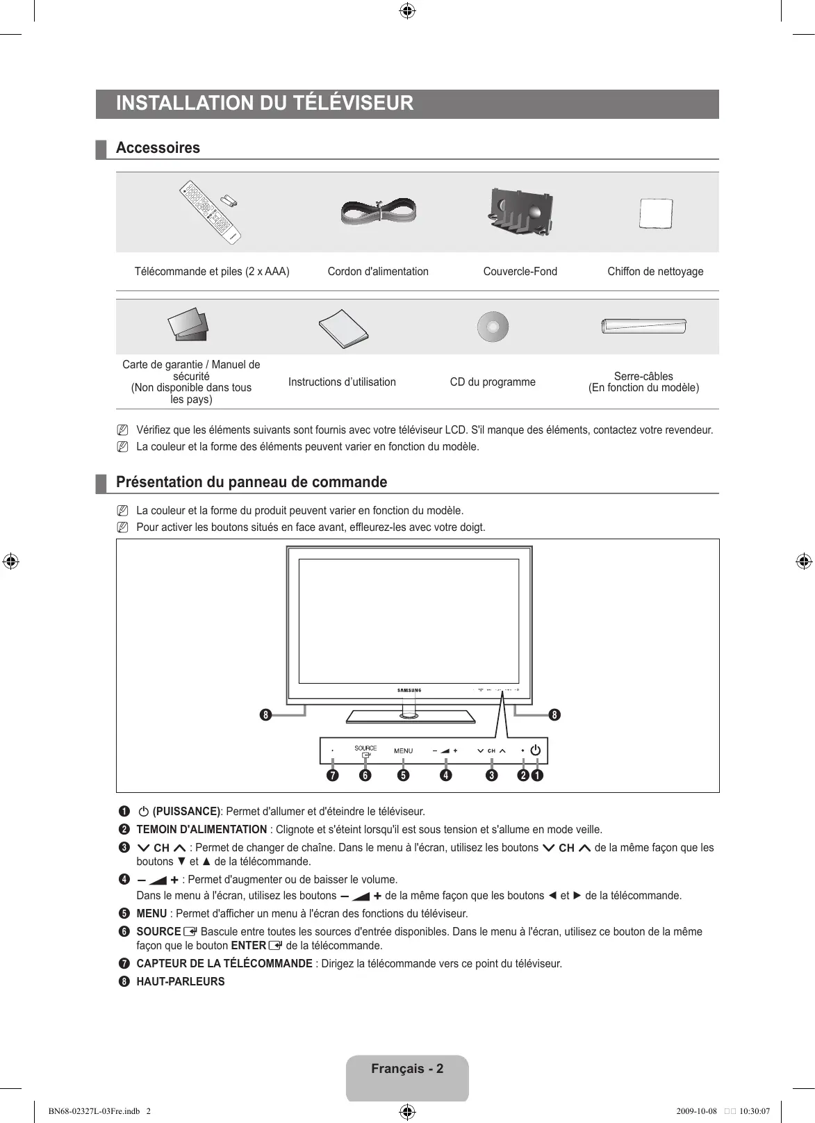 Remarque Bouton tactile Bouton TOOLS Appuyez sur Installation du téléviseur ¦ Accessoires Télécommande et piles (2 x AAA) Carte de garantie / Manuel de sécurité (Non disponible dans tous les pays) Cordon d'alimentation Couvercle-Fond Instructions d’utilisation Chiffon de nettoyage Serre-câbles (En fonction du modèle) CD du programme N Vérifiez que les éléments suivants sont fournis avec votre téléviseur LCD. S'il manque des éléments, contactez votre revendeur. N La couleur et la forme des éléments peuvent varier en fonction du modèle. ¦ Présentation du panneau de commande N La couleur et la forme du produit peuvent varier en fonction du modèle. N Pour activer les boutons situés en face avant, effleurez-les avec votre doigt.