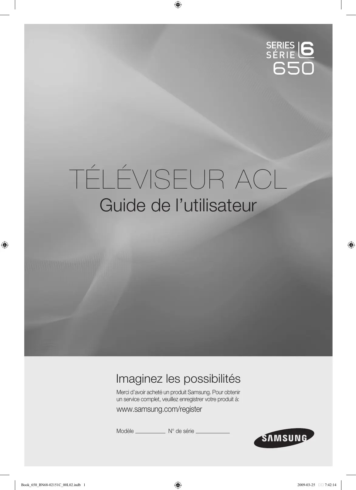 • Guide de l’utilisateur Imaginez les possibilités Merci d’avoir acheté un produit Samsung. Pour obtenir un service complet, veuillez enregistrer votre produit à: www.samsung.com/register Modèle Book_650_BN68-02151C_00L02.indb 1 N° de série 2009-03-25 7:42:14 ❑ Remarques importantes sur la garantie relative au format de l'image du téléviseur N Voir le bon de garantie pour avoir plus d'information sur les conditions de garantie. Le format écran large des écrans ACL (16:9, soit le rapport hauteur/largeur de l'image) est conçu principalement pour les vidéos plein écran à écran large. Les images affichées devraient être en format écran large 16:9 ou agrandi afin de remplir l'écran si votre modèle offre cette caractéristique et que les images sont constamment en mouvement. L’affichage de graphiques et d’images fixes, comme les barres noires des vidéos et des programmes de télévision en format standard non agrandi doit être limité au maximum à 5 % du temps d’écoute hebdomadaire. De plus, il faut limiter l'affichage d'images et de textes fixes, comme les rapports boursiers, les affichages de jeux vidéo, les logos des stations, les sites Web ou les images graphiques et les schémas des ordinateurs, tel qu'indiqué ci-dessus, et ce pour tous les téléviseurs. L'affichage d'images fixes qui ne respecte pas les directives ci-dessus peut causer un vieillissement inégal des écrans ACL en y créant des images fantômes subtiles mais permanentes. Pour éviter ce problème, faites varier les émissions et les images et regardez principalement des images plein écran en mouvement et non pas des images ou des barres foncées fixes. Dans les modèles d'écran à plasma qui offrent des caractéristiques de format d'image, utiliser ces commandes pour obtenir différents formats en plein écran. Prendre garde au choix des formats et à leur durée d'utilisation. Le vieillissement inégal de l’affichage ACL résultant du choix et de l’utilisation d’un format n’est pas couvert par la garantie limitée de Samsung; les images rémanentes en sont également exclues. ● États-Unis seulement L'appareil qui accompagne ce guide de l'utilisateur est fabriqué sous licence en vertu de droits de propriété intellectuelle de certaines tierces parties. Ce produit est protégé en vertu des brevets américains suivants : 5 991 715, 5 740 317, 4 972 484, 5 214 678, 5 323 396, 5 539 829, 5 606 618, 5 530 655, 5 777 992, 6 289 308, 5 610 985, 5 481 643, 5 544 247, 5 960 037, 6 023 490, 5 878 080, et en vertu de la demande de brevet nº 2001-44713-A1 publiée aux États-Unis. Cette licence permet aux consommateurs d'utiliser le contenu sous licence à des fins non commerciales. Aucun droit n'est accordé à l'égard d'une utilisation commerciale. Cette licence ne couvre aucun autre appareil que celui-ci et ne s'applique pas aux produits non pourvus d'une licence ni à tout processus conforme à la norme ISO/IEC 11172-3 ou ISO/IEC 13818-3 utilisé ou vendu de pair avec ce produit. La licence ne couvre que l'utilisation de cet appareil à des fins d'encodage et/ou de décodage de fichiers audio conformément à la norme ISO/IEC 11172-3 ou ISO/IEC 13818-3. Aucun droit n'est accordé en vertu de cette licence en ce qui a trait aux caractéristiques ou fonctions du produit qui ne sont pas conformes à la norme ISO/IEC 11172-3 ou ISO/IEC 13818-3. ● Autres pays L'appareil qui accompagne ce guide de l'utilisateur est fabriqué sous licence en vertu de droits de propriété intellectuelle de certaines tierces parties. Cette licence permet aux consommateurs d'utiliser le contenu sous licence à des fins non commerciales. Aucun droit n'est accordé à l'égard d'une utilisation commerciale. Cette licence ne couvre aucun autre appareil que celui-ci et ne s'applique pas aux produits non pourvus d'une licence ni à tout processus conforme à la norme ISO/IEC 11172-3 ou ISO/IEC 13818-3 utilisé ou vendu de pair avec ce produit. La licence ne couvre que l'utilisation de cet appareil à des fins d'encodage et/ou de décodage de fichiers audio conformément à la norme ISO/IEC 11172-3 ou ISO/IEC 13818-3. Aucun droit n'est accordé en vertu de cette licence en ce qui a trait aux caractéristiques ou fonctions du produit qui ne sont pas conformes à la norme ISO/IEC 11172-3 ou ISO/IEC 138183. ● ÉNONCÉ DE GARANTIE LIMITÉE DE SAMSUNG ELECTRONICS POUR L'AMÉRIQUE DU NORD Assujettie aux exigences, conditions, exclusions et limitations de la garantie limitée originale fournie avec les produits de Samsung Electronics (SAMSUNG) et les exigences, conditions, exclusions et limitations de la présente garantie, SAMSUNG offrira en plus un service de réparation sous garantie aux États-Unis pour les produits achetés au Canada et un service de réparation sous garantie au Canada pour les produits achetés aux États-Unis pendant la période de garantie précisée à l'origine et pour l'acheteur initial seulement. Les réparations sous garantie décrites ci-dessus doivent être effectuées dans un centre de réparation agréé SAMSUNG. En plus de la présente garantie, la garantie limitée originale et une facture datée en tant que preuve d'achat doivent être présentées au centre de réparation. Le transport de l'appareil au et à partir du centre de réparation demeure la responsabilité de l'acheteur. Les conditions couvertes ne sont limitées qu'aux vices de matériaux et de fabrication dans des conditions d'utilisation normale. Sont exclues notamment les dispositions précisées à l’origine pour le service à domicile ou sur place, les durées de réparation minimale et maximale, les échanges ou remplacements, les accessoires, les options, les extensions ou les produits remplacés périodiquement. Pour obtenir le nom d'un centre de réparation agréé Samsung, composez sans frais : N Aux États-Unis : 1-800-SAMSUNG (1-800-726-7864) N Au Canada : 1-800-SAMSUNG ❑ Précautions à pren