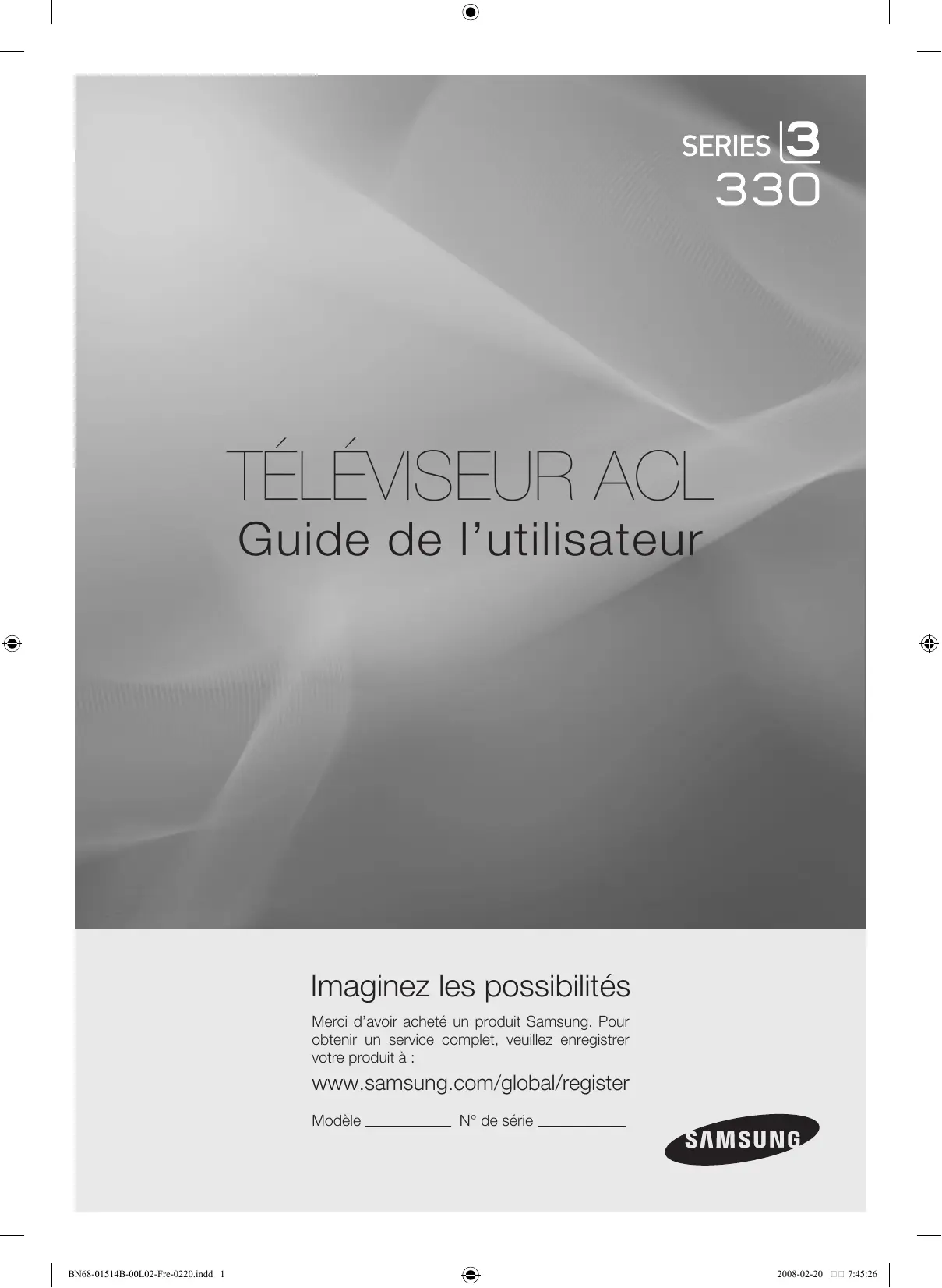 Guide de l’utilisateur Imaginez les possibilités Merci d’avoir acheté un produit Samsung. Pour obtenir un service complet, veuillez enregistrer votre produit à : www.samsung.com/global/register Modèle BN68-01514B-00L02-Fre-0220.indd 1 N° de série 2008-02-20 7:45:26 Remarques importantes sur la garantie relative au format de l'image du téléviseur Le format écran large des écrans ACL (16:9, soit le rapport hauteur/largeur de l’image) est conçu principalement pour les vidéos plein écran à écran large. Les images affichées devraient être en format écran large 16:9 ou agrandi afin de remplir l’écran si votre modèle offre cette caractéristique et que les images sont constamment en mouvement. L’affichage de graphiques et d’images fixes, comme les barres noires des vidéos et des programmes de télévision en format standard non agrandi doit être limité au maximum à 5 % du temps d’écoute hebdomadaire. De plus, il faut limiter l’affichage d’images et de textes fixes, comme les rapports boursiers, les affichages de jeux vidéo, les logos des stations, les sites Web ou les images graphiques et les schémas des ordinateurs, tel qu'indiqué ci-dessus, et ce pour tous les téléviseurs. L’affichage d’images fixes qui ne respecte pas les directives ci-dessus peut causer un vieillissement inégal des écrans ACL en y créant des images fantôme subtiles mais permanentes. Pour éviter ce problème, faites varier les émissions et les images et regarder principalement des images plein écran en mouvement et non pas des images ou des barres foncées fixes. Dans les modèles d’écran à plasma qui offrent des caractéristiques de format d’image, utiliser ces commandes pour obtenir différents formats en plein écran. Prendre garde au choix des formats et à leur durée d’utilisation. Un vieillissement inégal résultant du choix et de l’utilisation d’un format, tout comme les images rémanentes, ne sont pas couverts par la garantie limitée de Samsung. États-Unis seulement L’appareil qui accompagne ce guide de l’utilisateur est fabriqué sous licence en vertu de droits de propriété intellectuelle de certaines tierces parties. Ce produit est protégé en vertu des brevets américains suivants : 5 991 715, 5 740 317, 4 972 484, 5 214 678, 5 323 396, 5 539 829, 5 606 618, 5 530 655, 5 777 992, 6 289 308, 5 610 985, 5 481 643, 5 544 247, 5 960 037, 6 023 490, 5 878 080, et en vertu de la demande de brevet nº 2001-44713-A1 publiée aux États-Unis. Cette licence permet aux consommateurs d’utiliser le contenu sous licence à des fins non commerciales. Aucun droit n’est accordé à l’égard d’une utilisation commerciale. Cette licence ne couvre aucun autre appareil que celui-ci et ne s’applique pas aux produits non pourvus d’une licence ni à tout processus conforme à la norme ISO/IEC 11172-3 ou ISO/IEC 13818-3 utilisé ou vendu de pair avec ce produit. La licence ne couvre que l’utilisation de cet appareil à des fins d’encodage et/ou de décodage de fichiers audio conformément à la norme ISO/IEC 11172-3 ou ISO/IEC 13818-3. Aucun droit n’est accordé en vertu de cette licence en ce qui a trait aux caractéristiques ou fonctions du produit qui ne sont pas conformes à la norme ISO/IEC 11172-3 ou ISO/IEC 13818-3. Autres pays L’appareil qui accompagne ce guide de l’utilisateur est fabriqué sous licence en vertu de droits de propriété intellectuelle de certaines tierces parties. Cette licence permet aux consommateurs d’utiliser le contenu sous licence à des fins non commerciales. Aucun droit n’est accordé à l’égard d’une utilisation commerciale. Cette licence ne couvre aucun autre appareil que celui-ci et ne s’applique pas aux produits non pourvus d’une licence ni à tout processus conforme à la norme ISO/IEC 11172-3 ou ISO/IEC 13818-3 utilisé ou vendu de pair avec ce produit. La licence ne couvre que l’utilisation de cet appareil à des fins d’encodage et/ou de décodage de fichiers audio conformément à la norme ISO/IEC 11172-3 ou ISO/IEC 13818-3. Aucun droit n’est accordé en vertu de cette licence en ce qui a trait aux caractéristiques ou fonctions du produit qui ne sont pas conformes à la norme ISO/IEC 11172-3 ou ISO/IEC 13818-3. SAMSUNG ELECTRONICS GARANTIE LIMITÉE POUR L’AMÉRIQUE DU NORD Assujettie aux exigences, conditions, exclusions et limitations de la garantie limitée originale fournie avec les produits de Samsung Electronics (SAMSUNG) et les exigences, conditions, exclusions et limitations de la présente garantie, SAMSUNG offrira en plus un service de réparation sous garantie aux États-Unis pour les produits achetés au Canada et un service de réparation sous garantie au Canada pour les produits achetés aux États-Unis pendant la période de garantie précisée à l’origine et pour l’acheteur initial seulement. Les réparations sous garantie décrites ci-dessus doivent être effectuées dans un centre de réparation agréé SAMSUNG. En plus de la présente garantie, la garantie limitée originale et une facture datée en tant que preuve d’achat doivent être présentées au centre de réparation. Le transport de l’appareil au et à partir du centre de réparation demeure la responsabilité de l’acheteur. Les conditions couvertes ne sont limitées qu’aux vices de matériaux et de fabrication dans des conditions d’utilisation normale. Exclues, mais non pas limitées à, sont les dispositions précisées à l’origine pour le service à domicile ou sur place, durées de réparation minimales et maximales, échanges ou remplacements, accessoires, options, extensions ou produits non durables. Pour obtenir le nom d’un centre de réparation agréé Samsung, appelez sans frais: Aux États-Unis : 1-800-SAMSUNG (1-800-726-7864) Au Canada : 1-800-SAMSUNG Précautions à prendre lors de l’affichage d’une image fixe Une image fixe peut causer des dommages irrémédiabl