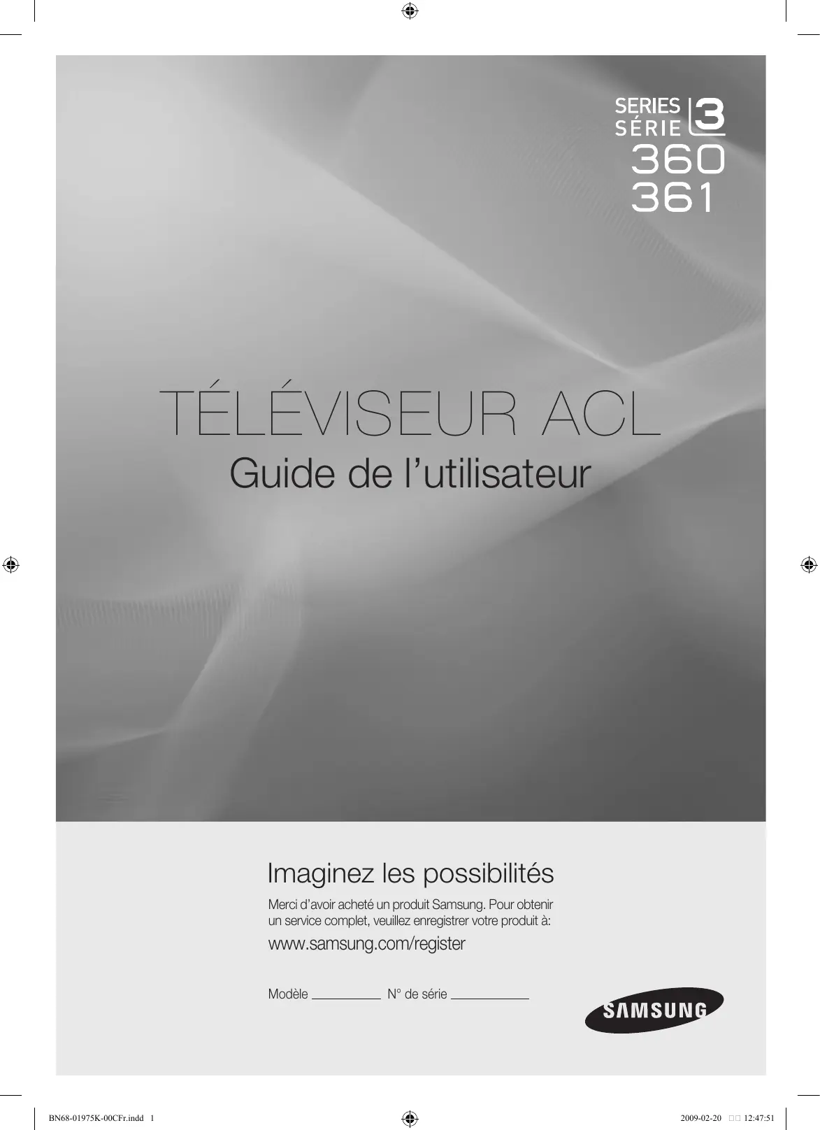 - Guide de l’utilisateur Imaginez les possibilités Merci d’avoir acheté un produit Samsung. Pour obtenir un service complet, veuillez enregistrer votre produit à: www.samsung.com/register Modèle BN68-01975K-00CFr.indd 1 N° de série 2009-02-20 12:47:51 ❑ Remarques importantes sur la garantie relative au format de l'image du téléviseur N Voir le bon de garantie pour avoir plus d'information sur les conditions de garantie. Le format écran large des écrans ACL (16:9, soit le rapport hauteur/largeur de l'image) est conçu principalement pour les vidéos plein écran à écran large. Les images affichées devraient être en format écran large 16:9 ou agrandi afin de remplir l'écran si votre modèle offre cette caractéristique et que les images sont constamment en mouvement. L’affichage de graphiques et d’images fixes, comme les barres noires des vidéos et des programmes de télévision en format standard non agrandi doit être limité au maximum à 5 % du temps d’écoute hebdomadaire. De plus, il faut limiter l'affichage d'images et de textes fixes, comme les rapports boursiers, les affichages de jeux vidéo, les logos des stations, les sites Web ou les images graphiques et les schémas des ordinateurs, tel qu'indiqué ci-dessus, et ce pour tous les téléviseurs. L'affichage d'images fixes qui ne respecte pas les directives ci-dessus peut causer un vieillissement inégal des écrans ACL en y créant des images fantômes subtiles mais permanentes. Pour éviter ce problème, faites varier les émissions et les images et regardez principalement des images plein écran en mouvement et non pas des images ou des barres foncées fixes. Dans les modèles d'écran à plasma qui offrent des caractéristiques de format d'image, utiliser ces commandes pour obtenir différents formats en plein écran. Prendre garde au choix des formats et à leur durée d'utilisation. Le vieillissement inégal de l’affichage ACL résultant du choix et de l’utilisation d’un format n’est pas couvert par la garantie limitée de Samsung; les images rémanentes en sont également exclues. ● États-Unis seulement L'appareil qui accompagne ce guide de l'utilisateur est fabriqué sous licence en vertu de droits de propriété intellectuelle de certaines tierces parties. Ce produit est protégé en vertu des brevets américains suivants : 5 991 715, 5 740 317, 4 972 484, 5 214 678, 5 323 396, 5 539 829, 5 606 618, 5 530 655, 5 777 992, 6 289 308, 5 610 985, 5 481 643, 5 544 247, 5 960 037, 6 023 490, 5 878 080, et en vertu de la demande de brevet nº 2001-44713-A1 publiée aux États-Unis. Cette licence permet aux consommateurs d'utiliser le contenu sous licence à des fins non commerciales. Aucun droit n'est accordé à l'égard d'une utilisation commerciale. Cette licence ne couvre aucun autre appareil que celui-ci et ne s'applique pas aux produits non pourvus d'une licence ni à tout processus conforme à la norme ISO/IEC 11172-3 ou ISO/IEC 13818-3 utilisé ou vendu de pair avec ce produit. La licence ne couvre que l'utilisation de cet appareil à des fins d'encodage et/ou de décodage de fichiers audio conformément à la norme ISO/IEC 11172-3 ou ISO/IEC 13818-3. Aucun droit n'est accordé en vertu de cette licence en ce qui a trait aux caractéristiques ou fonctions du produit qui ne sont pas conformes à la norme ISO/IEC 11172-3 ou ISO/IEC 13818-3. ● Autres pays L'appareil qui accompagne ce guide de l'utilisateur est fabriqué sous licence en vertu de droits de propriété intellectuelle de certaines tierces parties. Cette licence permet aux consommateurs d'utiliser le contenu sous licence à des fins non commerciales. Aucun droit n'est accordé à l'égard d'une utilisation commerciale. Cette licence ne couvre aucun autre appareil que celui-ci et ne s'applique pas aux produits non pourvus d'une licence ni à tout processus conforme à la norme ISO/IEC 11172-3 ou ISO/IEC 13818-3 utilisé ou vendu de pair avec ce produit. La licence ne couvre que l'utilisation de cet appareil à des fins d'encodage et/ou de décodage de fichiers audio conformément à la norme ISO/IEC 11172-3 ou ISO/IEC 13818-3. Aucun droit n'est accordé en vertu de cette licence en ce qui a trait aux caractéristiques ou fonctions du produit qui ne sont pas conformes à la norme ISO/IEC 11172-3 ou ISO/IEC 138183. ● ÉNONCÉ DE GARANTIE LIMITÉE DE SAMSUNG ELECTRONICS POUR L'AMÉRIQUE DU NORD Assujettie aux exigences, conditions, exclusions et limitations de la garantie limitée originale fournie avec les produits de Samsung Electronics (SAMSUNG) et les exigences, conditions, exclusions et limitations de la présente garantie, SAMSUNG offrira en plus un service de réparation sous garantie aux États-Unis pour les produits achetés au Canada et un service de réparation sous garantie au Canada pour les produits achetés aux États-Unis pendant la période de garantie précisée à l'origine et pour l'acheteur initial seulement. Les réparations sous garantie décrites ci-dessus doivent être effectuées dans un centre de réparation agréé SAMSUNG. En plus de la présente garantie, la garantie limitée originale et une facture datée en tant que preuve d'achat doivent être présentées au centre de réparation. Le transport de l'appareil au et à partir du centre de réparation demeure la responsabilité de l'acheteur. Les conditions couvertes ne sont limitées qu'aux vices de matériaux et de fabrication dans des conditions d'utilisation normale. Sont exclues notamment les dispositions précisées à l’origine pour le service à domicile ou sur place, les durées de réparation minimale et maximale, les échanges ou remplacements, les accessoires, les options, les extensions ou les produits remplacés périodiquement. Pour obtenir le nom d'un centre de réparation agréé Samsung, composez sans frais : N Aux États-Unis : 1-800-SAMSUNG (1-800-726-7864) N Au Canada : 1-800-SAMSUNG ❑ Précautions à prendre durant