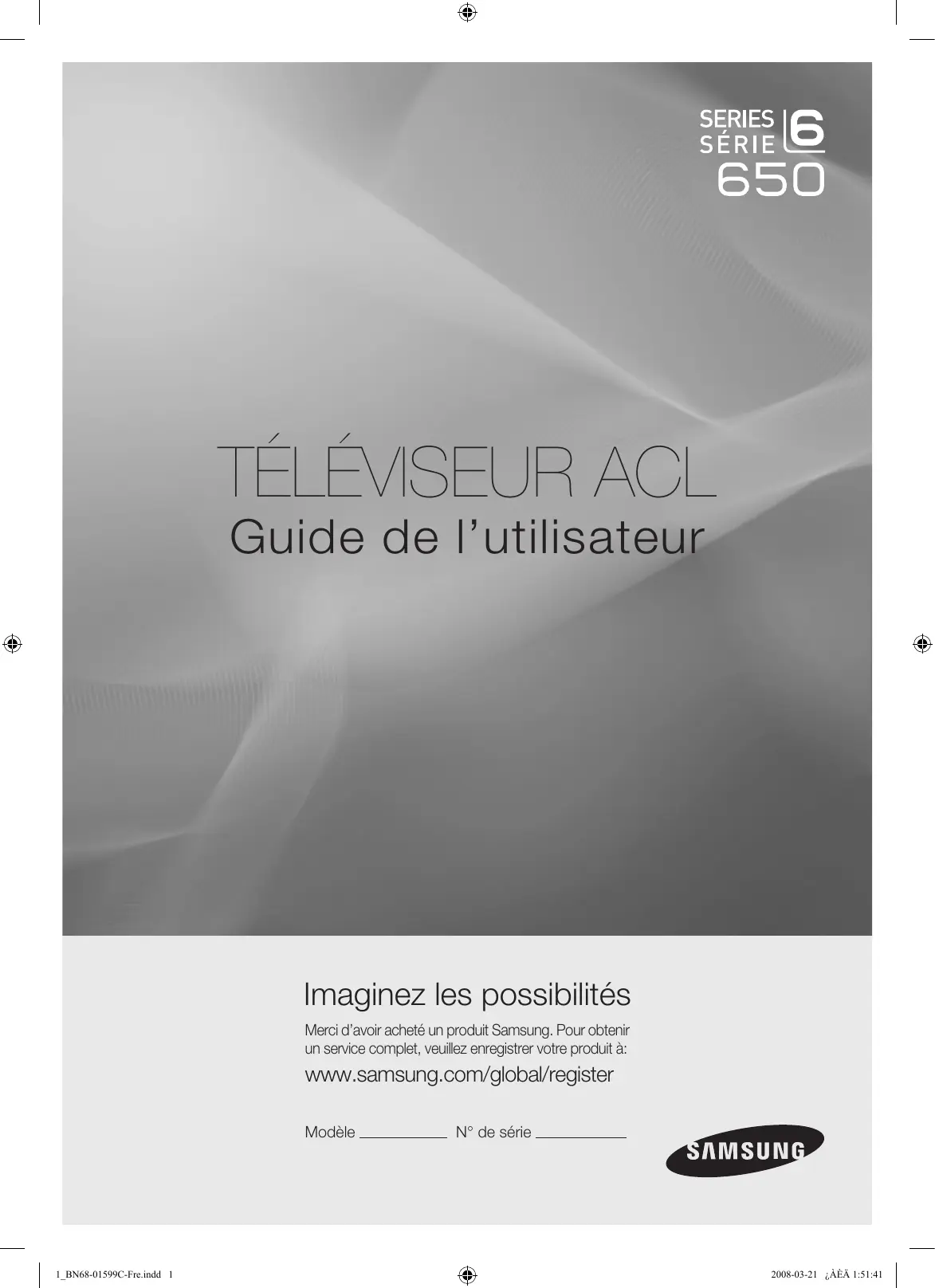 Guide de l’utilisateur Imaginez les possibilités Merci d’avoir acheté un produit Samsung. Pour obtenir un service complet, veuillez enregistrer votre produit à: www.samsung.com/global/register Modèle 1_BN68-01599C-Fre.indd 1 N° de série 2008-03-21 ¿ÀÈÄ 1:51:41 Remarques importantes sur la garantie relative au format de l’image du téléviseur Le format écran large des écrans ACL (16:9, soit le rapport hauteur/largeur de l’image) est conçu principalement pour les vidéos plein écran à écran large. Les images affichées devraient être en format écran large 16:9 ou agrandi afin de remplir l’écran si votre modèle offre cette caractéristique et que les images sont constamment en mouvement. L’affichage de graphiques et d’images fixes, comme les barres noires des vidéos et des programmes de télévision en format standard non agrandi doit être limité au maximum à 5 % du temps d’écoute hebdomadaire. De plus, il faut limiter l’affichage d’images et de textes fixes, comme les rapports boursiers, les affichages de jeux vidéo, les logos des stations, les sites Web ou les images graphiques et les schémas des ordinateurs, tel qu’indiqué ci-dessus, et ce pour tous les téléviseurs. L’affichage d’images fixes qui ne respecte pas les directives ci-dessus peut causer un vieillissement inégal des écrans ACL en y créant des images fantôme subtiles mais permanentes. Pour éviter ce problème, faites varier les émissions et les images et regarder principalement des images plein écran en mouvement et non pas des images ou des barres foncées fixes. Dans les modèles d’écran à plasma qui offrent des caractéristiques de format d’image, utiliser ces commandes pour obtenir différents formats en plein écran. Prendre garde au choix des formats et à leur durée d’utilisation. Un vieillissement inégal résultant du choix et de l’utilisation d’un format, tout comme les images rémanentes, ne sont pas couverts par la garantie limitée de Samsung. États-Unis seulement L’appareil qui accompagne ce guide de l’utilisateur est fabriqué sous licence en vertu de droits de propriété intellectuelle de certaines tierces parties. Ce produit est protégé en vertu des brevets américains suivants : 5 991 715, 5 740 317, 4 972 484, 5 214 678, 5 323 396, 5 539 829, 5 606 618, 5 530 655, 5 777 992, 6 289 308, 5 610 985, 5 481 643, 5 544 247, 5 960 037, 6 023 490, 5 878 080, et en vertu de la demande de brevet nº 2001-44713-A1 publiée aux États-Unis. Cette licence permet aux consommateurs d’utiliser le contenu sous licence à des fins non commerciales. Aucun droit n’est accordé à l’égard d’une utilisation commerciale. Cette licence ne couvre aucun autre appareil que celui-ci et ne s’applique pas aux produits non pourvus d’une licence ni à tout processus conforme à la norme ISO/IEC 11172-3 ou ISO/IEC 13818-3 utilisé ou vendu de pair avec ce produit. La licence ne couvre que l’utilisation de cet appareil à des fins d’encodage et/ou de décodage de fichiers audio conformément à la norme ISO/IEC 11172-3 ou ISO/IEC 13818-3. Aucun droit n’est accordé en vertu de cette licence en ce qui a trait aux caractéristiques ou fonctions du produit qui ne sont pas conformes à la norme ISO/IEC 11172-3 ou ISO/IEC 13818-3. Autres pays L’appareil qui accompagne ce guide de l’utilisateur est fabriqué sous licence en vertu de droits de propriété intellectuelle de certaines tierces parties. Cette licence permet aux consommateurs d’utiliser le contenu sous licence à des fins non commerciales. Aucun droit n’est accordé à l’égard d’une utilisation commerciale. Cette licence ne couvre aucun autre appareil que celui-ci et ne s’applique pas aux produits non pourvus d’une licence ni à tout processus conforme à la norme ISO/IEC 11172-3 ou ISO/IEC 13818-3 utilisé ou vendu de pair avec ce produit. La licence ne couvre que l’utilisation de cet appareil à des fins d’encodage et/ou de décodage de fichiers audio conformément à la norme ISO/IEC 11172-3 ou ISO/IEC 13818-3. Aucun droit n’est accordé en vertu de cette licence en ce qui a trait aux caractéristiques ou fonctions du produit qui ne sont pas conformes à la norme ISO/IEC 11172-3 ou ISO/IEC 13818-3. SAMSUNG ELECTRONICS NORTH AMERICAN LIMITED WARRANTY STATEMENT Assujettie aux exigences, conditions, exclusions et limitations de la garantie limitée originale fournie avec les produits de Samsung Electronics (SAMSUNG) et les exigences, conditions, exclusions et limitations de la présente garantie, SAMSUNG offrira en plus un service de réparation sous garantie aux États-Unis pour les produits achetés au Canada et un service de réparation sous garantie au Canada pour les produits achetés aux États-Unis pendant la période de garantie précisée à l’origine et pour l’acheteur initial seulement. Les réparations sous garantie décrites ci-dessus doivent être effectuées dans un centre de réparation agréé SAMSUNG. En plus de la présente garantie, la garantie limitée originale et une facture datée en tant que preuve d’achat doivent être présentées au centre de réparation. Le transport de l’appareil au et à partir du centre de réparation demeure la responsabilité de l’acheteur. Les conditions couvertes ne sont limitées qu’aux vices de matériaux et de fabrication dans des conditions d’utilisation normale. Exclues, mais non pas limitées à, sont les dispositions précisées à l’origine pour le service à domicile ou sur place, durées de réparation minimales et maximales, échanges ou remplacements, accessoires, options, extensions ou produits non durables. Pour obtenir le nom d’un centre de réparation agréé Samsung, appelez sans frais : Aux États-Unis : 1-800-SAMSUNG (1-800-726-7864) Au Canada : 1-800-SAMSUNG ➣ Voir le bon de garantie pour avoir plus d’information sur les conditions de garantie. Précautions à prendre l