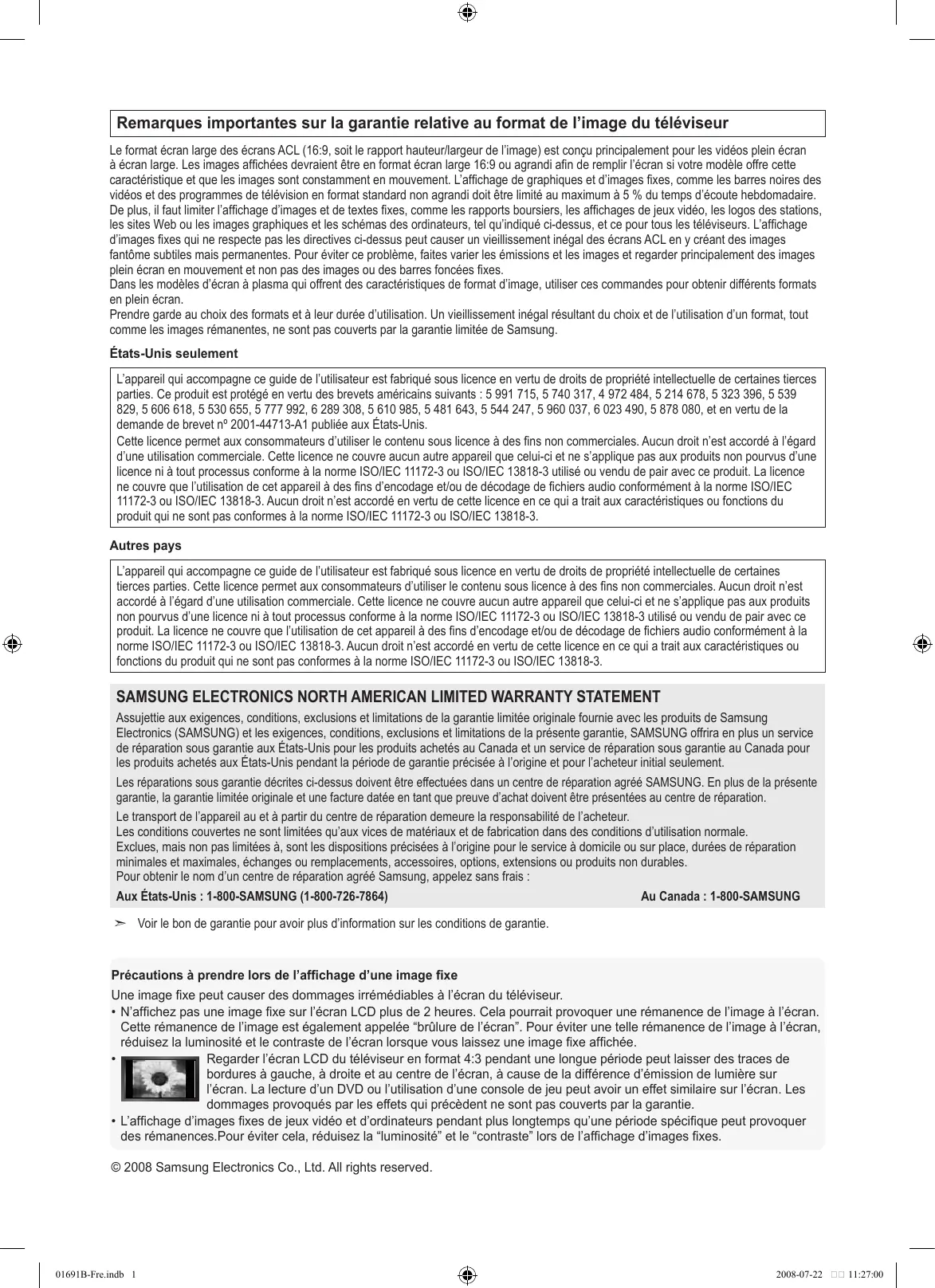 Contact SAMSUNG WORLDWIDE If you have any questions or comments relating to Samsung products, please contact the SAMSUNG customer care center. Comment contacter Samsung dans le monde Si vous avez des suggestions ou des questions concernant les produits Samsung, veuillez contacter le Service Consommateurs Samsung. Country CANADA U.S.A Customer Care Center 1-800-SAMSUNG(726-7864) 1-800-SAMSUNG(726-7864) Web Site www.samsung.com/ca www.samsung.com/us Address Samsung Electronics Canada Inc., Customer Service 55 Standish Court Mississauga, Ontario L5R 4B2 Canada Samsung Electronique Canada Inc., Service à la Clientèle 55 Standish Court Mississauga, Ontario L5R 4B2 Canada Samsung Electronics America, Inc. 105 Challenger Road Ridgefield Park, NJ 07660-0511 LCD TV user manual imagine the possibilities Thank you for purchasing this Samsung product. To receive more complete service, please register your product at www.samsung.com/global/register Model Serial No. BN68-01691B-00 BN68-01691B-Cover.indd 1 2008-08-07 11:24:46 Remarques importantes sur la garantie relative au format de l’image du téléviseur Le format écran large des écrans ACL (16:9, soit le rapport hauteur/largeur de l’image) est conçu principalement pour les vidéos plein écran à écran large. Les images affichées devraient être en format écran large 16:9 ou agrandi afin de remplir l’écran si votre modèle offre cette caractéristique et que les images sont constamment en mouvement. L’affichage de graphiques et d’images fixes, comme les barres noires des vidéos et des programmes de télévision en format standard non agrandi doit être limité au maximum à 5 % du temps d’écoute hebdomadaire. De plus, il faut limiter l’affichage d’images et de textes fixes, comme les rapports boursiers, les affichages de jeux vidéo, les logos des stations, les sites Web ou les images graphiques et les schémas des ordinateurs, tel qu’indiqué ci-dessus, et ce pour tous les téléviseurs. L’affichage d’images fixes qui ne respecte pas les directives ci-dessus peut causer un vieillissement inégal des écrans ACL en y créant des images fantôme subtiles mais permanentes. Pour éviter ce problème, faites varier les émissions et les images et regarder principalement des images plein écran en mouvement et non pas des images ou des barres foncées fixes. Dans les modèles d’écran à plasma qui offrent des caractéristiques de format d’image, utiliser ces commandes pour obtenir différents formats en plein écran. Prendre garde au choix des formats et à leur durée d’utilisation. Un vieillissement inégal résultant du choix et de l’utilisation d’un format, tout comme les images rémanentes, ne sont pas couverts par la garantie limitée de Samsung. États-Unis seulement L’appareil qui accompagne ce guide de l’utilisateur est fabriqué sous licence en vertu de droits de propriété intellectuelle de certaines tierces parties. Ce produit est protégé en vertu des brevets américains suivants : 5 991 715, 5 740 317, 4 972 484, 5 214 678, 5 323 396, 5 539 829, 5 606 618, 5 530 655, 5 777 992, 6 289 308, 5 610 985, 5 481 643, 5 544 247, 5 960 037, 6 023 490, 5 878 080, et en vertu de la demande de brevet nº 2001-44713-A1 publiée aux États-Unis. Cette licence permet aux consommateurs d’utiliser le contenu sous licence à des fins non commerciales. Aucun droit n’est accordé à l’égard d’une utilisation commerciale. Cette licence ne couvre aucun autre appareil que celui-ci et ne s’applique pas aux produits non pourvus d’une licence ni à tout processus conforme à la norme ISO/IEC 11172-3 ou ISO/IEC 13818-3 utilisé ou vendu de pair avec ce produit. La licence ne couvre que l’utilisation de cet appareil à des fins d’encodage et/ou de décodage de fichiers audio conformément à la norme ISO/IEC 11172-3 ou ISO/IEC 13818-3. Aucun droit n’est accordé en vertu de cette licence en ce qui a trait aux caractéristiques ou fonctions du produit qui ne sont pas conformes à la norme ISO/IEC 11172-3 ou ISO/IEC 13818-3. Autres pays L’appareil qui accompagne ce guide de l’utilisateur est fabriqué sous licence en vertu de droits de propriété intellectuelle de certaines tierces parties. Cette licence permet aux consommateurs d’utiliser le contenu sous licence à des fins non commerciales. Aucun droit n’est accordé à l’égard d’une utilisation commerciale. Cette licence ne couvre aucun autre appareil que celui-ci et ne s’applique pas aux produits non pourvus d’une licence ni à tout processus conforme à la norme ISO/IEC 11172-3 ou ISO/IEC 13818-3 utilisé ou vendu de pair avec ce produit. La licence ne couvre que l’utilisation de cet appareil à des fins d’encodage et/ou de décodage de fichiers audio conformément à la norme ISO/IEC 11172-3 ou ISO/IEC 13818-3. Aucun droit n’est accordé en vertu de cette licence en ce qui a trait aux caractéristiques ou fonctions du produit qui ne sont pas conformes à la norme ISO/IEC 11172-3 ou ISO/IEC 13818-3. SAMSUNG ELECTRONICS NORTH AMERICAN LIMITED WARRANTY STATEMENT Assujettie aux exigences, conditions, exclusions et limitations de la garantie limitée originale fournie avec les produits de Samsung Electronics (SAMSUNG) et les exigences, conditions, exclusions et limitations de la présente garantie, SAMSUNG offrira en plus un service de réparation sous garantie aux États-Unis pour les produits achetés au Canada et un service de réparation sous garantie au Canada pour les produits achetés aux États-Unis pendant la période de garantie précisée à l’origine et pour l’acheteur initial seulement. Les réparations sous garantie décrites ci-dessus doivent être effectuées dans un centre de réparation agréé SAMSUNG. En plus de la présente garantie, la garantie limitée originale et une facture datée en tant que preuve d’achat doivent être présentées au centre de réparation. Le transport de l’appareil au et 