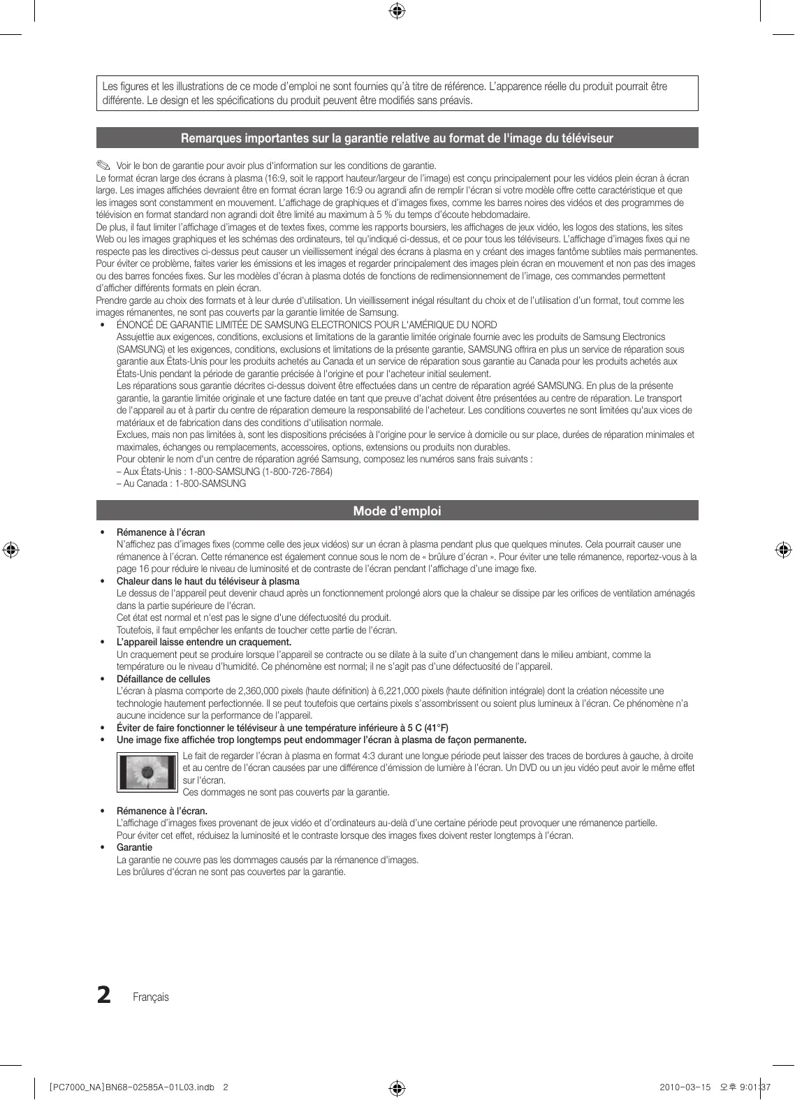 HE-AAC Otras restricciones ✎✎ NOTA No Singer 01:10 / 04:02 Music 4 No Singer Music 5 No Singer SUM www.samsung.com → consumer products → TV → medi@2.0 → Internet@TV www.samsung.com → produits grand public → téléviseurs → medi@2.0 → Internet@TV México Les figures et les illustrations de ce mode d’emploi ne sont fournies qu’à titre de référence. L’apparence réelle du produit pourrait être différente. Le design et les spécifications du produit peuvent être modifiés sans préavis. Remarques importantes sur la garantie relative au format de l'image du téléviseur ✎✎ Voir le bon de garantie pour avoir plus d'information sur les conditions de garantie. Le format écran large des écrans à plasma (16:9, soit le rapport hauteur/largeur de l’image) est conçu principalement pour les vidéos plein écran à écran large. Les images affichées devraient être en format écran large 16:9 ou agrandi afin de remplir l'écran si votre modèle offre cette caractéristique et que les images sont constamment en mouvement. L’affichage de graphiques et d’images fixes, comme les barres noires des vidéos et des programmes de télévision en format standard non agrandi doit être limité au maximum à 5 % du temps d’écoute hebdomadaire. De plus, il faut limiter l’affichage d’images et de textes fixes, comme les rapports boursiers, les affichages de jeux vidéo, les logos des stations, les sites Web ou les images graphiques et les schémas des ordinateurs, tel qu'indiqué ci-dessus, et ce pour tous les téléviseurs. L’affichage d’images fixes qui ne respecte pas les directives ci-dessus peut causer un vieillissement inégal des écrans à plasma en y créant des images fantôme subtiles mais permanentes. Pour éviter ce problème, faites varier les émissions et les images et regarder principalement des images plein écran en mouvement et non pas des images ou des barres foncées fixes. Sur les modèles d’écran à plasma dotés de fonctions de redimensionnement de l’image, ces commandes permettent d’afficher différents formats en plein écran. Prendre garde au choix des formats et à leur durée d'utilisation. Un vieillissement inégal résultant du choix et de l’utilisation d’un format, tout comme les images rémanentes, ne sont pas couverts par la garantie limitée de Samsung.