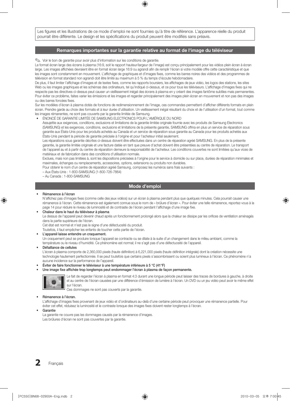 HE-AAC Other Restrictions ✎✎ NOTE No Singer 01:10 / 04:02 Music 4 No Singer Music 5 Les figures et les illustrations de ce mode d’emploi ne sont fournies qu’à titre de référence. L’apparence réelle du produit pourrait être différente. Le design et les spécifications du produit peuvent être modifiés sans préavis. Remarques importantes sur la garantie relative au format de l'image du téléviseur ✎✎ Voir le bon de garantie pour avoir plus d'information sur les conditions de garantie. Le format écran large des écrans à plasma (16:9, soit le rapport hauteur/largeur de l’image) est conçu principalement pour les vidéos plein écran à écran large. Les images affichées devraient être en format écran large 16:9 ou agrandi afin de remplir l'écran si votre modèle offre cette caractéristique et que les images sont constamment en mouvement. L’affichage de graphiques et d’images fixes, comme les barres noires des vidéos et des programmes de télévision en format standard non agrandi doit être limité au maximum à 5 % du temps d’écoute hebdomadaire. De plus, il faut limiter l’affichage d’images et de textes fixes, comme les rapports boursiers, les affichages de jeux vidéo, les logos des stations, les sites Web ou les images graphiques et les schémas des ordinateurs, tel qu'indiqué ci-dessus, et ce pour tous les téléviseurs. L’affichage d’images fixes qui ne respecte pas les directives ci-dessus peut causer un vieillissement inégal des écrans à plasma en y créant des images fantôme subtiles mais permanentes. Pour éviter ce problème, faites varier les émissions et les images et regarder principalement des images plein écran en mouvement et non pas des images ou des barres foncées fixes. Sur les modèles d’écran à plasma dotés de fonctions de redimensionnement de l’image, ces commandes permettent d’afficher différents formats en plein écran. Prendre garde au choix des formats et à leur durée d'utilisation. Un vieillissement inégal résultant du choix et de l’utilisation d’un format, tout comme les images rémanentes, ne sont pas couverts par la garantie limitée de Samsung.