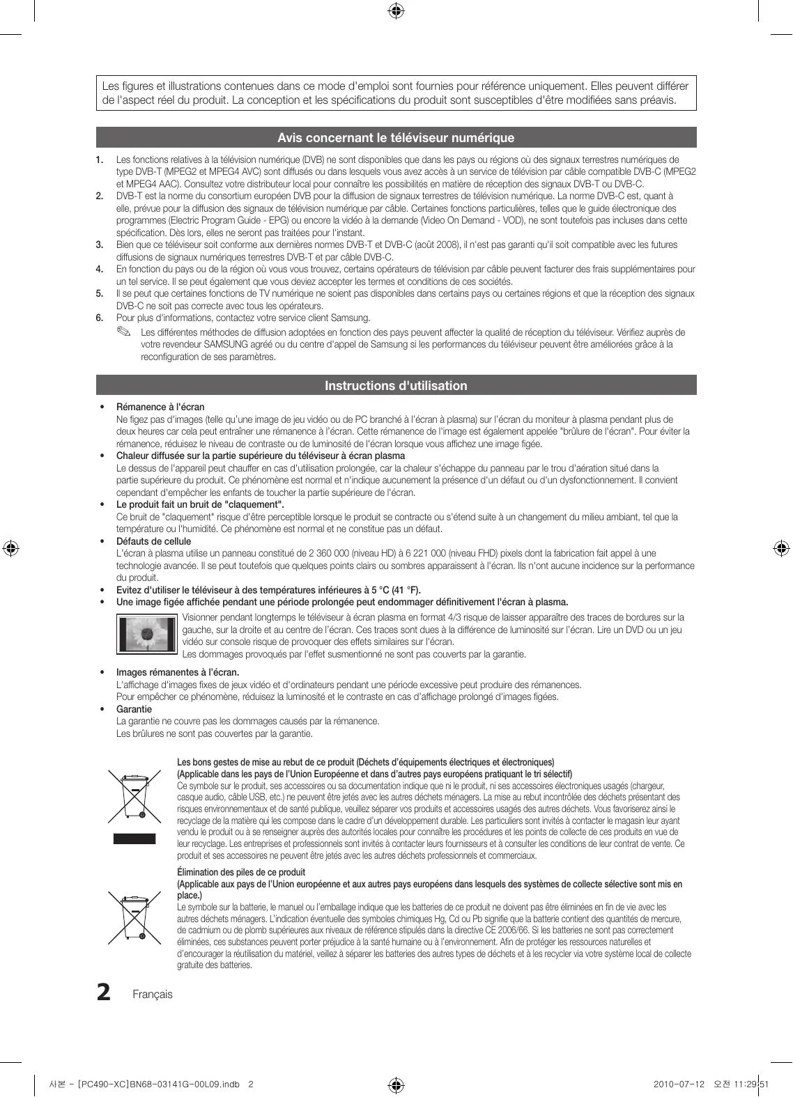Images rémanentes à l’écran. L'affichage d'images fixes de jeux vidéo et d'ordinateurs pendant une période excessive peut produire des rémanences. Pour empêcher ce phénomène, réduisez la luminosité et le contraste en cas d'affichage prolongé d'images figées. Garantie La garantie ne couvre pas les dommages causés par la rémanence. Les brûlures ne sont pas couvertes par la garantie. Les bons gestes de mise au rebut de ce produit (Déchets d’équipements électriques et électroniques) (Applicable dans les pays de l’Union Européenne et dans d’autres pays européens pratiquant le tri sélectif) Ce symbole sur le produit, ses accessoires ou sa documentation indique que ni le produit, ni ses accessoires électroniques usagés (chargeur, casque audio, câble USB, etc.) ne peuvent être jetés avec les autres déchets ménagers. La mise au rebut incontrôlée des déchets présentant des risques environnementaux et de santé publique, veuillez séparer vos produits et accessoires usagés des autres déchets. Vous favoriserez ainsi le recyclage de la matière qui les compose dans le cadre d’un développement durable. Les particuliers sont invités à contacter le magasin leur ayant vendu le produit ou à se renseigner auprès des autorités locales pour connaître les procédures et les points de collecte de ces produits en vue de leur recyclage. Les entreprises et professionnels sont invités à contacter leurs fournisseurs et à consulter les conditions de leur contrat de vente. Ce produit et ses accessoires ne peuvent être jetés avec les autres déchets professionnels et commerciaux. Élimination des piles de ce produit (Applicable aux pays de l’Union européenne et aux autres pays européens dans lesquels des systèmes de collecte sélective sont mis en place.) Le symbole sur la batterie, le manuel ou l’emballage indique que les batteries de ce produit ne doivent pas être éliminées en fin de vie avec les autres déchets ménagers. L’indication éventuelle des symboles chimiques Hg, Cd ou Pb signifie que la batterie contient des quantités de mercure, de cadmium ou de plomb supérieures aux niveaux de référence stipulés dans la directive CE 2006/66. Si les batteries ne sont pas correctement éliminées, ces substances peuvent porter préjudice à la santé humaine ou à l’environnement. Afin de protéger les ressources naturelles et d’encourager la réutilisation du matériel, veillez à séparer les batteries des autres types de déchets et à les recycler via votre système local de collecte gratuite des batteries.