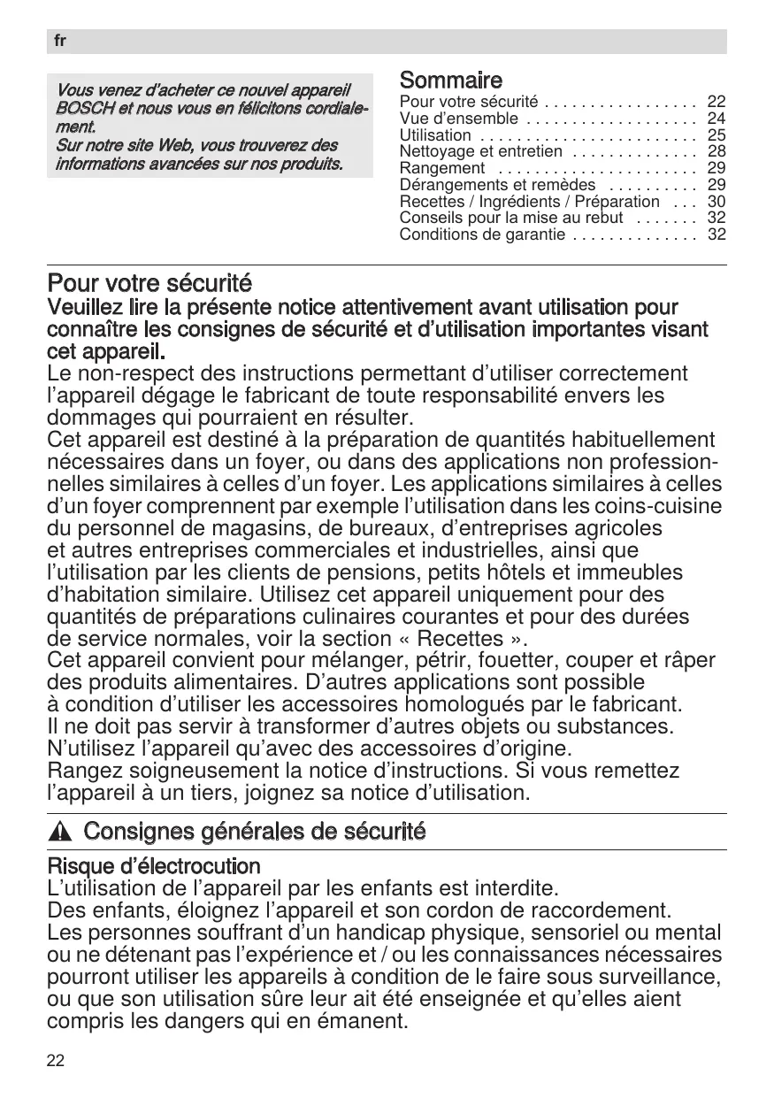 Ne permettez jamais aux enfants de jouer avec l’appareil. Ne branchez et faites marcher l’appareil que conformément aux indications figurant sur la plaque signalétique. N’utilisez cet appareil que dans des locaux fermés. N’utilisez l’appareil que si son cordon d’alimentation et l’appareil lui-même ne présentent aucun dommage. Avant de remplacer des accessoires ou des pièces supplémentaires déplacées en service, il faut éteindre l'appareil et le débrancher du secteur. Débranchez toujours l’appareil du secteur s’il doit se trouver sans surveillance, avant de l’assembler, de le démonter ou de le nettoyer. Veillez à ce que le cordon de branchement ne frotte pas sur des arêtes vives ou des surfaces très chaudes. Afin d’écarter tout danger, seul le fabricant ou son service après-vente ou une personne détenant une qualification équivalente est habilité à remplacer un cordon de branchement endommagé. Les réparations sur l’appareil sont réservées à notre service après-vente. , Consignes de sécurité pour cet appareil Risque de blessures Risque d’électrocution Si une coupure de courant se produit, l’appareil reste en position allumée et redémarrera dès le retour du courant. Ne plongez jamais l’appareil de base dans des liquides et ne le lavez pas au lave-vaisselle. Avant de supprimer un dérangement, débranchez la fiche mâle de la prise de courant. Risque de blessures avec les accessoires en rotation ! Pendant le fonctionnement, n’introduisez jamais les doigts dans le bol mélangeur. Pour pousser des ingrédients, utilisez toujours le pilon poussoir. Après que vous avez éteint l’appareil, son moteur continue de tourner brièvement. Ne changez d’accessoire qu’après avoir immobilisé l’entraînement. Risque de blessures avec les lames tranchantes / l’entraînement en rotation ! N’introduisez jamais les doigts dans le mixeur en place ! Ne retirez / posez le mixeur qu’après avoir arrêté l’entraînement. Ne retirez / posez le gobelet du broyeur universel qu’après avoir arrêté l’entraînement. Risque de blessures avec les lames tranchantes ! Ne touchez pas les lames du couteau universel avec les mains nues.Lorsque la lame universelle ne sert pas, conservez-la toujours dans le fourreau. Pour les nettoyer, utilisez une brosse. N’approchez pas les doigts des lames et des arêtes, tranchantes, des disques à réduire. Robert Bosch Hausgeräte GmbH