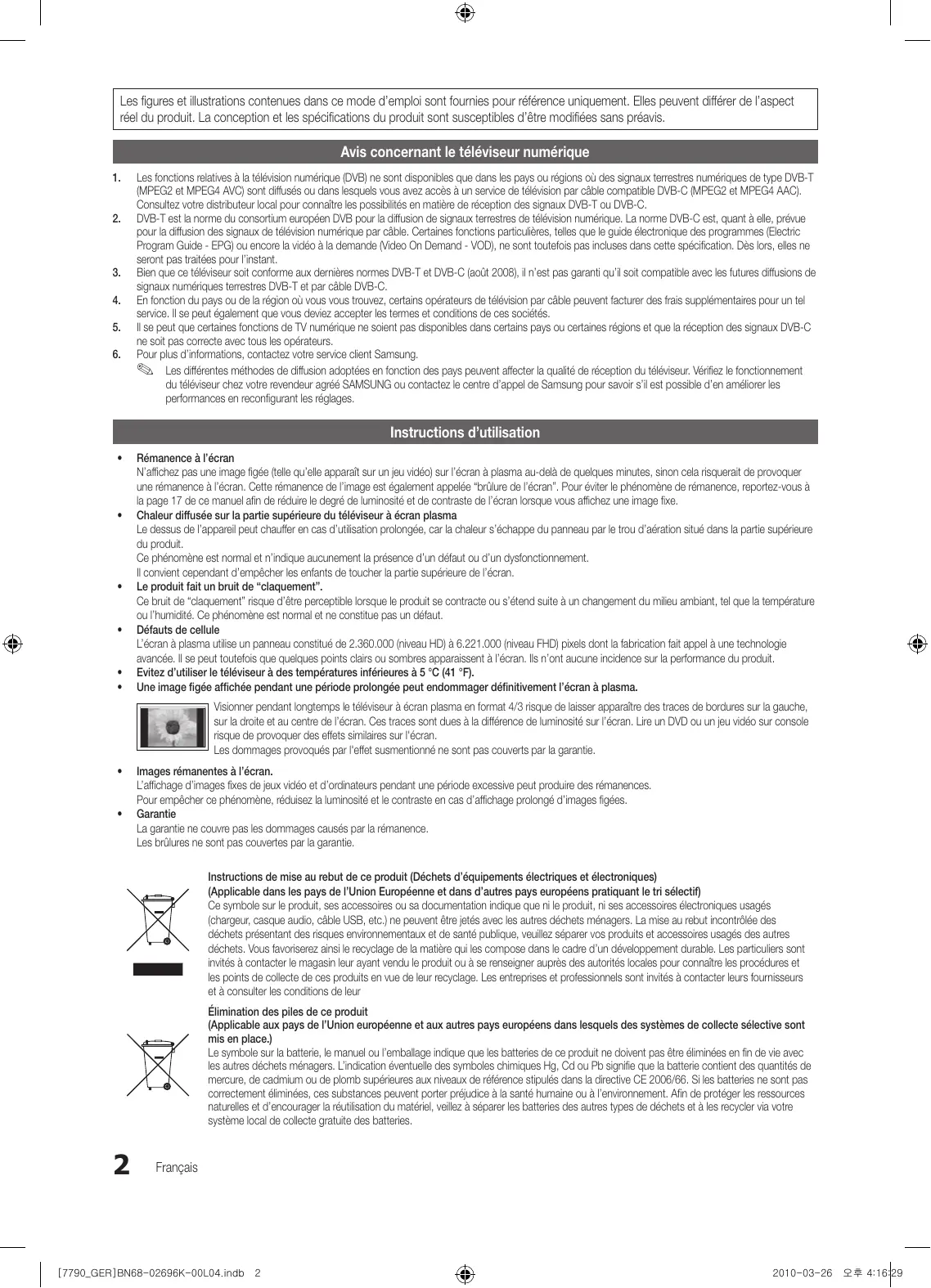 2010-03-26 오후 4:16:29 Les figures et illustrations contenues dans ce mode d’emploi sont fournies pour référence uniquement. Elles peuvent différer de l’aspect réel du produit. La conception et les spécifications du produit sont susceptibles d’être modifiées sans préavis. Avis concernant le téléviseur numérique
