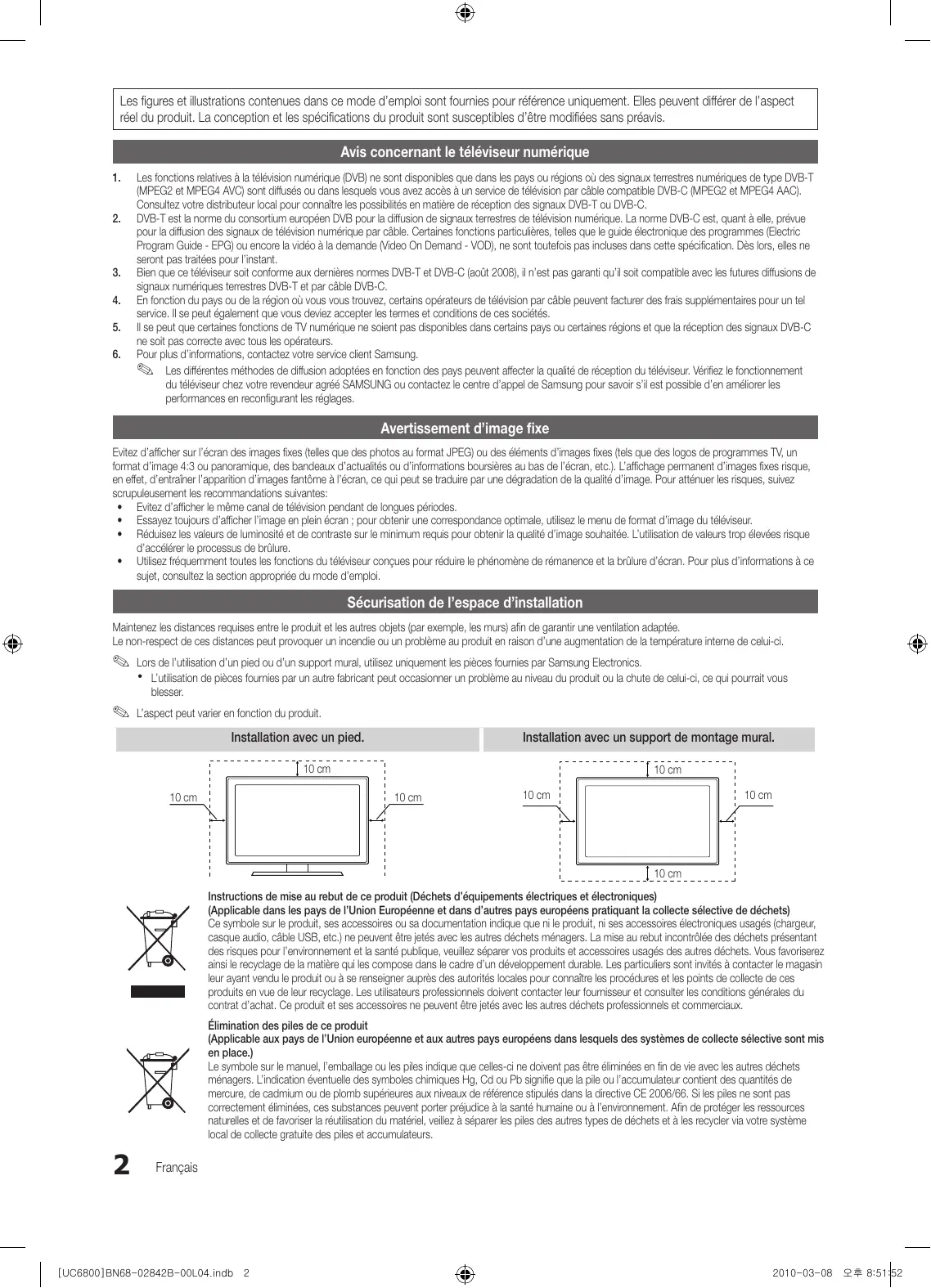 2010-03-08 오후 8:51:51 Les figures et illustrations contenues dans ce mode d’emploi sont fournies pour référence uniquement. Elles peuvent différer de l’aspect réel du produit. La conception et les spécifications du produit sont susceptibles d’être modifiées sans préavis. Avis concernant le téléviseur numérique