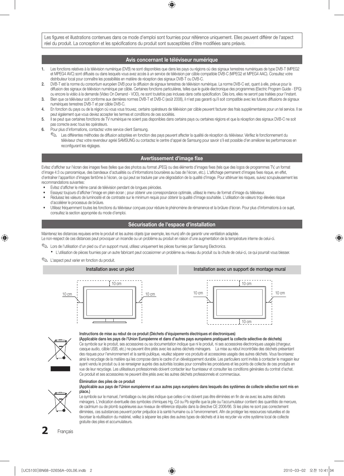 - Utilisez fréquemment toutes les fonctions du téléviseur conçues pour réduire le phénomène de rémanence et la brûlure d'écran. Pour plus d'informations à ce sujet, consultez la section appropriée du mode d'emploi. Sécurisation de l'espace d'installation Maintenez les distances requises entre le produit et les autres objets (par exemple, les murs) afin de garantir une ventilation adaptée. Le non-respect de ces distances peut provoquer un incendie ou un problème au produit en raison d'une augmentation de la température interne de celui-ci. ✎✎ Lors de l'utilisation d'un pied ou d'un support mural, utilisez uniquement les pièces fournies par Samsung Electronics. xx L'utilisation de pièces fournies par un autre fabricant peut occasionner un problème au niveau du produit ou la chute de celui-ci, ce qui pourrait vous blesser. L'aspect peut varier en fonction du produit. Installation avec un pied Installation avec un support de montage mural 10 cm 10 cm 10 cm 10 cm 10 cm 10 cm 10 cm Instructions de mise au rebut de ce produit (Déchets d'équipements électriques et électroniques) (Applicable dans les pays de l'Union Européenne et dans d'autres pays européens pratiquant la collecte sélective de déchets) Ce symbole sur le produit, ses accessoires ou sa documentation indique que ni le produit, ni ses accessoires électroniques usagés (chargeur, casque audio, câble USB, etc.) ne peuvent être jetés avec les autres déchets ménagers. La mise au rebut incontrôlée des déchets présentant des risques pour l'environnement et la santé publique, veuillez séparer vos produits et accessoires usagés des autres déchets. Vous favoriserez ainsi le recyclage de la matière qui les compose dans le cadre d'un développement durable. Les particuliers sont invités à contacter le magasin leur ayant vendu le produit ou à se renseigner auprès des autorités locales pour connaître les procédures et les points de collecte de ces produits en vue de leur recyclage. Les utilisateurs professionnels doivent contacter leur fournisseur et consulter les conditions générales du contrat d'achat. Ce produit et ses accessoires ne peuvent être jetés avec les autres déchets professionnels et commerciaux.