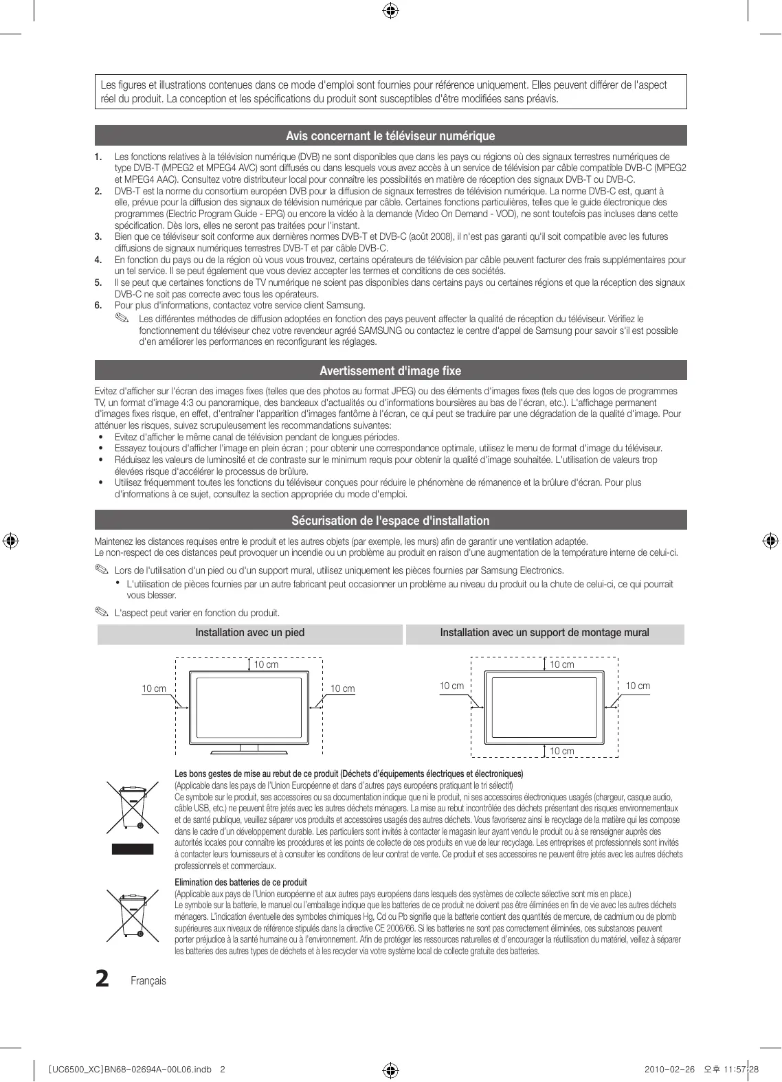- Utilisez fréquemment toutes les fonctions du téléviseur conçues pour réduire le phénomène de rémanence et la brûlure d'écran. Pour plus d'informations à ce sujet, consultez la section appropriée du mode d'emploi. Sécurisation de l'espace d'installation Maintenez les distances requises entre le produit et les autres objets (par exemple, les murs) afin de garantir une ventilation adaptée. Le non-respect de ces distances peut provoquer un incendie ou un problème au produit en raison d'une augmentation de la température interne de celui-ci. ✎✎ Lors de l'utilisation d'un pied ou d'un support mural, utilisez uniquement les pièces fournies par Samsung Electronics. xx L'utilisation de pièces fournies par un autre fabricant peut occasionner un problème au niveau du produit ou la chute de celui-ci, ce qui pourrait vous blesser. ✎✎ L'aspect peut varier en fonction du produit. Installation avec un pied Installation avec un support de montage mural 10 cm 10 cm 10 cm 10 cm 10 cm 10 cm 10 cm Les bons gestes de mise au rebut de ce produit (Déchets d’équipements électriques et électroniques) (Applicable dans les pays de l’Union Européenne et dans d’autres pays européens pratiquant le tri sélectif) Ce symbole sur le produit, ses accessoires ou sa documentation indique que ni le produit, ni ses accessoires électroniques usagés (chargeur, casque audio, câble USB, etc.) ne peuvent être jetés avec les autres déchets ménagers. La mise au rebut incontrôlée des déchets présentant des risques environnementaux et de santé publique, veuillez séparer vos produits et accessoires usagés des autres déchets. Vous favoriserez ainsi le recyclage de la matière qui les compose dans le cadre d’un développement durable. Les particuliers sont invités à contacter le magasin leur ayant vendu le produit ou à se renseigner auprès des autorités locales pour connaître les procédures et les points de collecte de ces produits en vue de leur recyclage. Les entreprises et professionnels sont invités à contacter leurs fournisseurs et à consulter les conditions de leur contrat de vente. Ce produit et ses accessoires ne peuvent être jetés avec les autres déchets professionnels et commerciaux. Elimination des batteries de ce produit (Applicable aux pays de l’Union européenne et aux autres pays européens dans lesquels des systèmes de collecte sélective sont mis en place.) Le symbole sur la batterie, le manuel ou l’emballage indique que les batteries de ce produit ne doivent pas être éliminées en fin de vie avec les autres déchets ménagers. L’indication éventuelle des symboles chimiques Hg, Cd ou Pb signifie que la batterie contient des quantités de mercure, de cadmium ou de plomb supérieures aux niveaux de référence stipulés dans la directive CE 2006/66. Si les batteries ne sont pas correctement éliminées, ces substances peuvent porter préjudice à la santé humaine ou à l’environnement. Afin de protéger les ressources naturelles et d’encourager la réutilisation du matériel, veillez à séparer les batteries des autres types de déchets et à les recycler via votre système local de collecte gratuite des batteries.