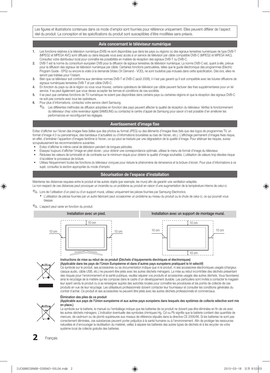 2010-03-18 오전 9:53:02 Les figures et illustrations contenues dans ce mode d’emploi sont fournies pour référence uniquement. Elles peuvent différer de l’aspect réel du produit. La conception et les spécifications du produit sont susceptibles d’être modifiées sans préavis. Avis concernant le téléviseur numérique