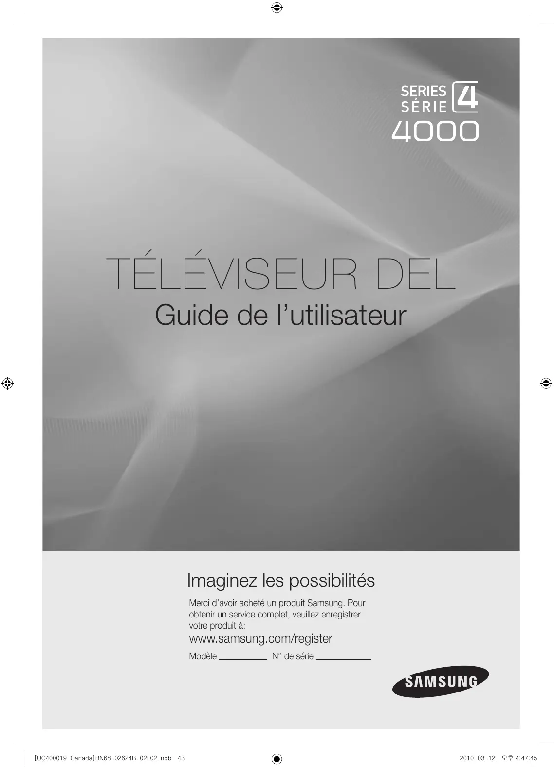 Guide de l’utilisateur Imaginez les possibilités Merci d’avoir acheté un produit Samsung. Pour obtenir un service complet, veuillez enregistrer votre produit à: www.samsung.com/register Modèle [UC400019-Canada]BN68-02624B-02L02.indb 43 N° de série 2010-03-12 오후 4:47:45 Les figures et les illustrations de ce mode d’emploi ne sont fournies qu’à titre de référence. L’apparence réelle du produit pourrait être différente. Le design et les spécifications du produit peuvent être modifiés sans préavis. Remarques importantes sur la garantie relative au format de l'image du téléviseur ✎✎ Voir le bon de garantie pour avoir plus d'information sur les conditions de garantie. Le format écran large des écrans DEL (16:9, soit le rapport hauteur/largeur de l'image) est conçu principalement pour les vidéos plein écran à écran large. Les images affichées devraient être en format écran large 16:9 ou agrandi afin de remplir l'écran si votre modèle offre cette caractéristique et que les images sont constamment en mouvement. L'affichage de graphiques et d'images fixes, comme les barres noires des vidéos et des programmes de télévision en format standard non agrandi doit être limité au maximum à 5 % du temps d'écoute hebdomadaire. De plus, il faut limiter l’affichage d’images et de textes fixes, comme les rapports boursiers, les affichages de jeux vidéo, les logos des stations, les sites Web ou les images graphiques et les schémas des ordinateurs, tel qu'indiqué ci-dessus, et ce pour tous les téléviseurs. L'affichage d'images fixes qui ne respecte pas les directives ci-dessus peut causer un vieillissement inégal des écrans DEL en y créant des images fantômes subtiles mais permanentes. Pour éviter ce problème, faites varier les émissions et les images et regarder principalement des images plein écran en mouvement et non pas des images ou des barres foncées fixes. Dans les modèles d'écran DEL qui offrent des caractéristiques de format d'image, utilisez ces commandes pour obtenir différents formats en plein écran. Prendre garde au choix des formats et à leur durée d'utilisation. Le vieillissement inégal de l’affichage DEL résultant du choix et de l’utilisation d’un format n’est pas couvert par la garantie limitée de Samsung; les images rémanentes en sont également exclues.