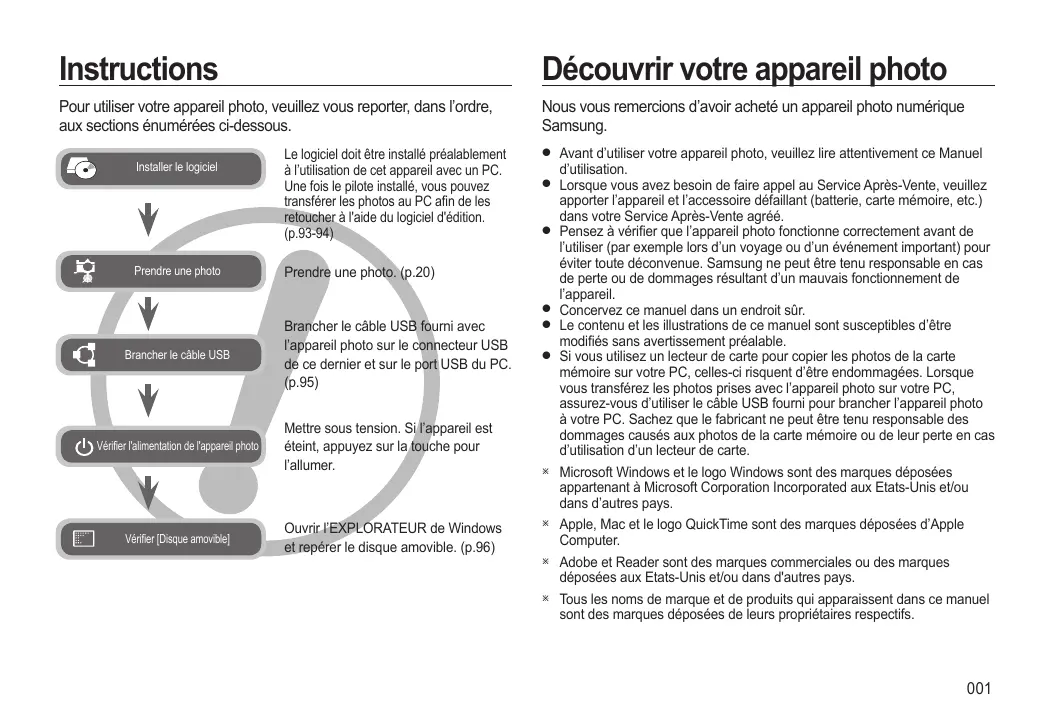 Instructions Découvrir votre appareil photo Pour utiliser votre appareil photo, veuillez vous reporter, dans l’ordre, aux sections énumérées ci-dessous. Nous vous remercions d’avoir acheté un appareil photo numérique Samsung. Installer le logiciel Prendre une photo Brancher le câble USB Vérifier l'alimentation de l'appareil photo Vérifier [Disque amovible] Le logiciel doit être installé préalablement à l’utilisation de cet appareil avec un PC. Une fois le pilote installé, vous pouvez transférer les photos au PC afin de les retoucher à l'aide du logiciel d'édition. (p.93-94) Prendre une photo. (p.20) Brancher le câble USB fourni avec l’appareil photo sur le connecteur USB de ce dernier et sur le port USB du PC. (p.95) Mettre sous tension. Si l’appareil est éteint, appuyez sur la touche pour l’allumer. Ouvrir l’EXPLORATEUR de Windows et repérer le disque amovible. (p.96) Avant d’utiliser votre appareil photo, veuillez lire attentivement ce Manuel d’utilisation. Lorsque vous avez besoin de faire appel au Service Après-Vente, veuillez apporter l’appareil et l’accessoire défaillant (batterie, carte mémoire, etc.) dans votre Service Après-Vente agréé. Pensez à vérifier que l’appareil photo fonctionne correctement avant de l’utiliser (par exemple lors d’un voyage ou d’un événement important) pour éviter toute déconvenue. Samsung ne peut être tenu responsable en cas de perte ou de dommages résultant d’un mauvais fonctionnement de l’appareil. Concervez ce manuel dans un endroit sûr. Le contenu et les illustrations de ce manuel sont susceptibles d’être modifiés sans avertissement préalable. Si vous utilisez un lecteur de carte pour copier les photos de la carte mémoire sur votre PC, celles-ci risquent d’être endommagées. Lorsque vous transférez les photos prises avec l’appareil photo sur votre PC, assurez-vous d’utiliser le câble USB fourni pour brancher l’appareil photo à votre PC. Sachez que le fabricant ne peut être tenu responsable des dommages causés aux photos de la carte mémoire ou de leur perte en cas d’utilisation d’un lecteur de carte. Microsoft Windows et le logo Windows sont des marques déposées appartenant à Microsoft Corporation Incorporated aux Etats-Unis et/ou dans d’autres pays. Apple, Mac et le logo QuickTime sont des marques déposées d’Apple Computer. Adobe et Reader sont des marques commerciales ou des marques déposées aux Etats-Unis et/ou dans d'autres pays. Tous les noms de marque et de produits qui apparaissent dans ce manuel sont des marques déposées de leurs propriétaires respectifs.