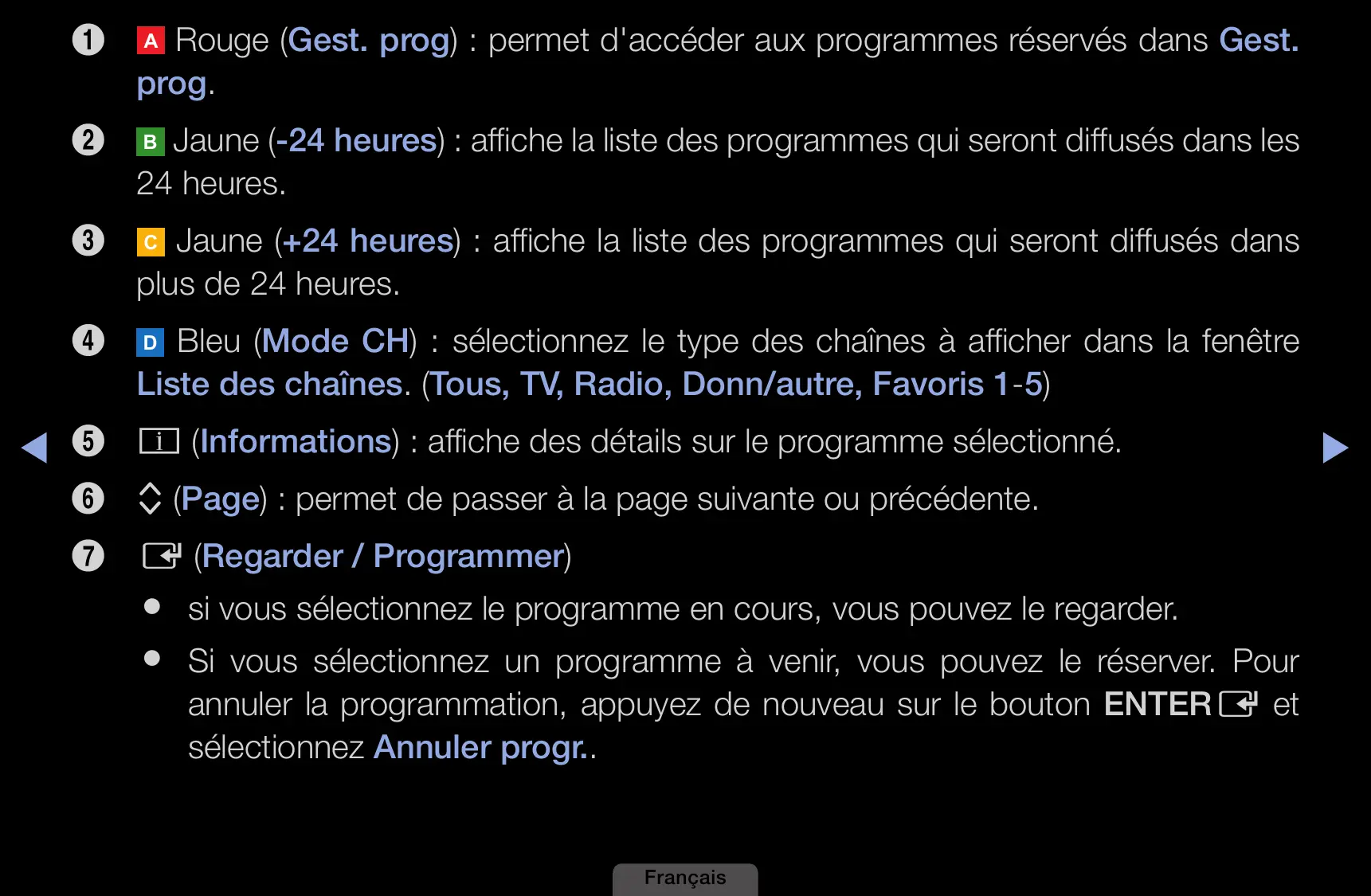 ◀ 5 j (Informations) : affiche des détails sur le programme sélectionné. 6 k (Page) : permet de passer à la page suivante ou précédente. 7 E (Regarder / Programmer) ●● si vous sélectionnez le programme en cours, vous pouvez le regarder. ●● Si vous sélectionnez un programme à venir, vous pouvez le réserver. Pour annuler la programmation, appuyez de nouveau sur le bouton ENTERE et sélectionnez Annuler progr.. Français