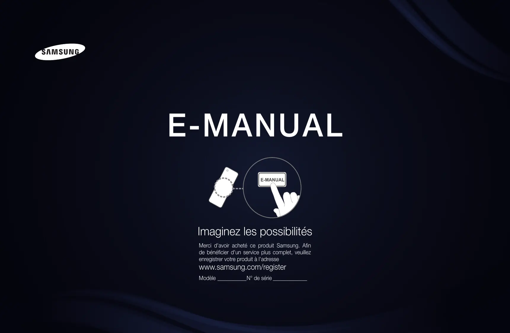 E-MANUAL Imaginez les possibilités Merci d'avoir acheté ce produit Samsung. Afin de bénéficier d'un service plus complet, veuillez enregistrer votre produit à l'adresse www.samsung.com/register Modèle____________N° de série______________ Contenu