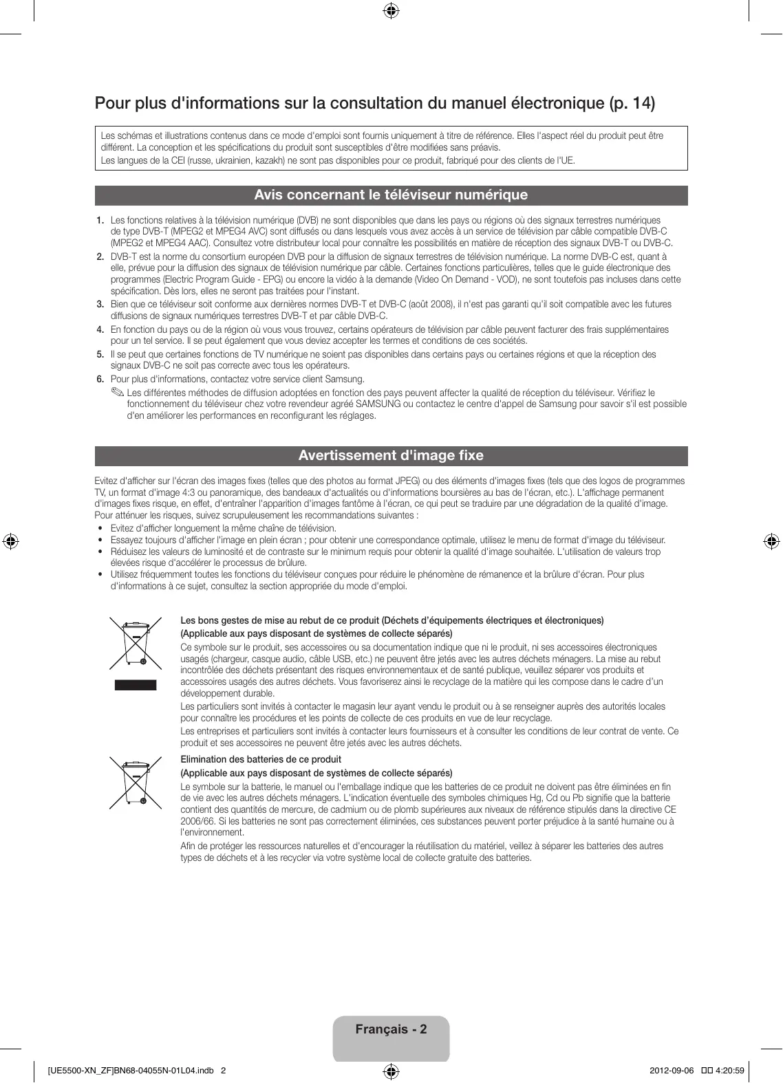 • • This equipment may be operated in all EU countries. English - 23 [UE5500-XN_ZF]BN68-04055N-01L04.indb 23 2012-09-06 4:20:59 Pour plus d'informations sur la consultation du manuel électronique (p. 14) Les schémas et illustrations contenus dans ce mode d'emploi sont fournis uniquement à titre de référence. Elles l'aspect réel du produit peut être différent. La conception et les spécifications du produit sont susceptibles d'être modifiées sans préavis. Les langues de la CEI (russe, ukrainien, kazakh) ne sont pas disponibles pour ce produit, fabriqué pour des clients de l'UE. Avis concernant le téléviseur numérique 1. Les fonctions relatives à la télévision numérique (DVB) ne sont disponibles que dans les pays ou régions où des signaux terrestres numériques de type DVB-T (MPEG2 et MPEG4 AVC) sont diffusés ou dans lesquels vous avez accès à un service de télévision par câble compatible DVB-C (MPEG2 et MPEG4 AAC). Consultez votre distributeur local pour connaître les possibilités en matière de réception des signaux DVB-T ou DVB-C. 2. DVB-T est la norme du consortium européen DVB pour la diffusion de signaux terrestres de télévision numérique. La norme DVB-C est, quant à elle, prévue pour la diffusion des signaux de télévision numérique par câble. Certaines fonctions particulières, telles que le guide électronique des programmes (Electric Program Guide - EPG) ou encore la vidéo à la demande (Video On Demand - VOD), ne sont toutefois pas incluses dans cette spécification. Dès lors, elles ne seront pas traitées pour l'instant. 3. Bien que ce téléviseur soit conforme aux dernières normes DVB-T et DVB-C (août 2008), il n'est pas garanti qu'il soit compatible avec les futures diffusions de signaux numériques terrestres DVB-T et par câble DVB-C. 4. En fonction du pays ou de la région où vous vous trouvez, certains opérateurs de télévision par câble peuvent facturer des frais supplémentaires pour un tel service. Il se peut également que vous deviez accepter les termes et conditions de ces sociétés. 5. Il se peut que certaines fonctions de TV numérique ne soient pas disponibles dans certains pays ou certaines régions et que la réception des signaux DVB-C ne soit pas correcte avec tous les opérateurs.