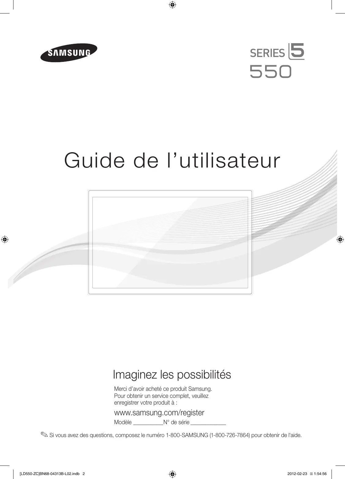 2012-02-23 1:54:55 Guide de l’utilisateur Imaginez les possibilités Merci d’avoir acheté ce produit Samsung. Pour obtenir un service complet, veuillez enregistrer votre produit à : www.samsung.com/register Modèle____________N° de série______________ ✎✎Si vous avez des questions, composez le numéro 1-800-SAMSUNG (1-800-726-7864) pour obtenir de l'aide. [LD550-ZC]BN68-04313B-L02.indb 2 2012-02-23 1:54:56 Les figures et les illustrations de ce mode d’emploi ne sont fournies qu’à titre de référence. L’apparence réelle du produit pourrait être différente. Le design et les spécifications du produit peuvent être modifiés sans préavis. Remarques importantes sur la garantie relative au format de l'image du téléviseur ✎✎ Voir le bon de garantie pour avoir plus d'information sur les conditions de garantie. Le format écran large des écrans ACL (16:9, soit le rapport hauteur/largeur de l’image) est conçu principalement pour les vidéos plein écran à écran large. Les images affichées devraient être en format écran large 16:9 ou agrandi afin de remplir l'écran si votre modèle offre cette caractéristique et que les images sont constamment en mouvement. L'affichage de graphiques et d'images fixes, comme les barres noires des vidéos et des programmes de télévision en format standard non agrandi doit être limité au maximum à 5 % du temps d'écoute hebdomadaire. De plus, il faut limiter l’affichage d’images et de textes fixes, comme les rapports boursiers, les affichages de jeux vidéo, les logos des stations, les sites Web ou les images graphiques et les schémas des ordinateurs, tel qu'indiqué ci-dessus, et ce pour tous les téléviseurs. L'affichage d'images fixes qui ne respecte pas les directives ci-dessus peut causer un vieillissement inégal des écrans ACL en y créant des images fantômes subtiles mais permanentes. Pour éviter ce problème, faites varier les émissions et les images et regarder principalement des images plein écran en mouvement et non pas des images ou des barres foncées fixes. Dans les modèles d'écran à plasma qui offrent des caractéristiques de format d'image, utiliser ces commandes pour obtenir différents formats en plein écran. Prendre garde au choix des formats et à leur durée d'utilisation. Un vieillissement inégal résultant du choix et de l’utilisation d’un format, tout comme les images rémanentes, ne sont pas couverts par la garantie limitée de Samsung.