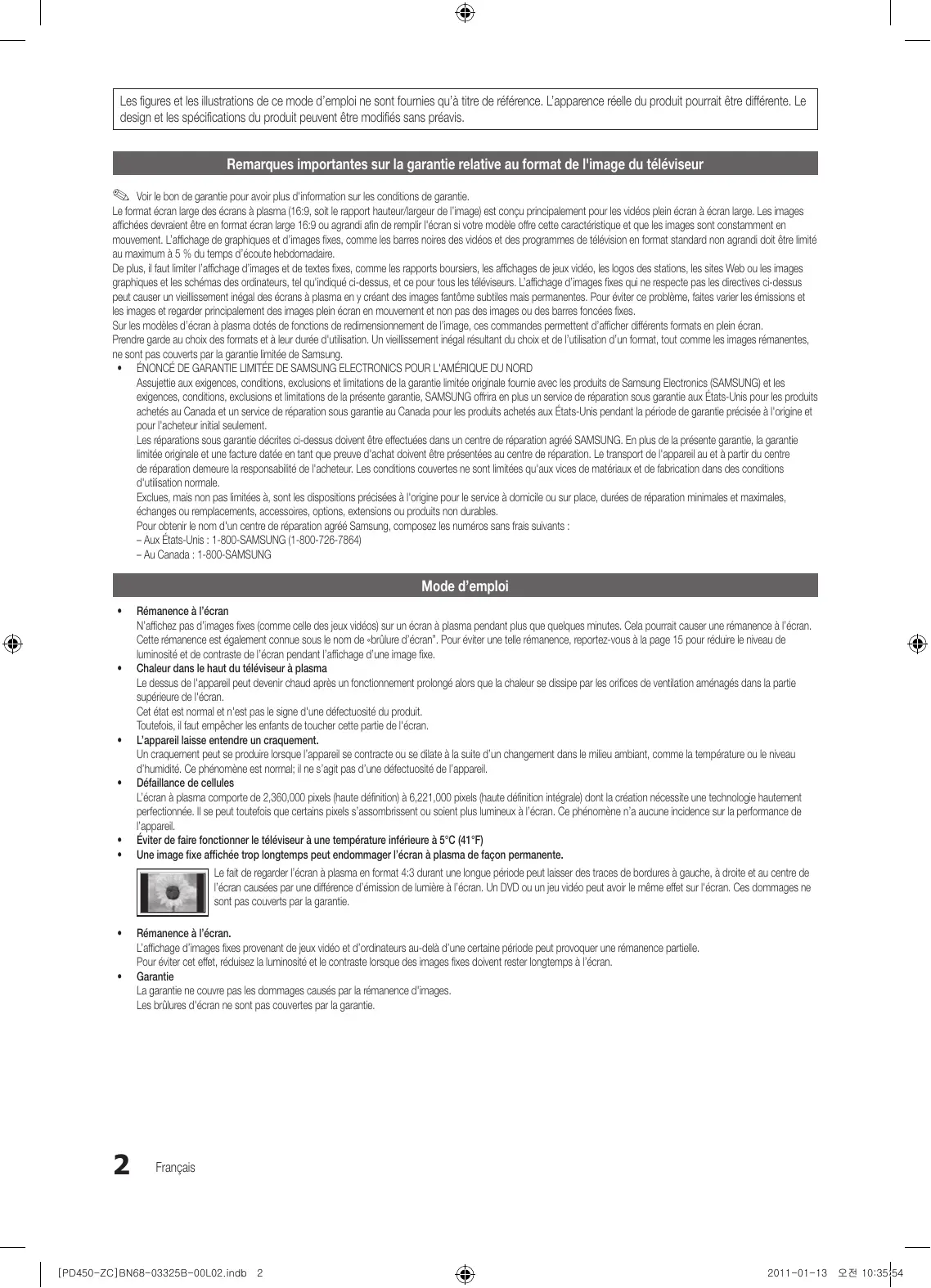 English [PD450-ZC]BN68-03325B-00L02.indb 38 2011-01-13 오전 10:35:54 Les figures et les illustrations de ce mode d’emploi ne sont fournies qu’à titre de référence. L’apparence réelle du produit pourrait être différente. Le design et les spécifications du produit peuvent être modifiés sans préavis. Remarques importantes sur la garantie relative au format de l'image du téléviseur ✎✎ Voir le bon de garantie pour avoir plus d'information sur les conditions de garantie. Le format écran large des écrans à plasma (16:9, soit le rapport hauteur/largeur de l’image) est conçu principalement pour les vidéos plein écran à écran large. Les images affichées devraient être en format écran large 16:9 ou agrandi afin de remplir l'écran si votre modèle offre cette caractéristique et que les images sont constamment en mouvement. L’affichage de graphiques et d’images fixes, comme les barres noires des vidéos et des programmes de télévision en format standard non agrandi doit être limité au maximum à 5 % du temps d’écoute hebdomadaire. De plus, il faut limiter l’affichage d’images et de textes fixes, comme les rapports boursiers, les affichages de jeux vidéo, les logos des stations, les sites Web ou les images graphiques et les schémas des ordinateurs, tel qu'indiqué ci-dessus, et ce pour tous les téléviseurs. L’affichage d’images fixes qui ne respecte pas les directives ci-dessus peut causer un vieillissement inégal des écrans à plasma en y créant des images fantôme subtiles mais permanentes. Pour éviter ce problème, faites varier les émissions et les images et regarder principalement des images plein écran en mouvement et non pas des images ou des barres foncées fixes. Sur les modèles d’écran à plasma dotés de fonctions de redimensionnement de l’image, ces commandes permettent d’afficher différents formats en plein écran. Prendre garde au choix des formats et à leur durée d'utilisation. Un vieillissement inégal résultant du choix et de l’utilisation d’un format, tout comme les images rémanentes, ne sont pas couverts par la garantie limitée de Samsung.