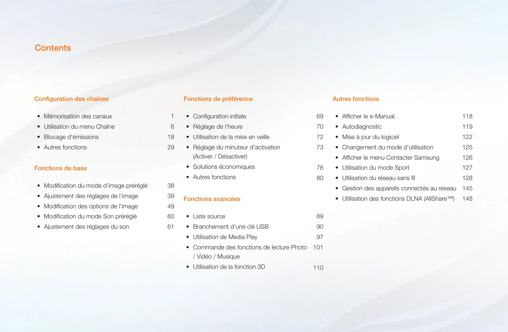 Contents Configuration des chaînes Fonctions de préférence Autres fonctions