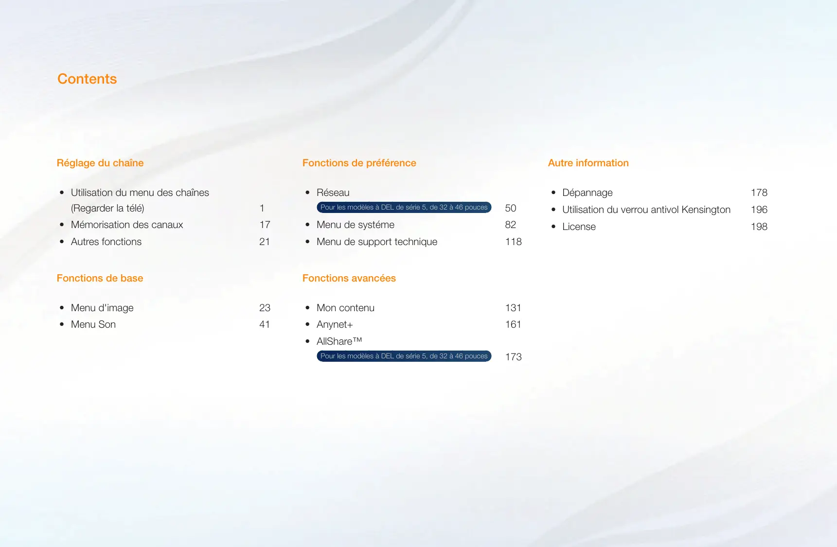 Fonctions de base Pour les modèles à DEL de série 5, de 32 à 46 pouces Fonctions avancées