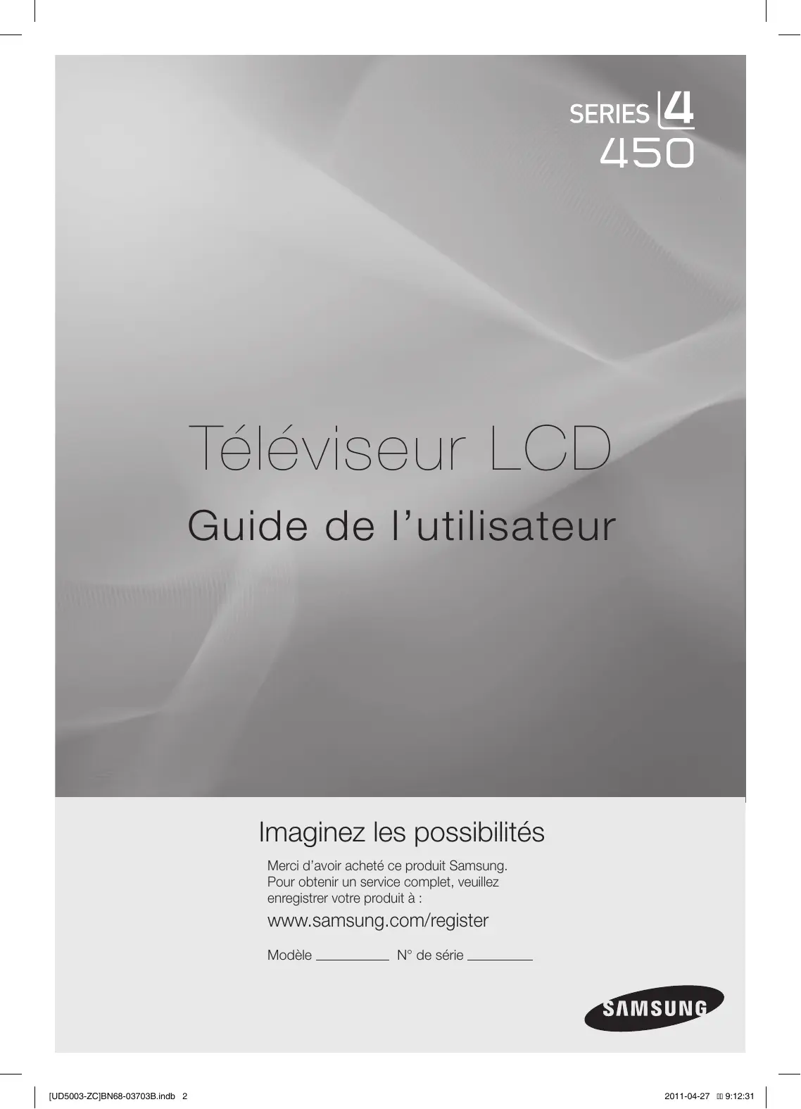 2011-04-27 9:12:31 Téléviseur LCD Guide de l’utilisateur Imaginez les possibilités Merci d’avoir acheté ce produit Samsung. Pour obtenir un service complet, veuillez enregistrer votre produit à : www.samsung.com/register Modèle [UD5003-ZC]BN68-03703B.indb 2 N° de série 2011-04-27 9:12:31 Les figures et les illustrations de ce mode d’emploi ne sont fournies qu’à titre de référence. L’apparence réelle du produit pourrait être différente. Le design et les spécifications du produit peuvent être modifiés sans préavis. Remarques importantes sur la garantie relative au format de l'image du téléviseur ✎✎ Voir le bon de garantie pour avoir plus d'information sur les conditions de garantie. Le format écran large des écrans ACL/DEL (16:9, soit le rapport hauteur/largeur de l’image) est conçu principalement pour les vidéos plein écran à écran large. Les images affichées devraient être en format écran large 16:9 ou agrandi afin de remplir l'écran si votre modèle offre cette caractéristique et que les images sont constamment en mouvement. L'affichage de graphiques et d'images fixes, comme les barres noires des vidéos et des programmes de télévision en format standard non agrandi doit être limité au maximum à 5 % du temps d'écoute hebdomadaire. De plus, il faut limiter l’affichage d’images et de textes fixes, comme les rapports boursiers, les affichages de jeux vidéo, les logos des stations, les sites Web ou les images graphiques et les schémas des ordinateurs, tel qu'indiqué ci-dessus, et ce pour tous les téléviseurs. L'affichage d'images fixes qui ne respecte pas les directives ci-dessus peut causer un vieillissement inégal des écrans ACL/DEL en y créant des images fantômes subtiles mais permanentes. Pour éviter ce problème, faites varier les émissions et les images et regarder principalement des images plein écran en mouvement et non pas des images ou des barres foncées fixes. Dans les modèles d'écran à plasma qui offrent des caractéristiques de format d'image, utiliser ces commandes pour obtenir différents formats en plein écran. Prendre garde au choix des formats et à leur durée d'utilisation. Un vieillissement inégal résultant du choix et de l’utilisation d’un format, tout comme les images rémanentes, ne sont pas couverts par la garantie limitée de Samsung.